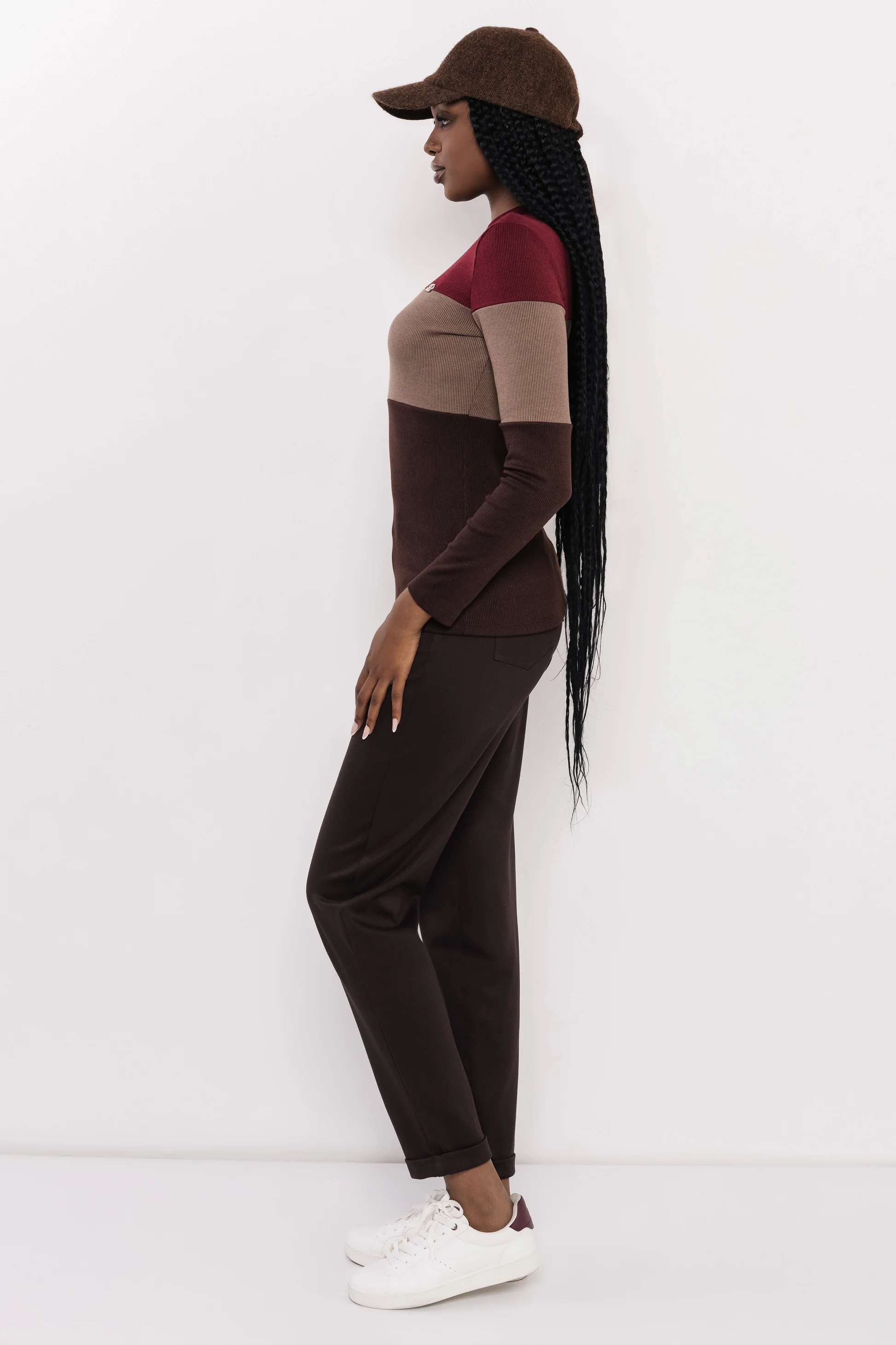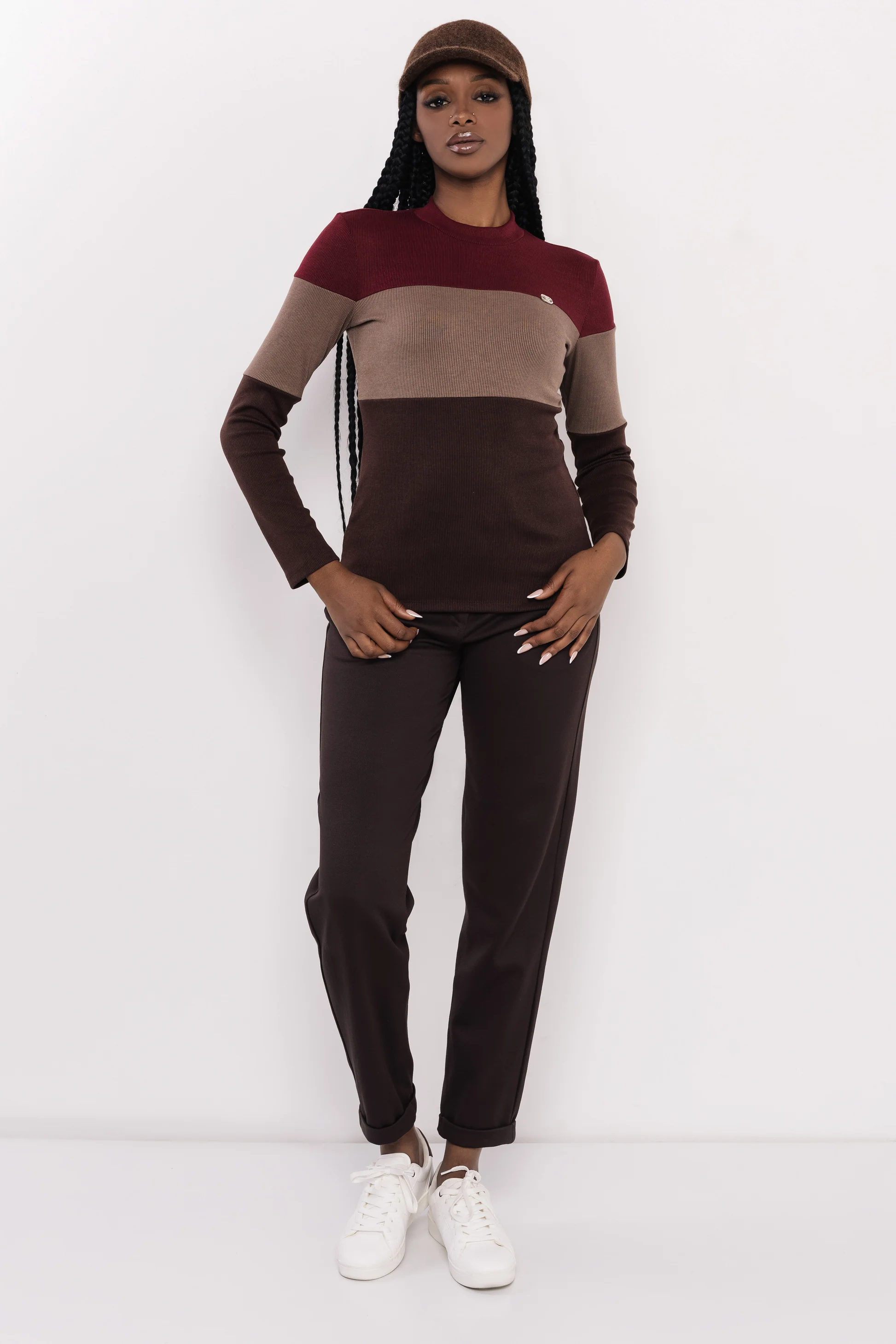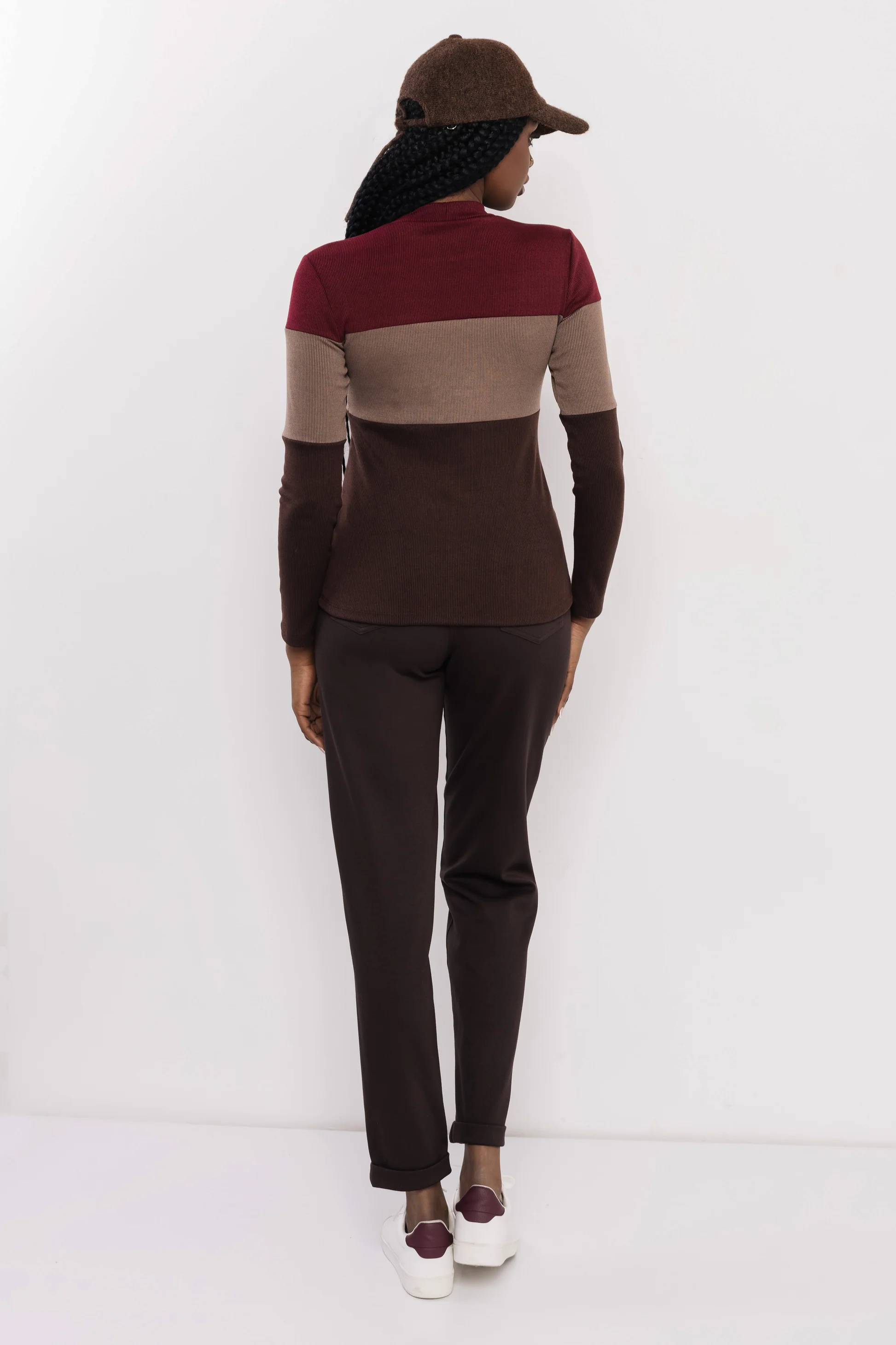 Az AMNESIA Alziza felső komfortos és trendi választás a szezonra. Bordás kötött anyaga rugalmas és kellemes tapintású, a három tónus – bordó, csokibarna és fekete – pedig karakteres, mégis harmonikus megjelenést ad.