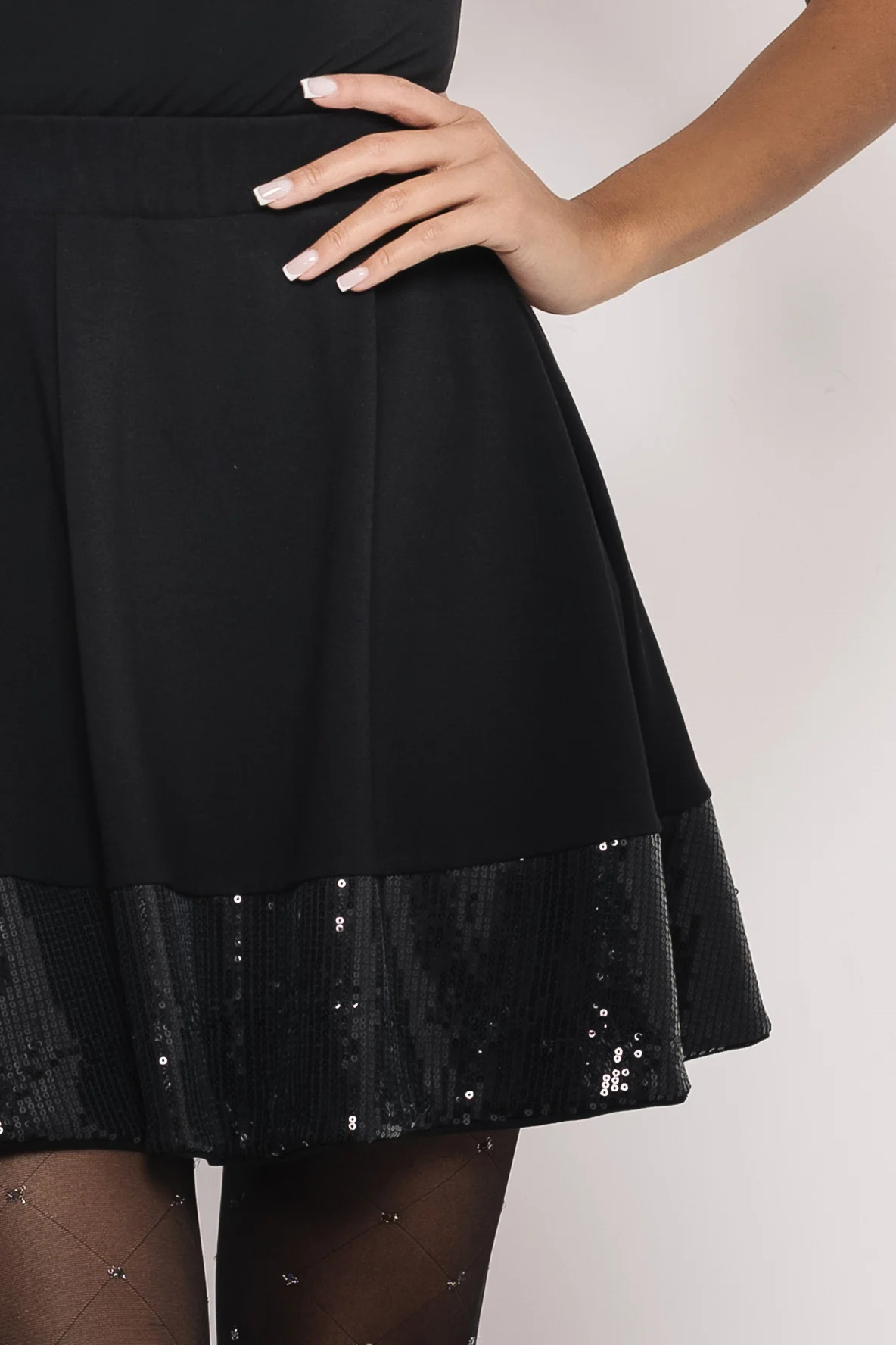 A punto és flitter kombinációja könnyed esést biztosít: a felső része letisztult, a szegélyen futó flitterpanel pedig elegáns fényt visz minden mozdulatba. Az egyméretes kialakítás szépen alkalmazkodik a derékhoz, a fazon pedig játékos, nőies sziluettet eredményez, ami sokféle alkaton jól mutat.