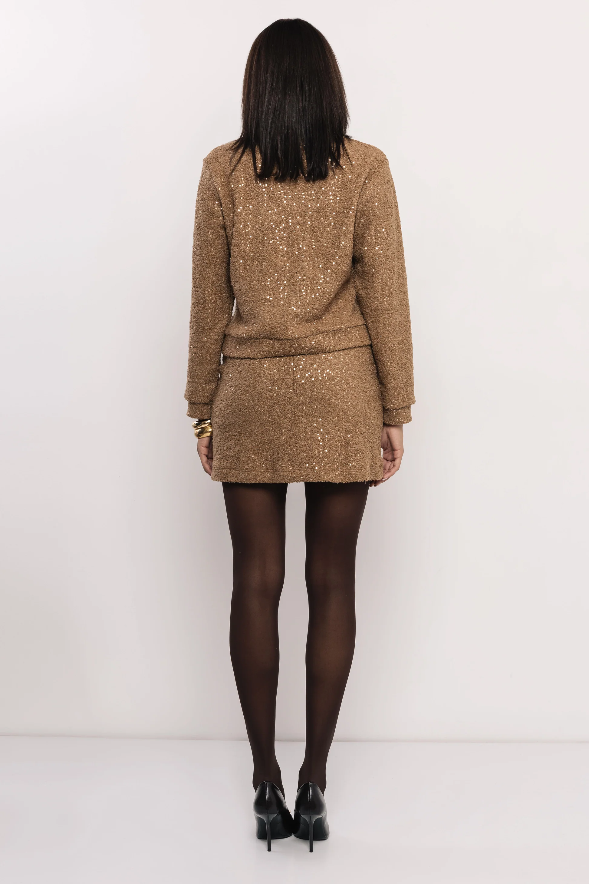 A flitteres buklé anyag puha, rugalmas és szépen követi a vonalakat, miközben megtartja a miniszoknya játékos fazonját. Egyméretű kialakítása rugalmas derékkal és kellemes tapintású anyagával kényelmessé teszi a viselést egész estére. A drapp árnyalat különlegesen elegáns, és szépen harmonizál feketével, arannyal vagy akár kontrasztos, mélyebb tónusokkal is.