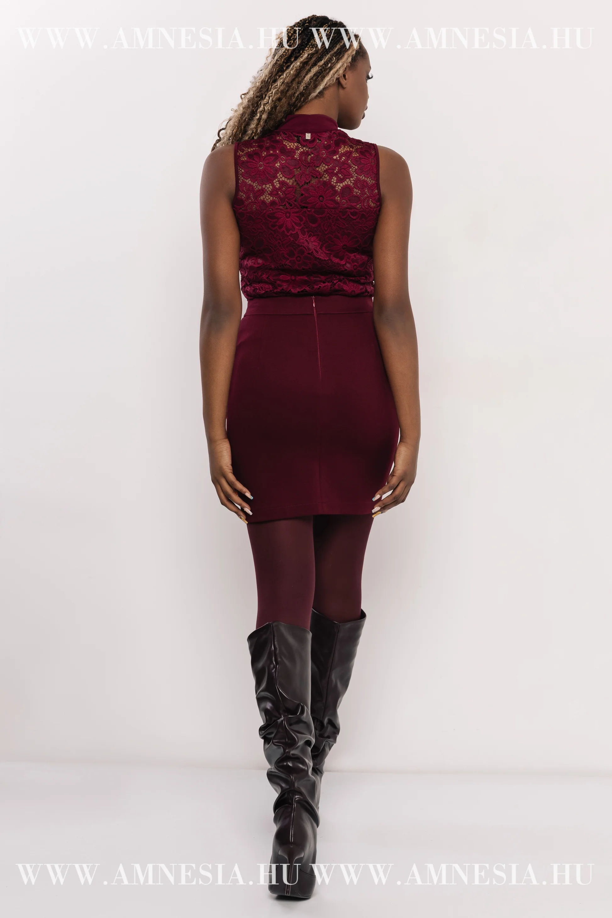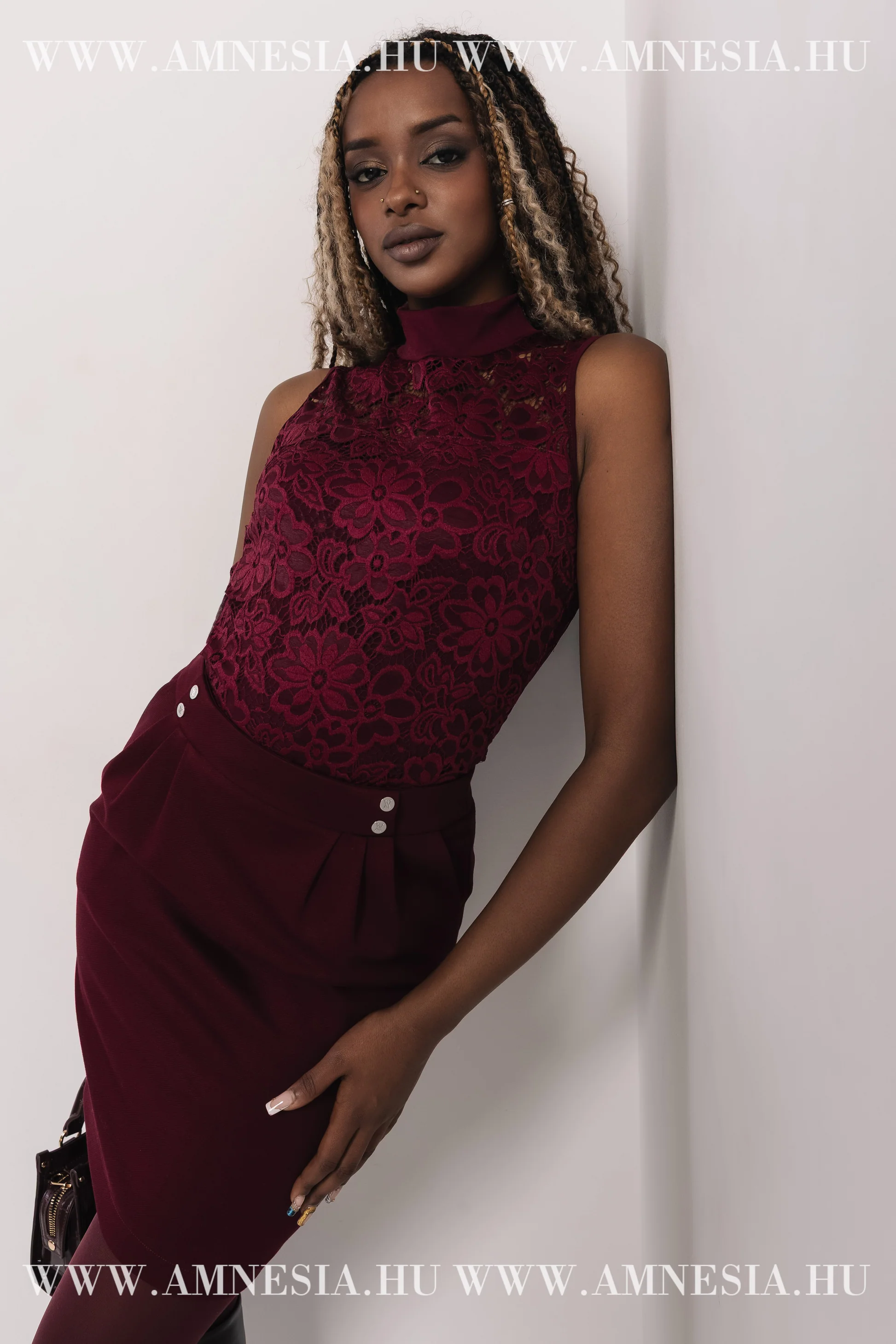Az AMNESIA Hanzi felső igazi alkalmi darab, amely a csipke gazdag mintájával és ujjatlan kialakításával hangsúlyos, mégis letisztult megjelenést ad. Bordó színe elegáns és karakteres, tökéletes választás ünnepekre, vacsorákhoz vagy különleges alkalmakra.