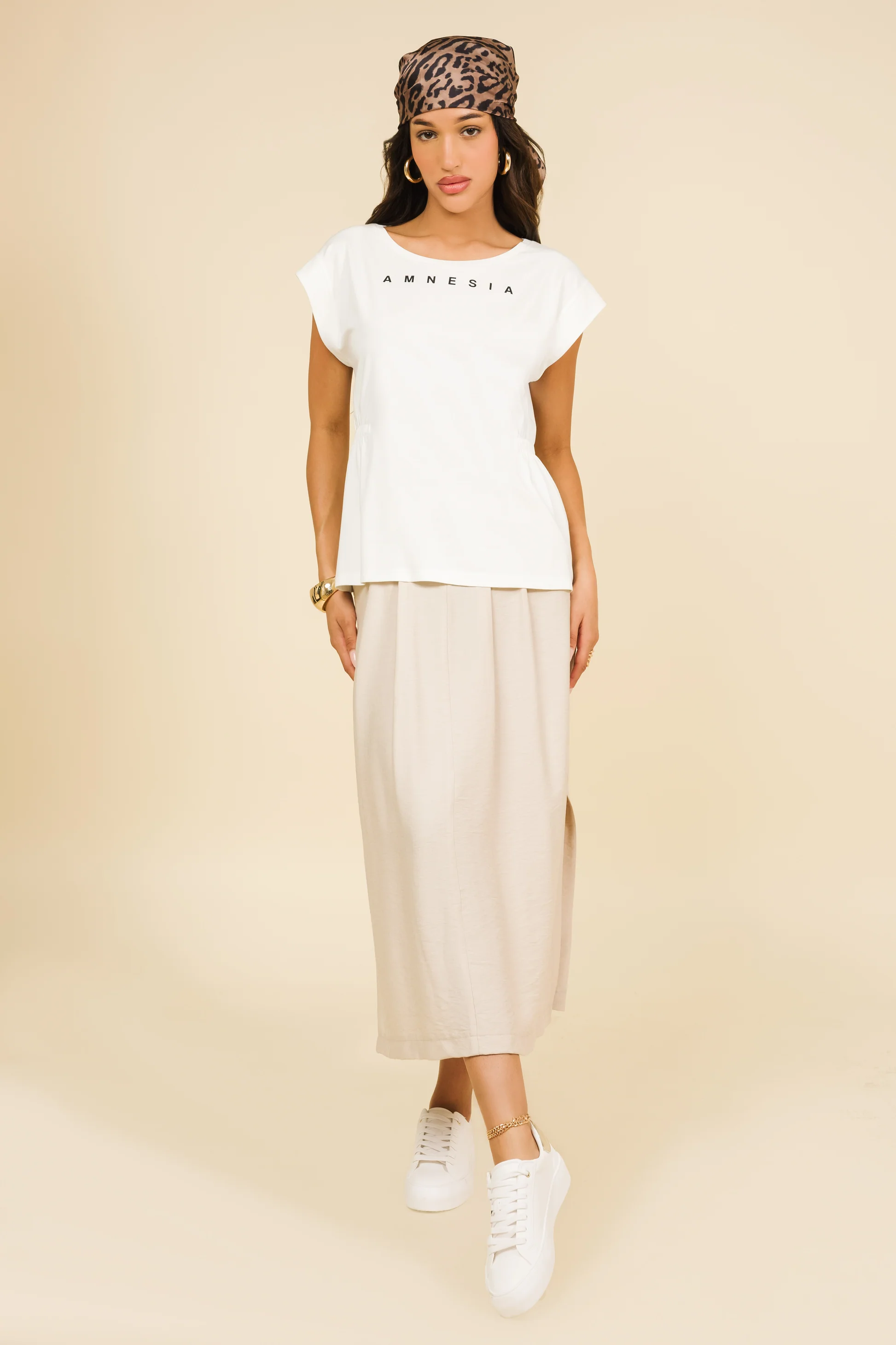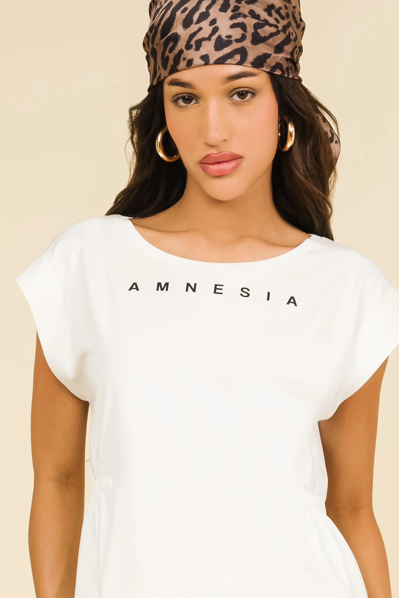 Az AMNESIA Kerolin felső könnyed, vékony punto anyagból készült, amely kellemes, szellős viseletet biztosít. A kerek nyakkivágás és a finoman lezser, cap-ujjas fazon modern, mégis kényelmes vonalat ad, míg a mellrészen elhelyezett AMNESIA nyomás egyedi, letisztult részlet. Hordhatod magasderekú farmerral hétköznapokra, de egy midi szoknyával és papuccsal igazi városi chic lesz belőle. Elérhető finom babarózsa, natúr bézs, klasszikus ekrü és időtálló fekete árnyalatban – válogass kedvedre , és rendeld házhoz villámgyorsan!