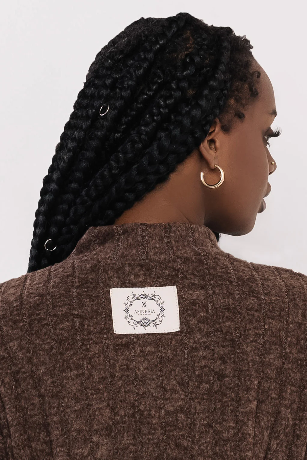 Az AMNESIA Mietta ruha bordás kötött anyagból készült, amely kényelmes viseletet biztosít és lágyan követi a test vonalait. A magasított nyakrész és az enyhén ejtett vállvonal modern, visszafogott eleganciát sugall, míg a minihossz játékos, fiatalos hatást ad. Fekete és csokibarna színben is elérhető, hogy mindig a hangulatodhoz illőt választhasd.