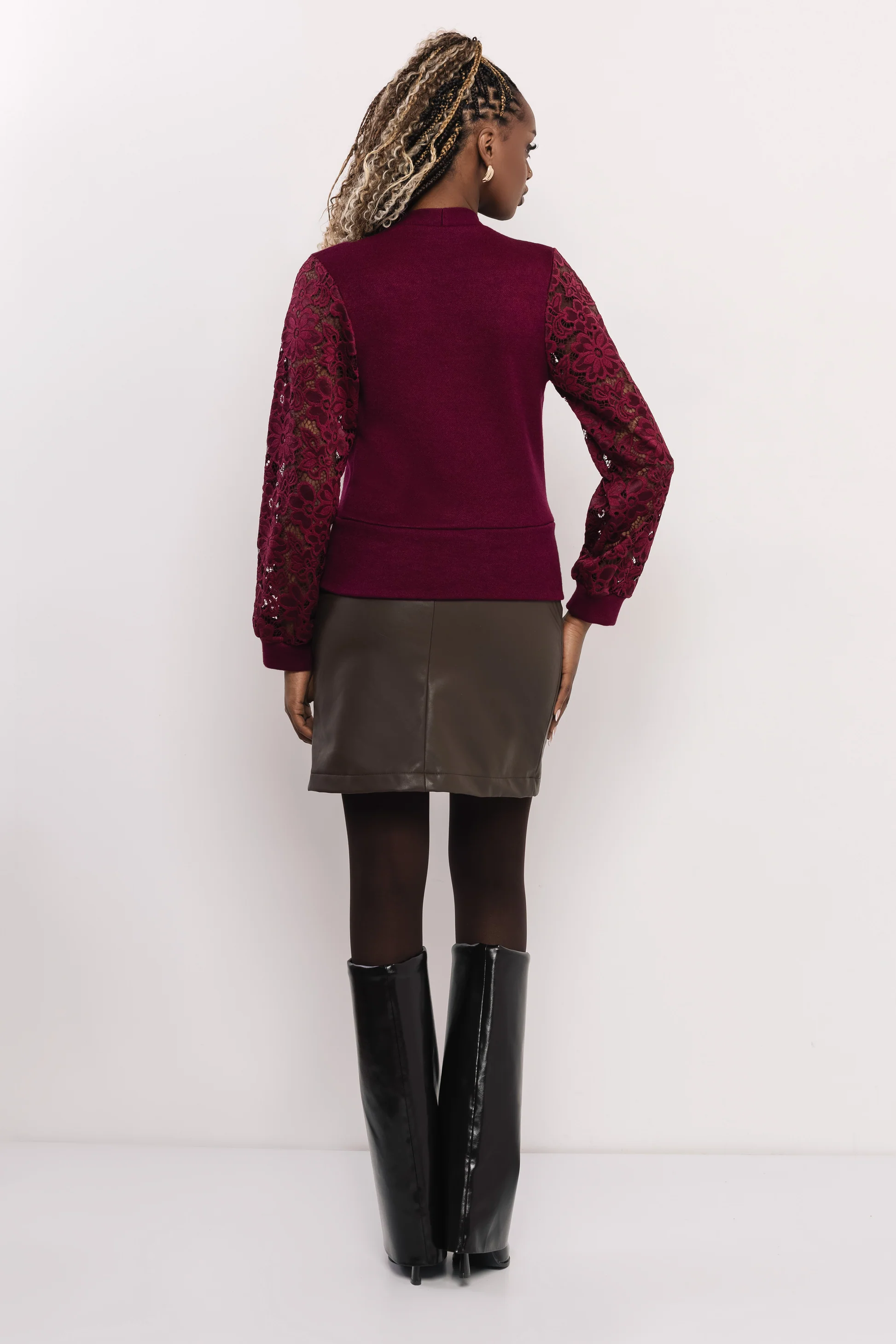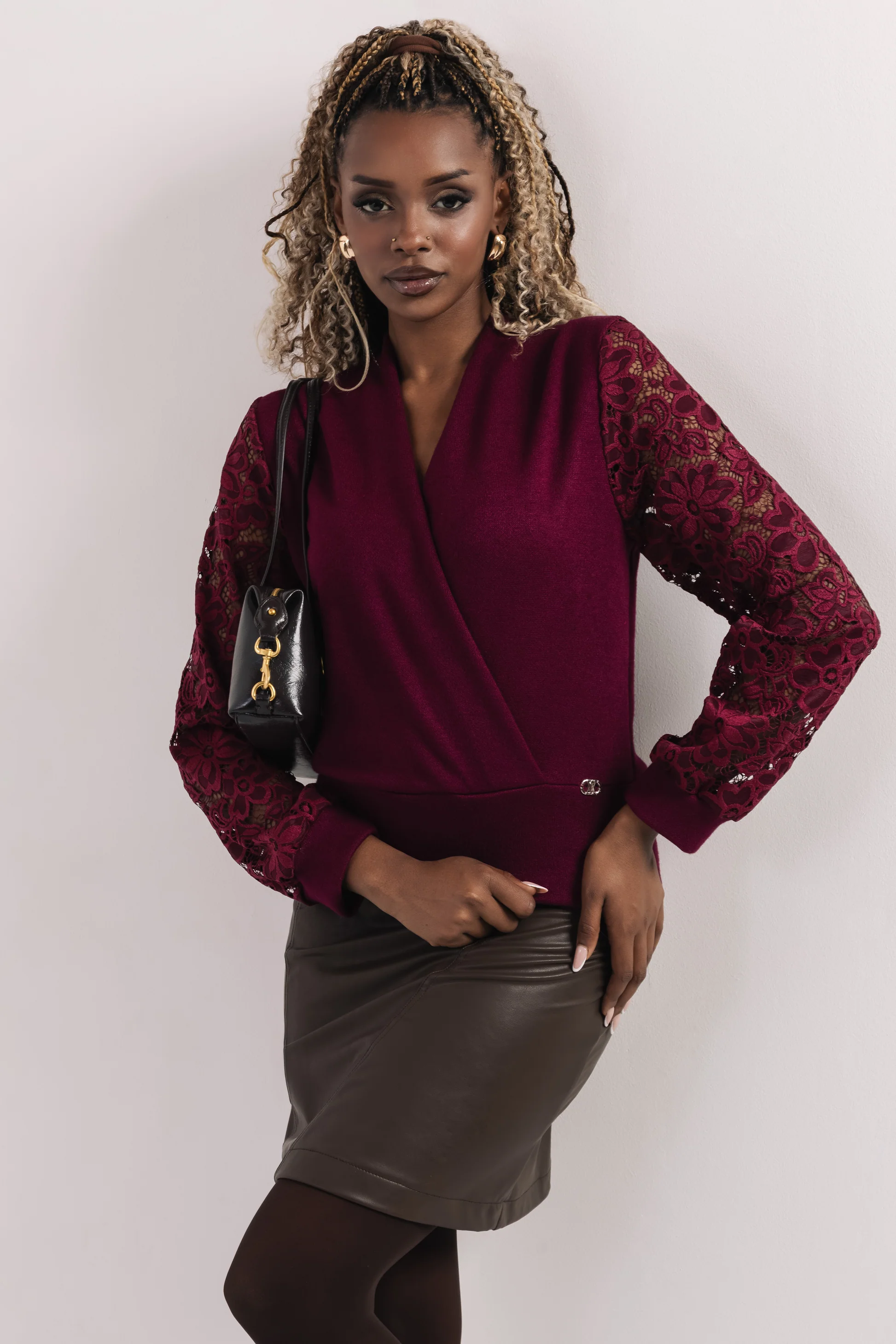 A fazon átlapolt, V-kivágású, amely szépen formálja a dekoltázst és optikailag nyújtja a felsőtestet. A kötött anyag kényelmesen simul, míg a hosszú, csipkeujjak díszes mintája könnyed eleganciát visz a megjelenésbe. Az egyméretes kialakítás rugalmas viseletet ad több alkaton is.