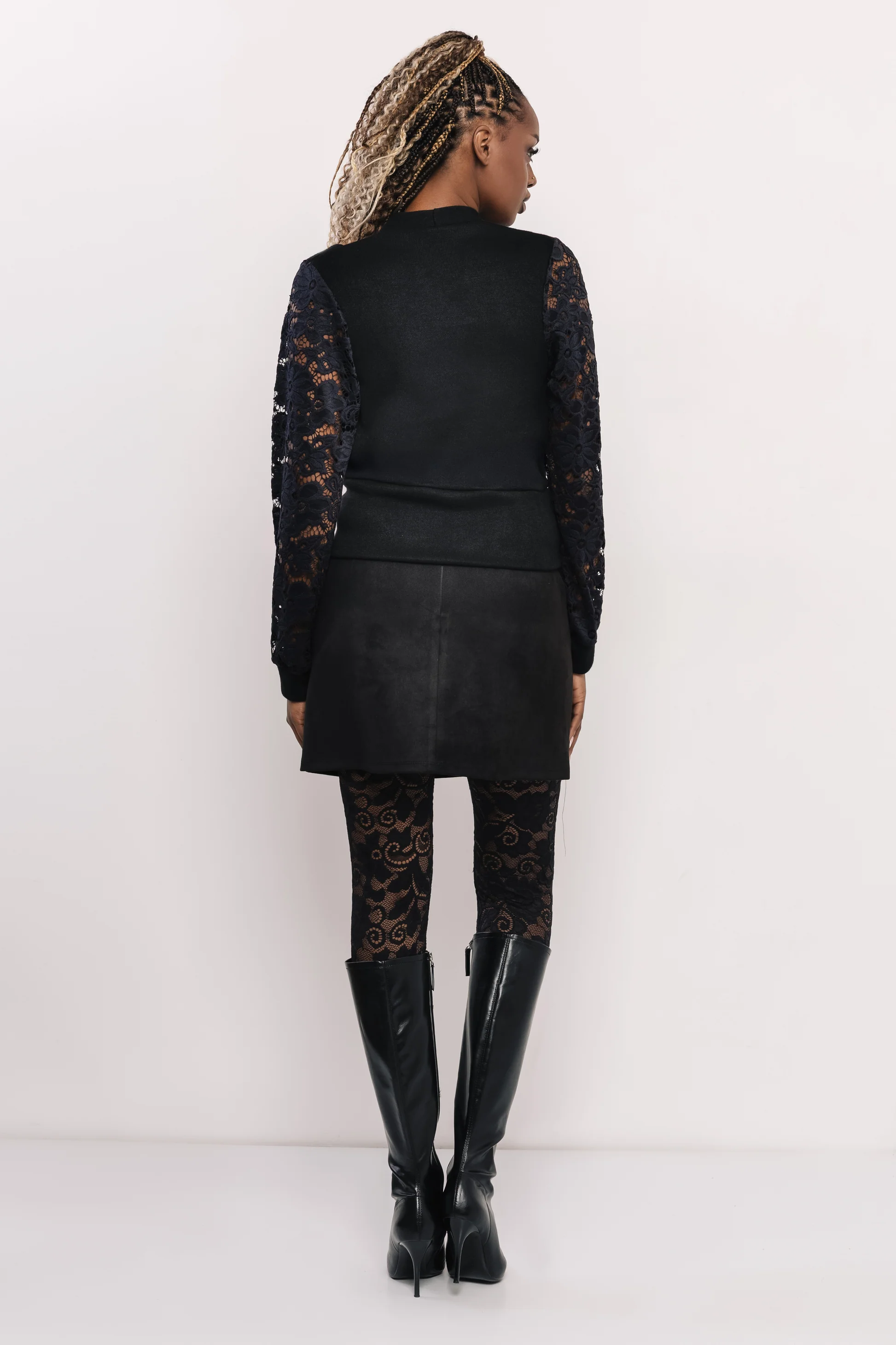 A fazon átlapolt, V-kivágású, amely szépen formálja a dekoltázst és optikailag nyújtja a felsőtestet. A kötött anyag kényelmesen simul, míg a hosszú, csipkeujjak díszes mintája könnyed eleganciát visz a megjelenésbe. Az egyméretes kialakítás rugalmas viseletet ad több alkaton is.