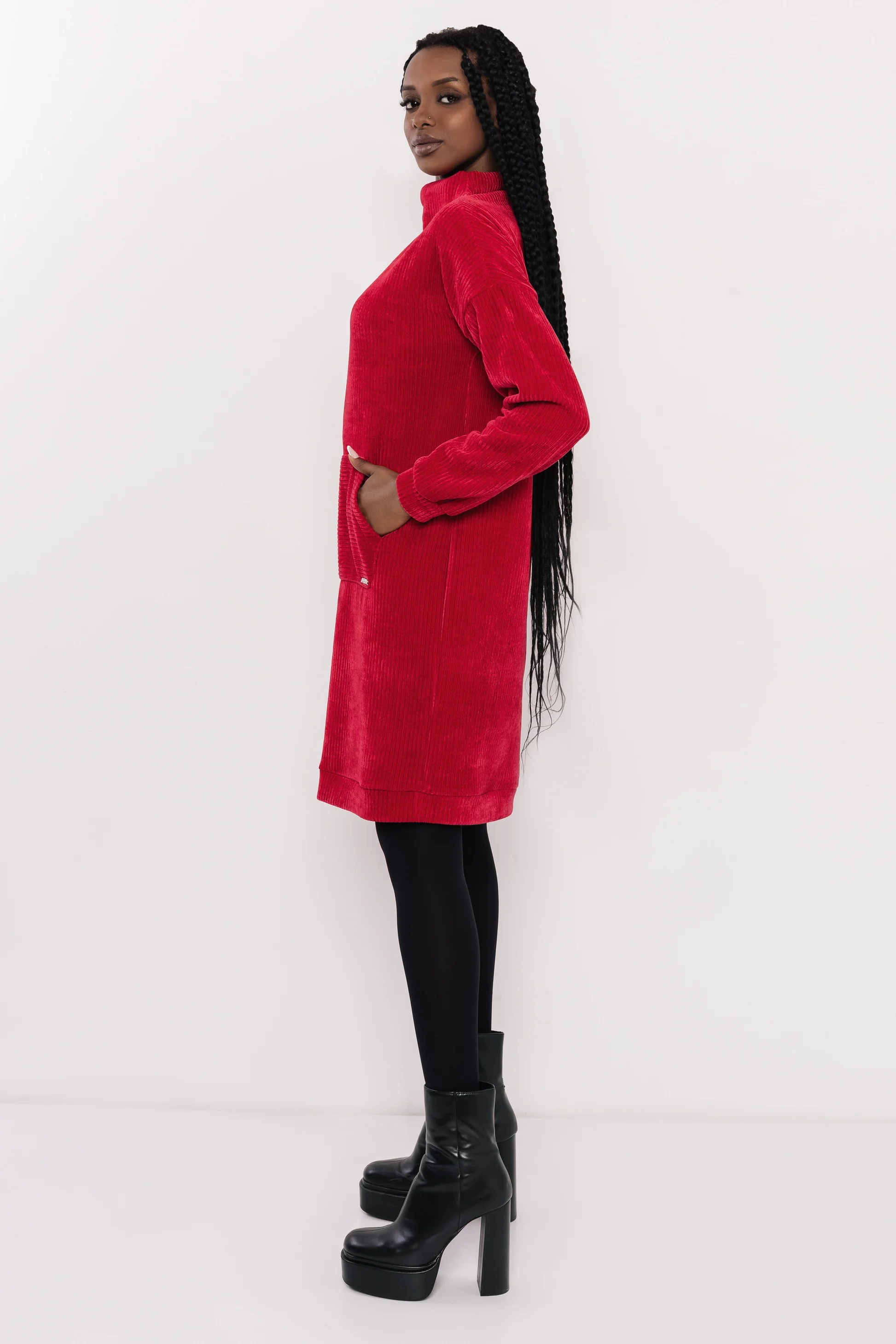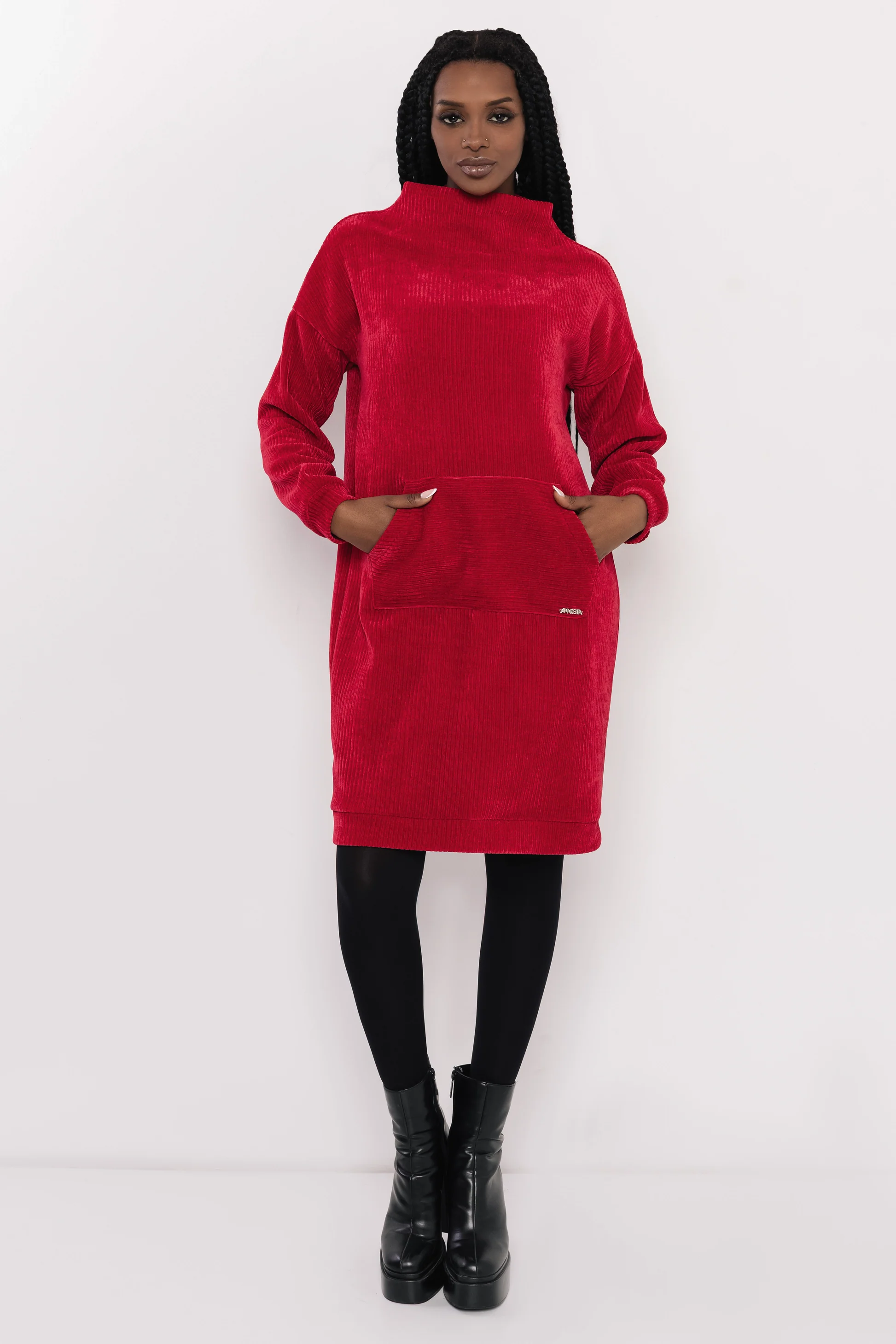 A zseníliából készült AMNESIA Volin ruha egyszerre kényelmes és látványos. Puha, selymes tapintású anyaga és a lezser fazon magasított nyakkal és kenguruzsebbel modern, laza megjelenést ad.