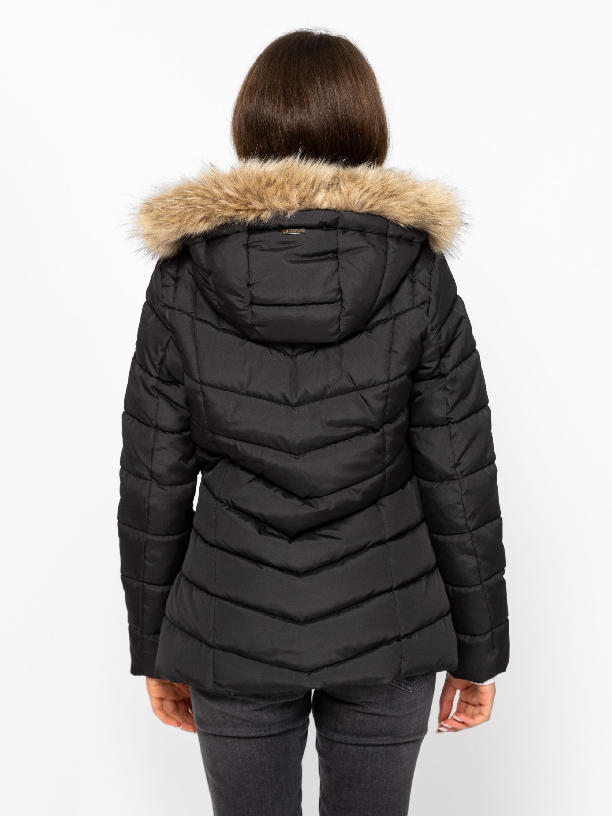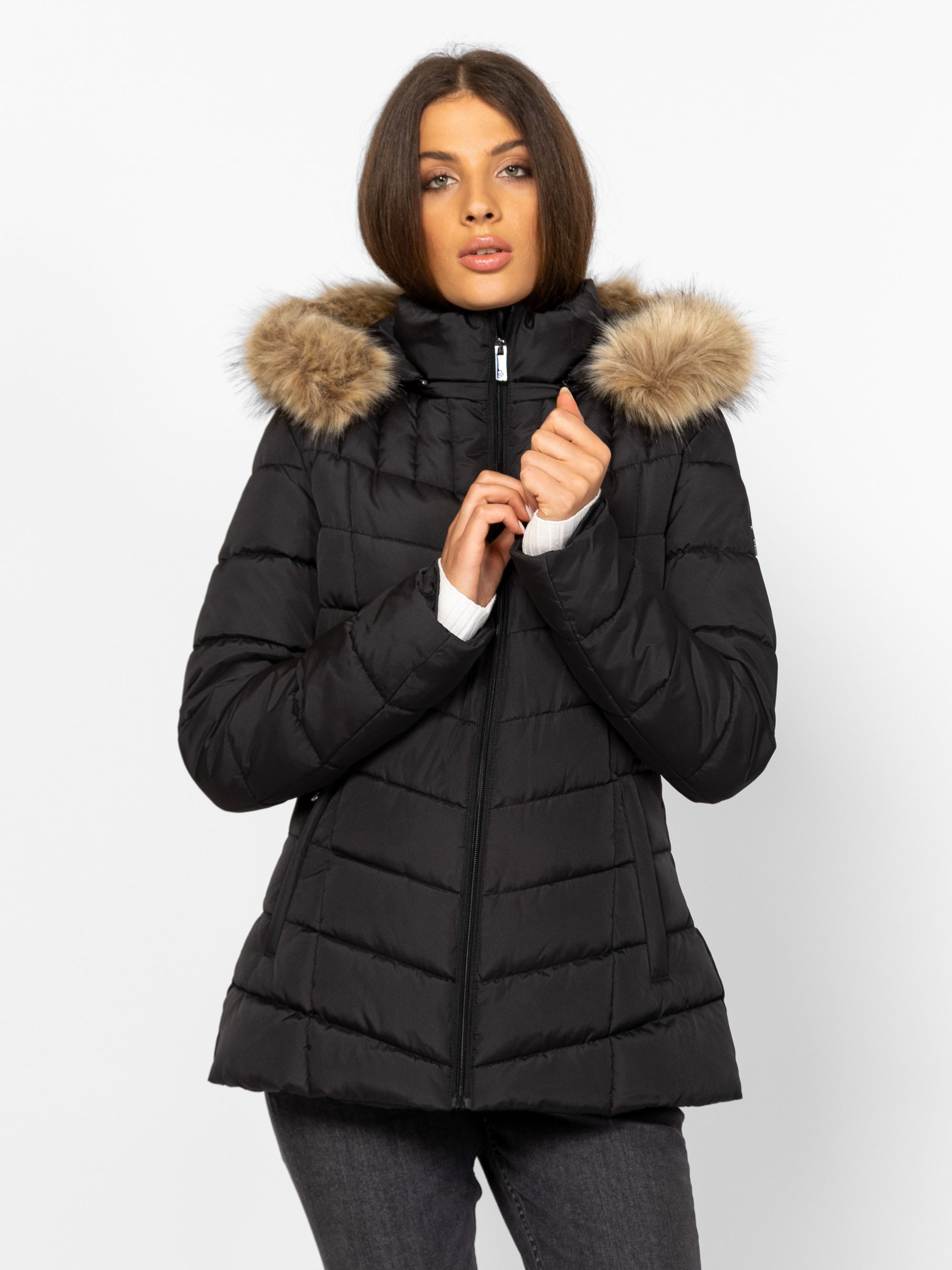 Női utcai steppelt dzseki, nőies vonalvezetéssel, csípőig érő hosszal, belső szélfogóval, levehető kapucnival, kapucniról levehető szőrmével, cipzáros zsebekkel, kis fém márkajelzéssel az ujján és a kapucniján. Anyaga: külső: 100% poliészter, bélés: 100% poliészter, tömés: 100% poliészter. A modell 175 cm magas és S-es méretet visel.