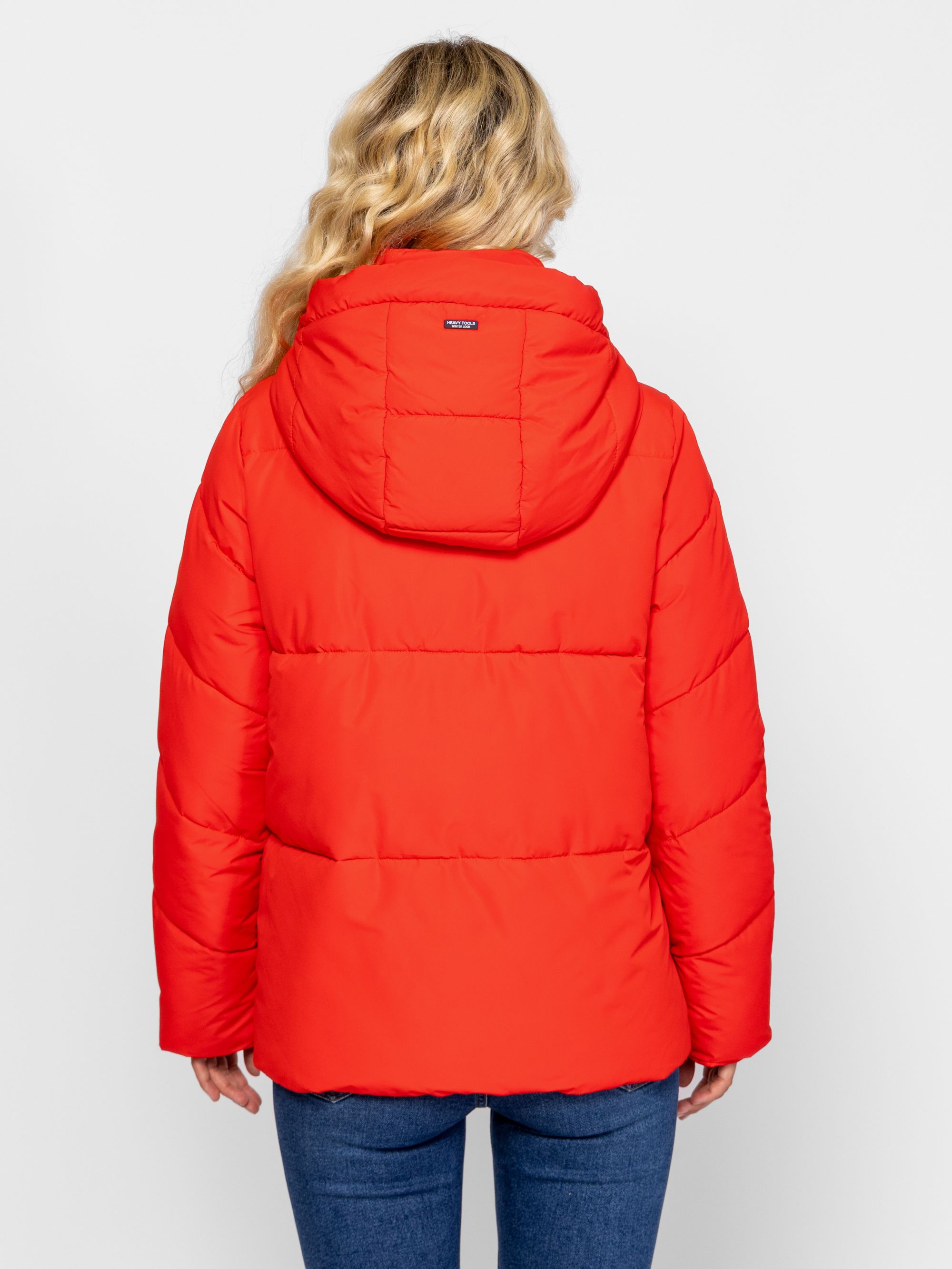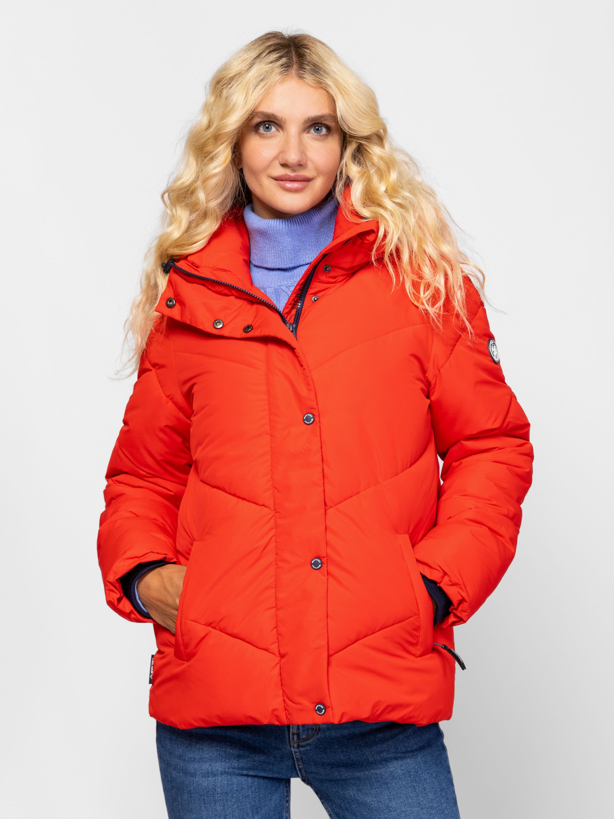 Női steppelt dzseki, egyenes szabással, csípőig érő hosszal, külső és belső szélfogóval, állítható, fix kapucnival, egyenes, cipzáros zsebekkel, bordás passzés kézelővel, kis márkajelzéssel az ujján, a kapucnin és az oldalában, nyomott márkajelzéssel a belső szélfogón. Anyaga: külső: 100% poliészter, bélés: 100% poliészter, tömés: 100% poliészter. A modell 175 cm magas és S-es méretet visel.