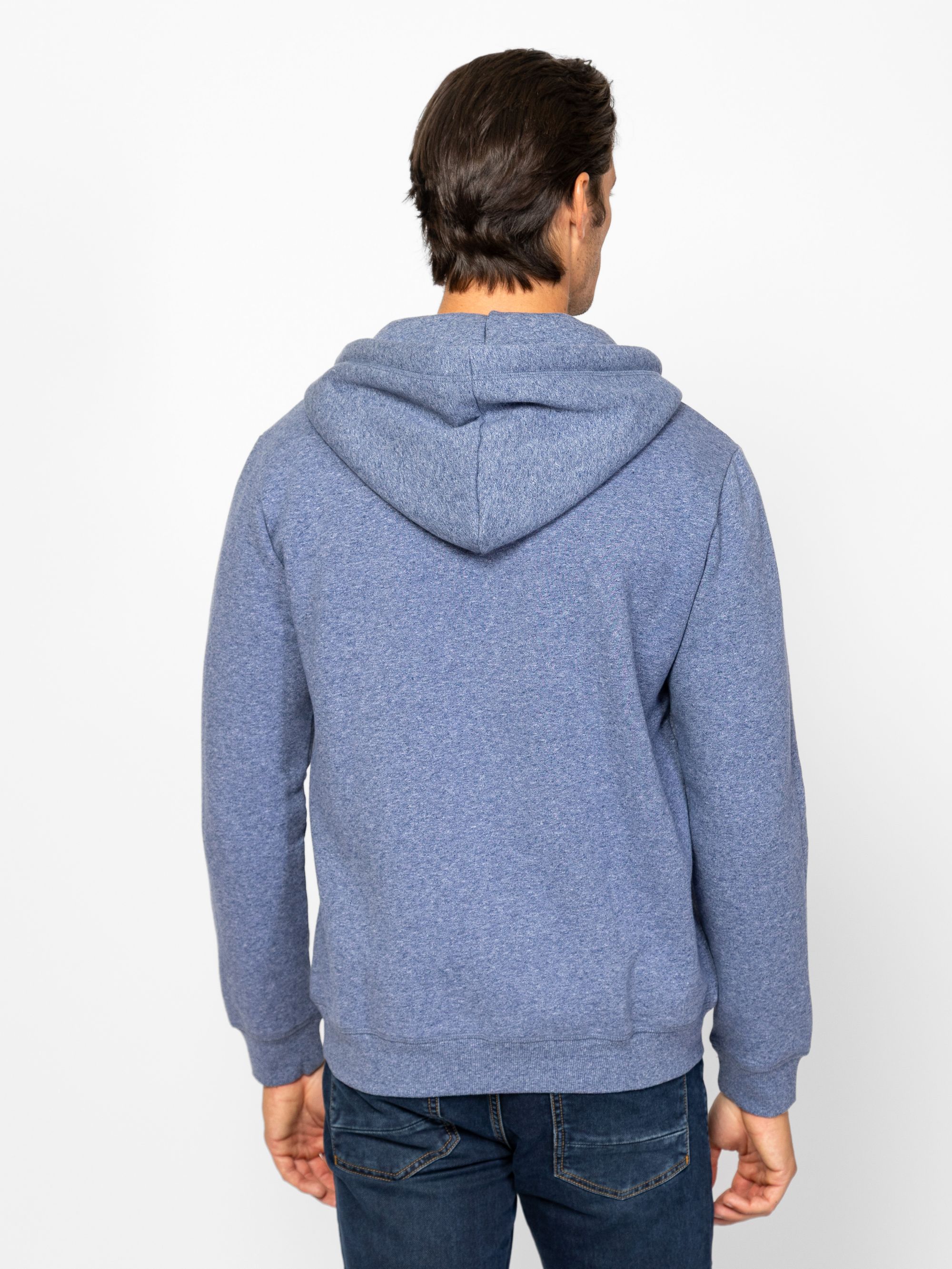 Férfi cipzáros, kapucnis pulóver, klasszikus szabással, kenguruzsebbel, bordás passzés kézelővel és aljjal, elején applikált, hímzett márkajelzéssel, zsebénél kis szövött márkajelzéssel. Anyaga: 57% pamut, 43% poliészter, belül bolyhozott fleece. A modell 188 cm magas és L-es méretet visel.