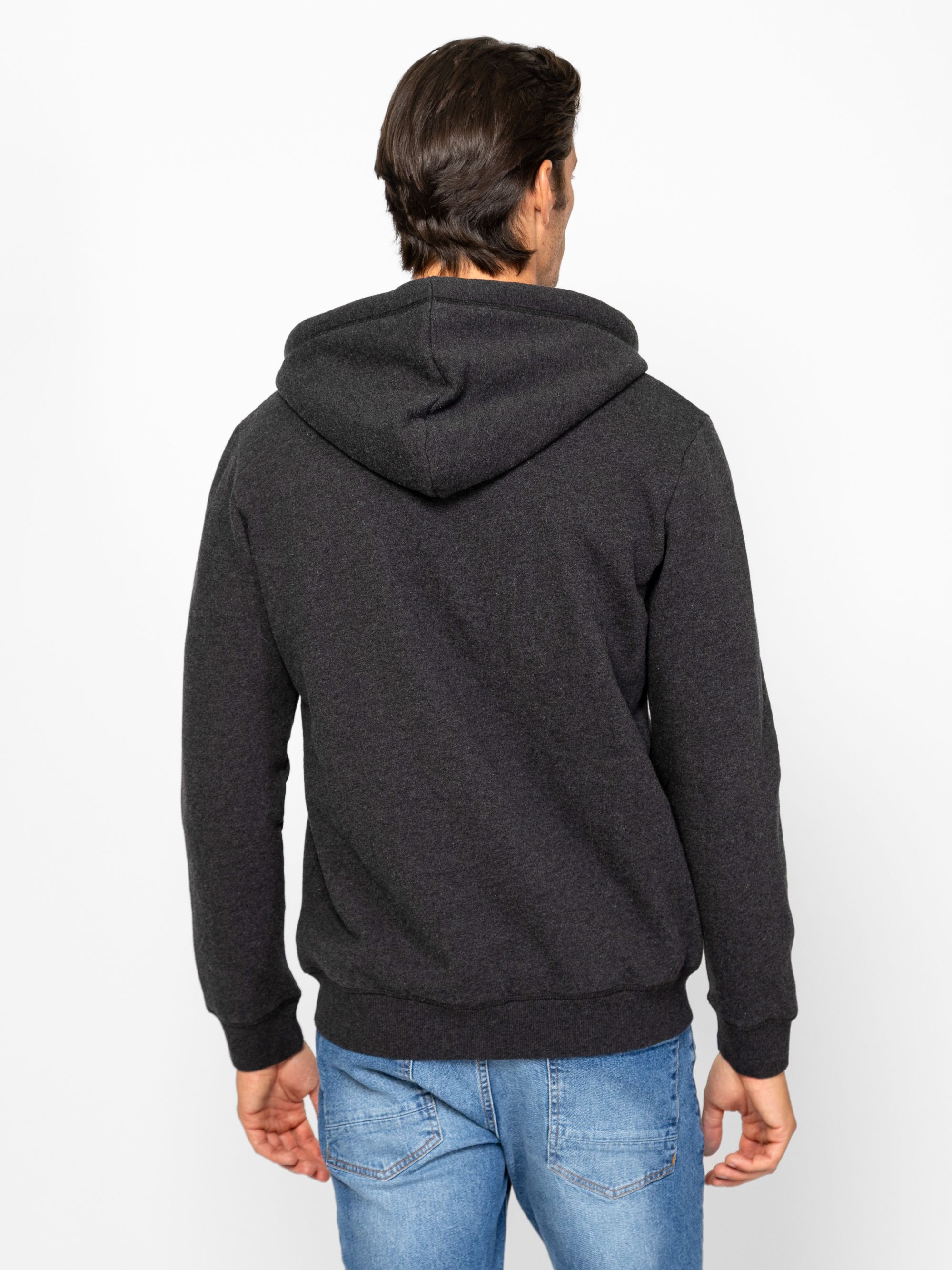 Férfi cipzáros, kapucnis pulóver, klasszikus szabással, kenguruzsebbel, bordás passzés kézelővel és aljjal, elején applikált, hímzett márkajelzéssel, zsebénél kis szövött márkajelzéssel. Anyaga: 57% pamut, 43% poliészter, belül bolyhozott fleece. A modell 188 cm magas és L-es méretet visel.