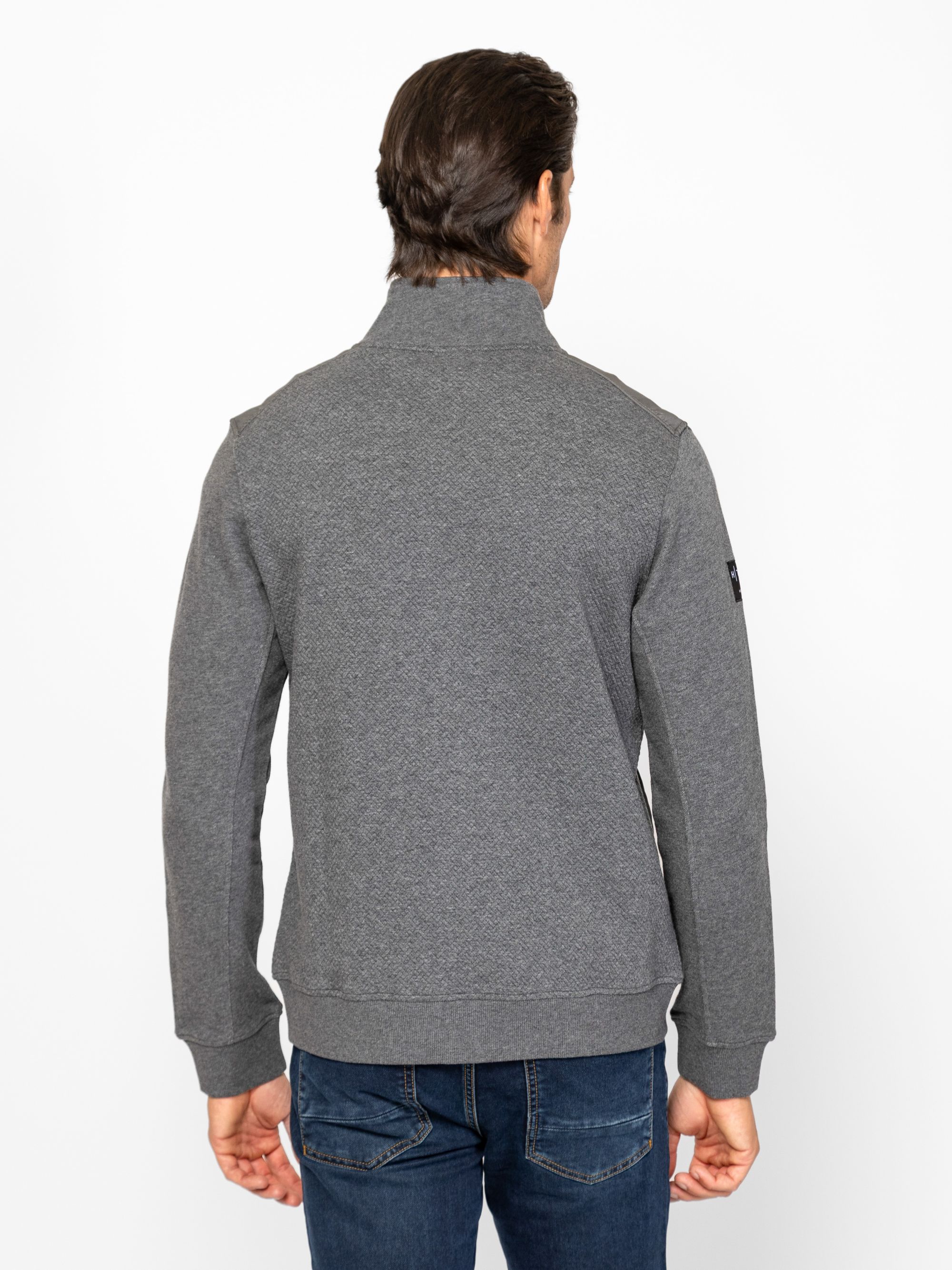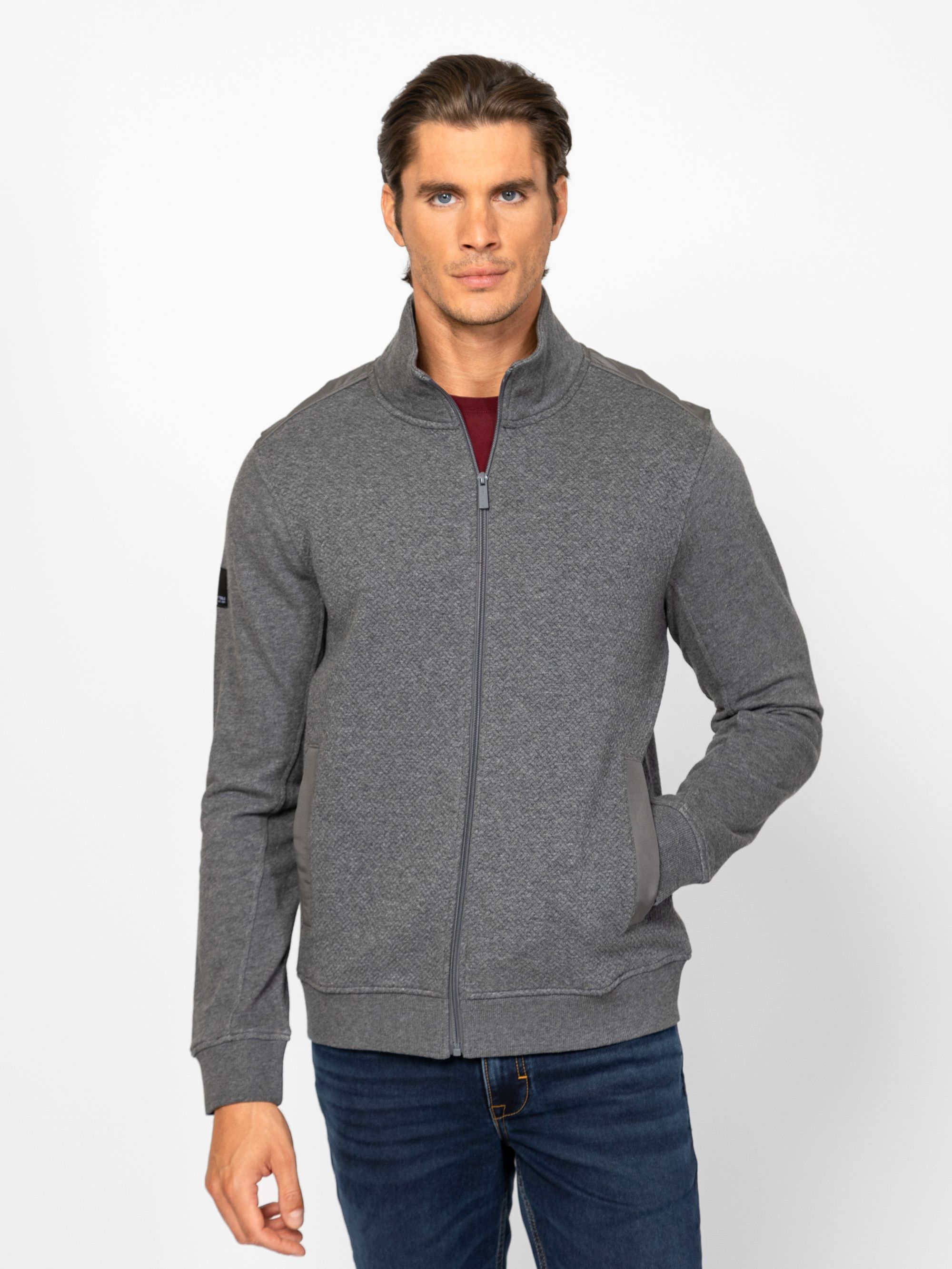 Férfi cipzáros, állógalléros pulóver, klasszikus megjelenéssel, többféle anyaggal, egyenes zsebekkel, kis szövött márkajelzéssel az ujján. Anyaga: eleje és háta: 50% polészter, 48% pamut, 2% elasztán, jacquard anyag, ujjak, gallér: 100% pamut, french terry, váll rész, zseb: 100% poliészter. A modell 188 cm magas és L-es méretet visel.Kevesebb infó