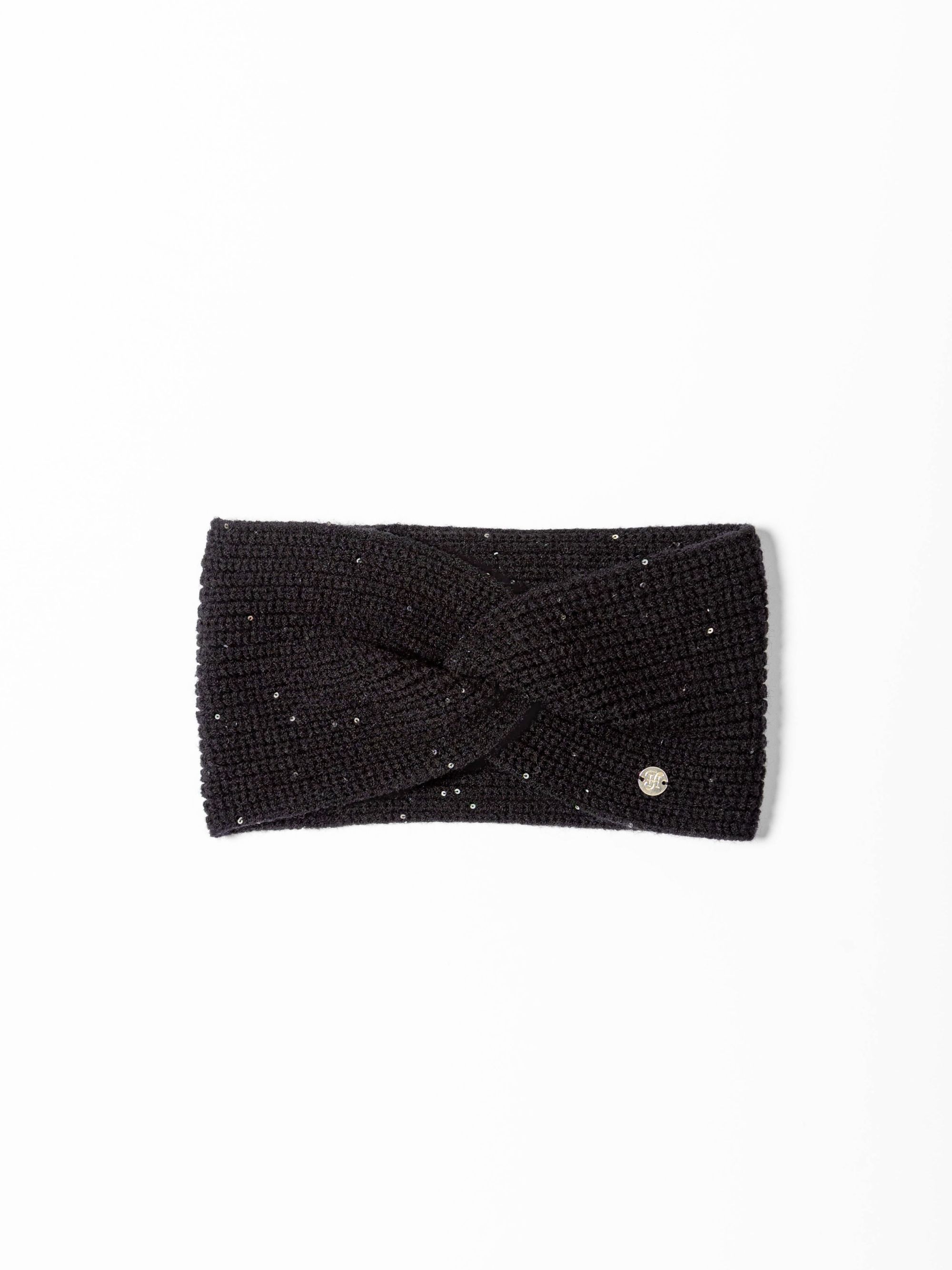 Női bordás kötött fejpánt a hűvösebb napokra, kis fém márkajelzéssel az elején, alap színekben. Anyaga: 40% akril, 32% poliészter, 22% poliamid, 6% strassz.