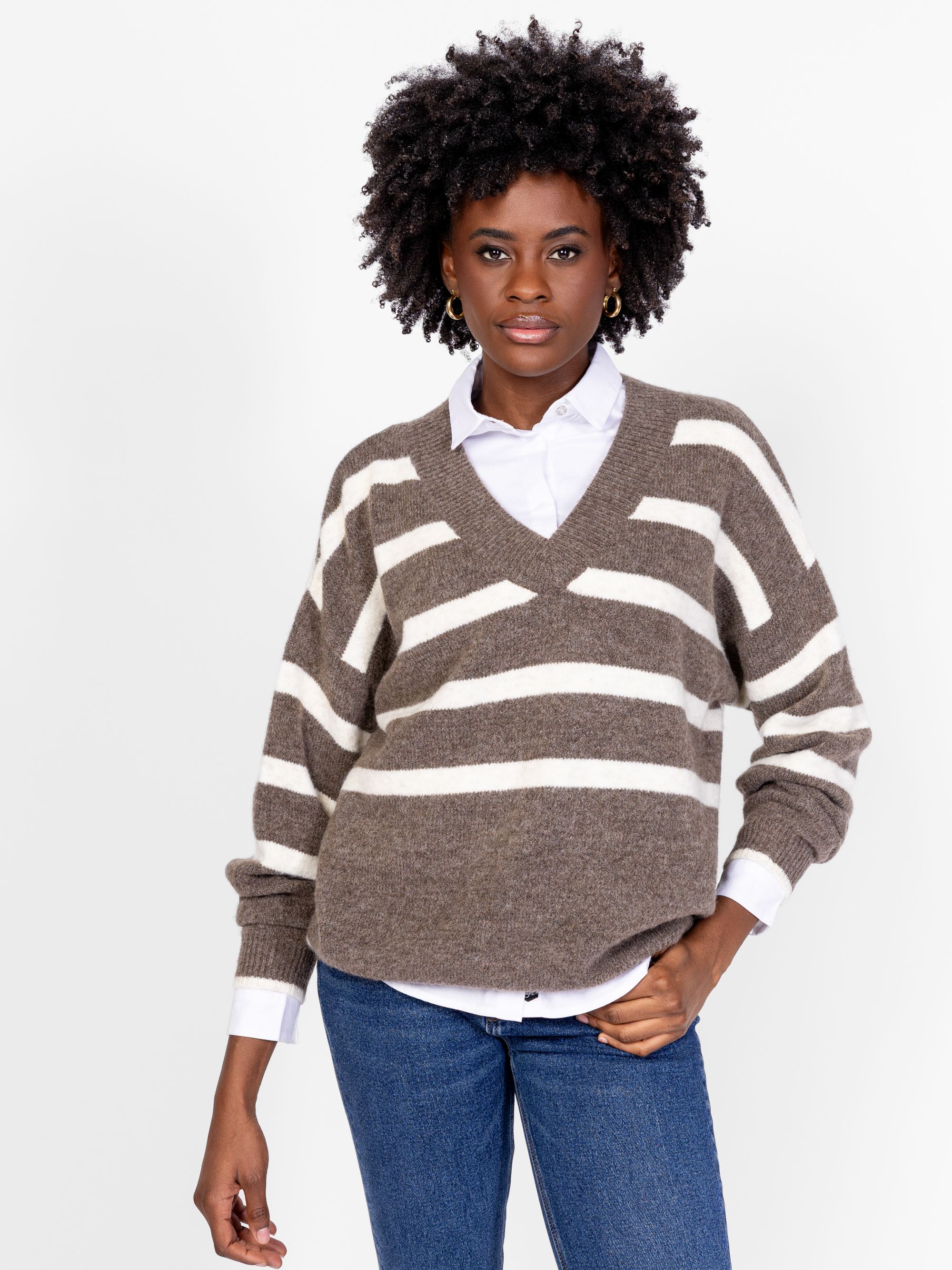Női kötött pulóver, bővebb szabással, v-nyakkal, trendi csíkozással, kis fém márkajelzéssel az eleje alján. Anyaga: 98% poliészter, 2% elasztán, kötött anyag. A modell 175 cm magas és S-es méretet visel.