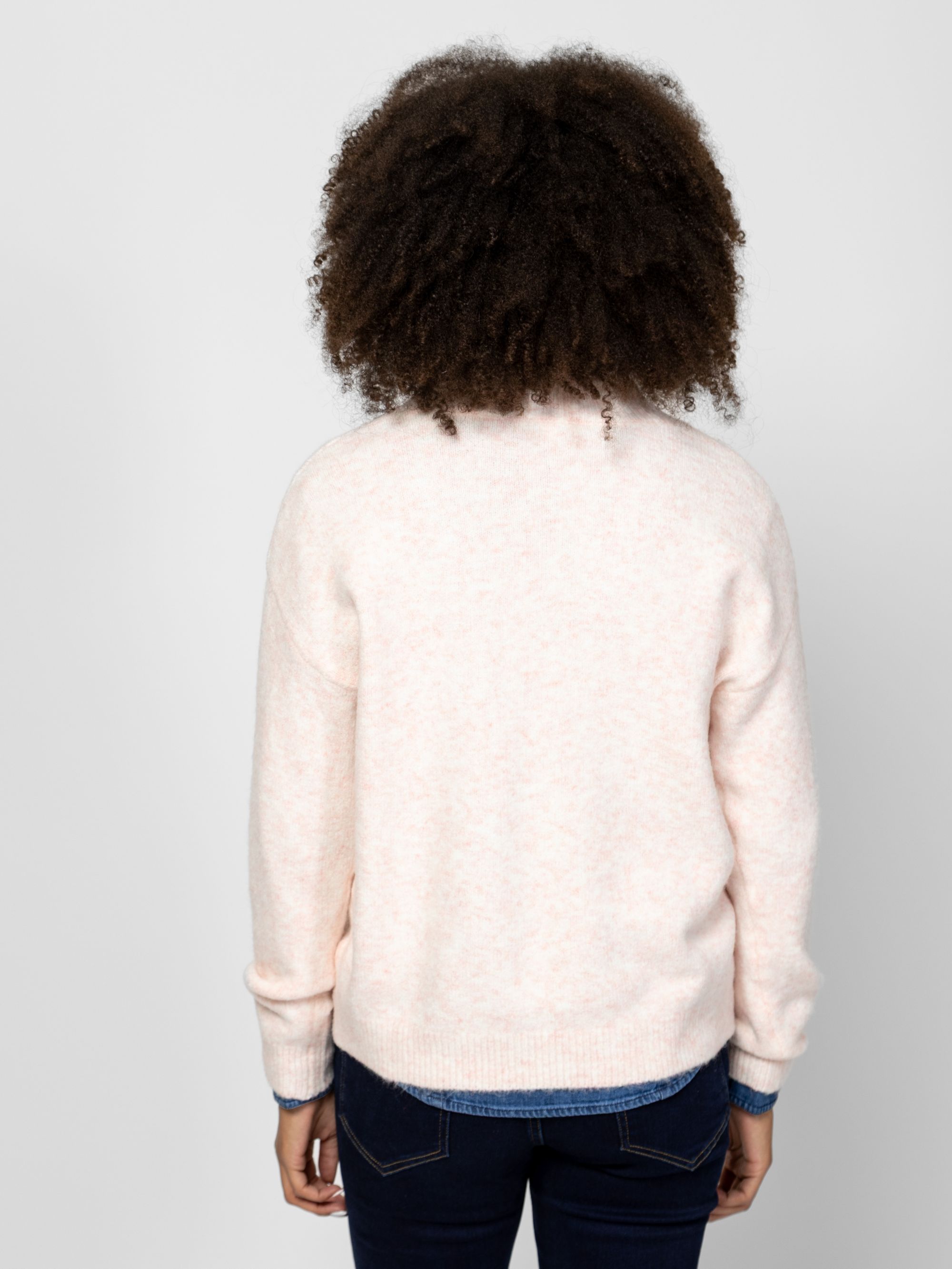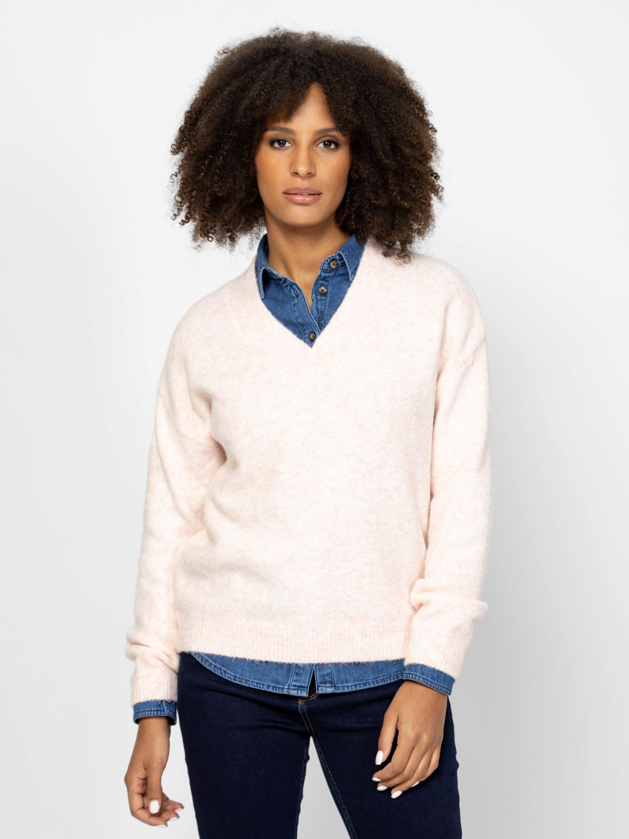Női kötött pulóver, bővebb szabással, v-nyakkal, trendi csíkozással, kis fém márkajelzéssel az eleje alján. Anyaga: 98% poliészter, 2% elasztán, kötött anyag. A modell 175 cm magas és S-es méretet visel.