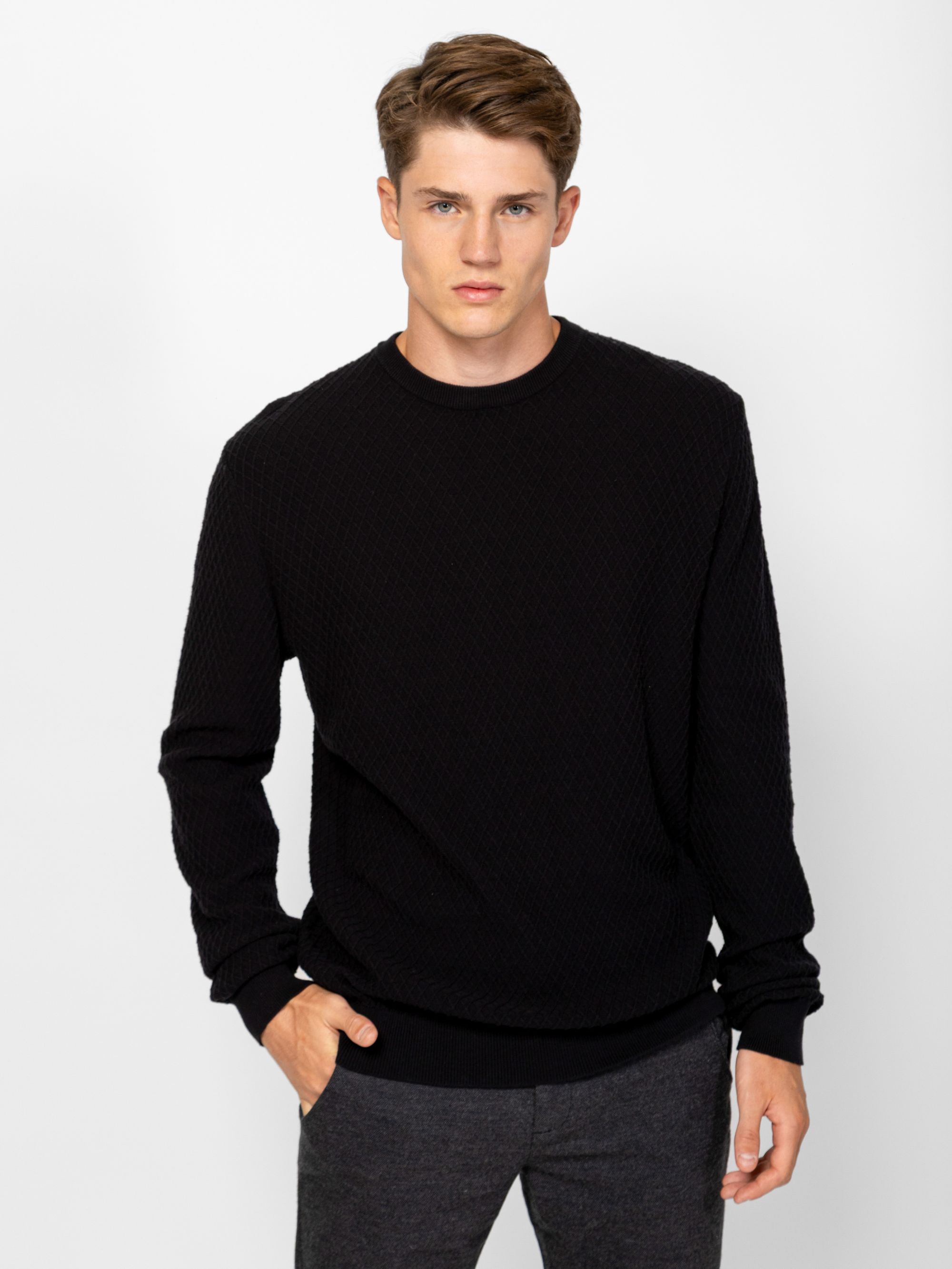 Férfi kötött pulóver, klasszikus szabással, stílusos kötésmintával, kerek nyakkal, bordás kötött kézelővel, nyakkal és aljjal, kis bőr márkajelzéssel az eleje alján. Anyaga: 100% pamut, kötött anyag. A modell 188 cm magas és L-es méretet visel.