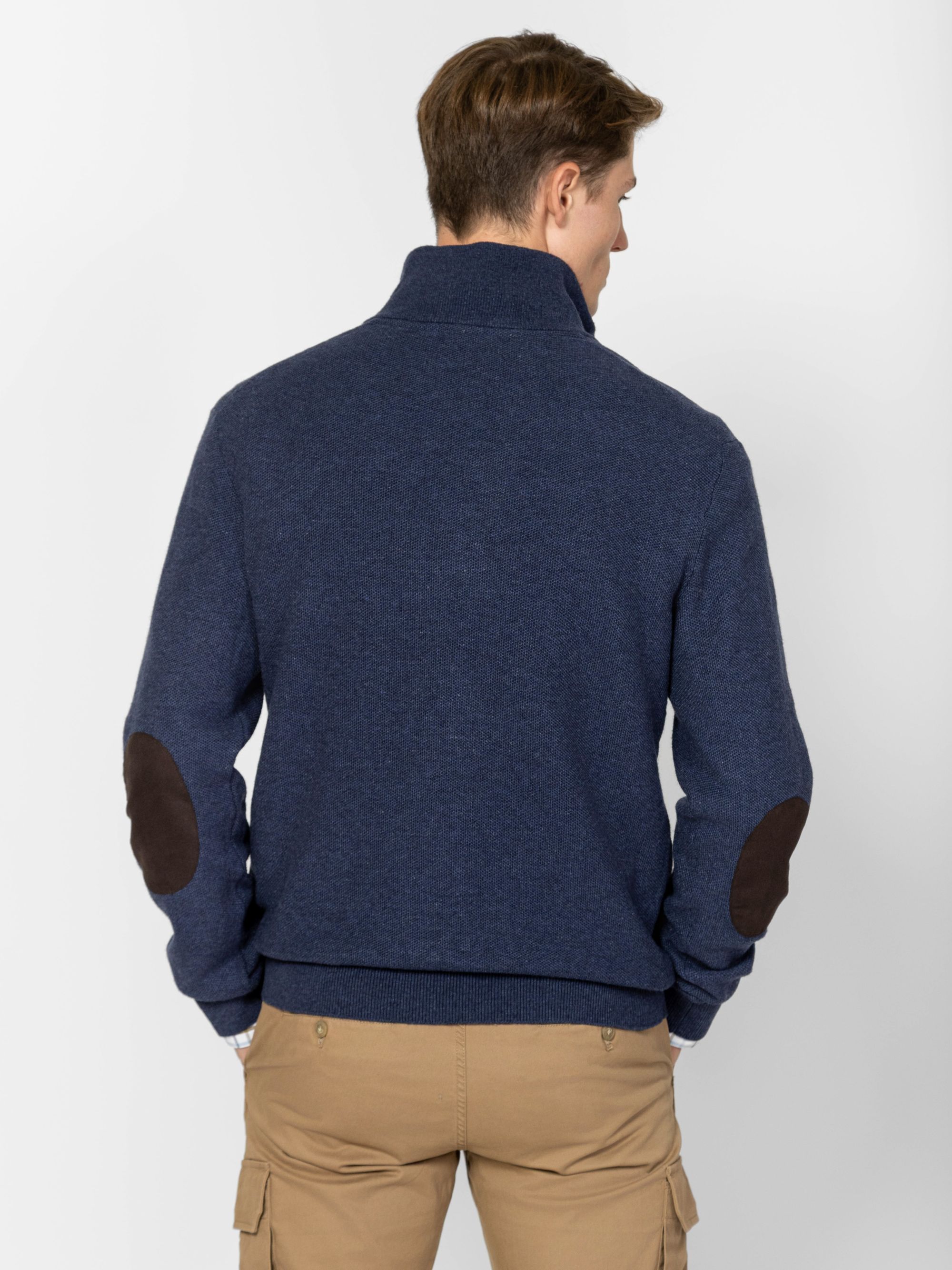 Férfi kötött pulóver, klasszikus szabással, alap színekben, cipzáros állógallérral, bordás kötött gallérral, kézelővel és aljjal, könyökén rátéttel, kis bőr márkajelzéssel az eleje alján. Anyaga: 50% nylon, 35% gyapjú, 15% viszkóz, kötött anyag. A modell 188 cm magas és L-es méretet visel.