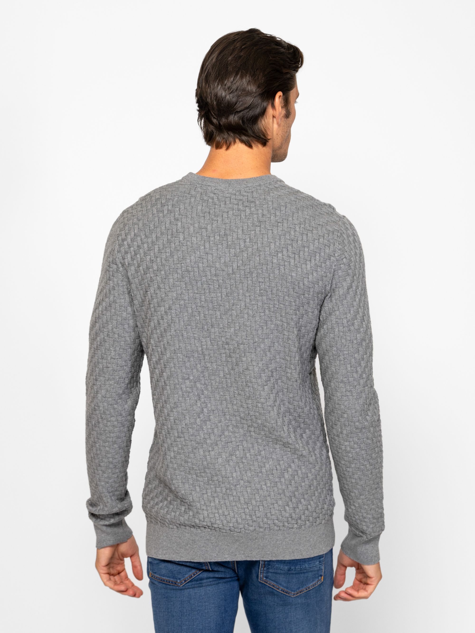 Férfi finom kötött pulóver, klasszikus szabással, stílusos kötésmintával, kerek nyakkal, bordás kötött kézelővel, nyakkal és aljjal, kis bőr márkajelzéssel az eleje alján. Anyaga: 100% pamut, kötött anyag. A modell 188 cm magas és L-es méretet visel.