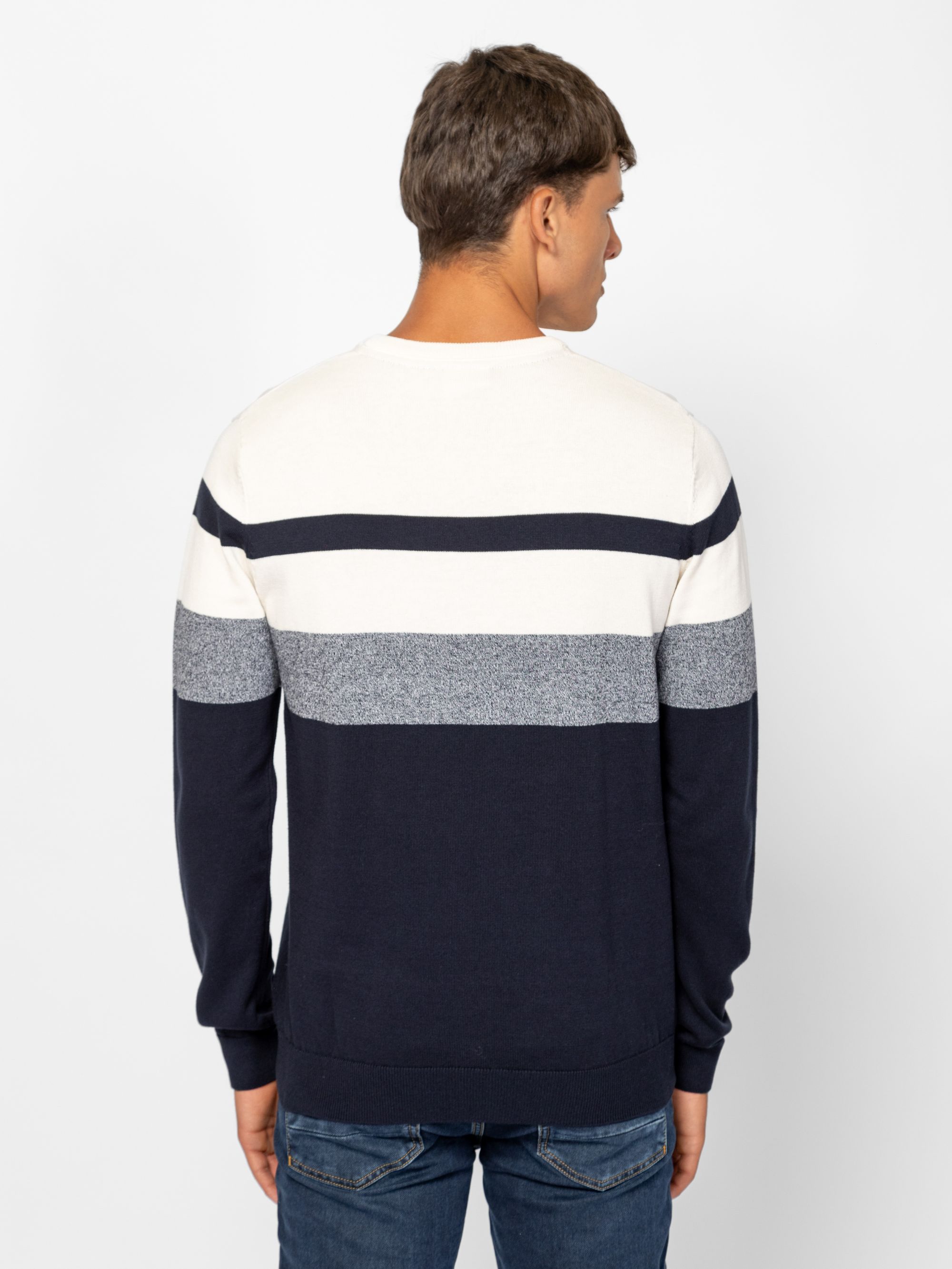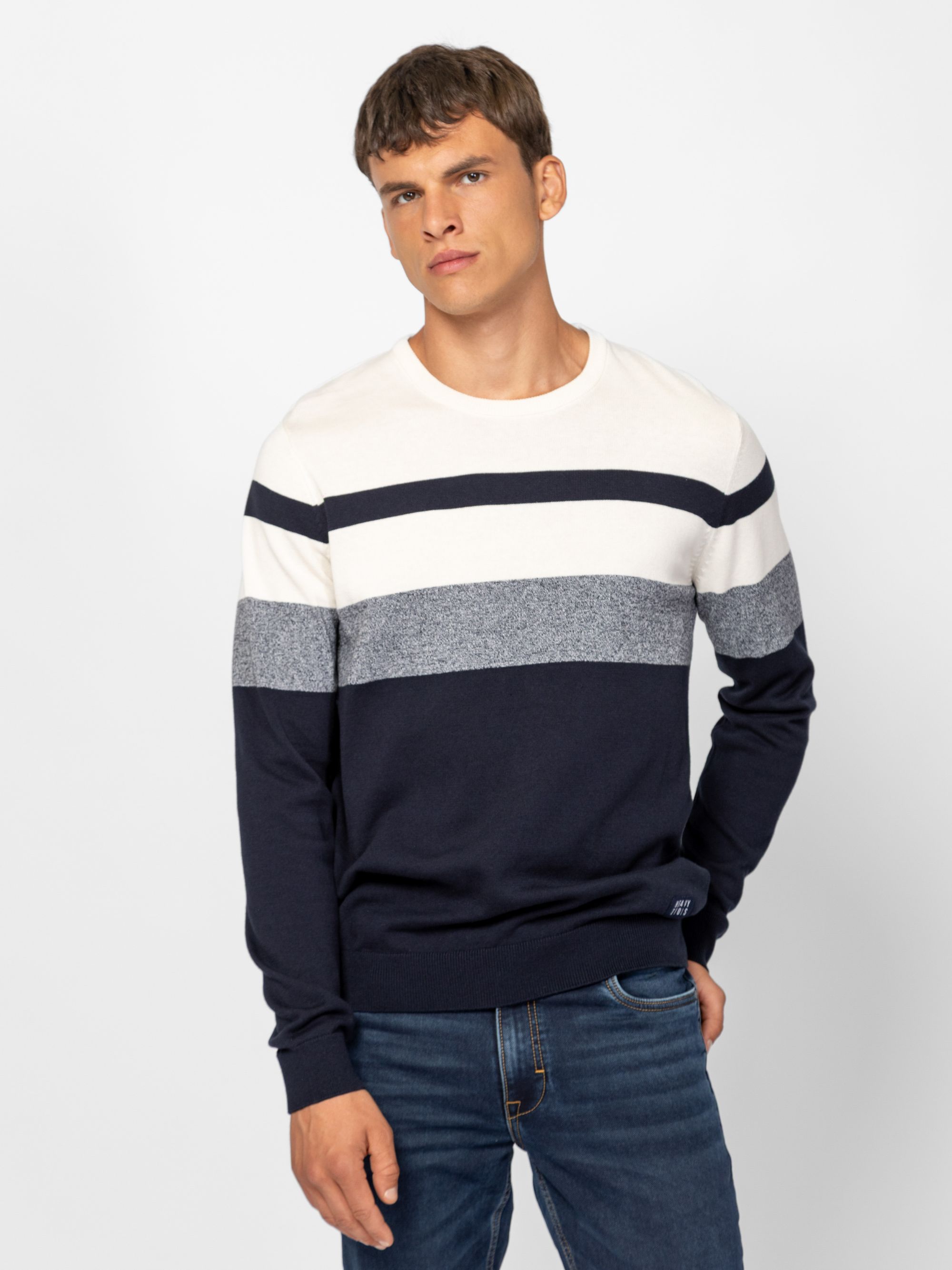 Férfi finom kötött pulóver, klasszikus szabással, váll részen széles csíkozással, kerek nyakkal, bordás kötött kézelővel, nyakkal és aljjal, kis szövött márkajelzéssel az eleje alján. Anyaga: 100% pamut, kötött anyag. A modell 188 cm magas és L-es méretet visel.