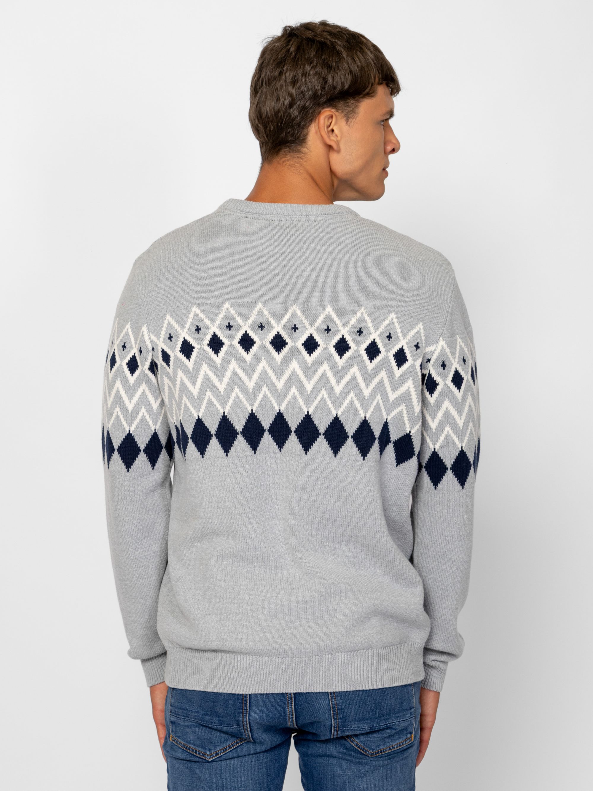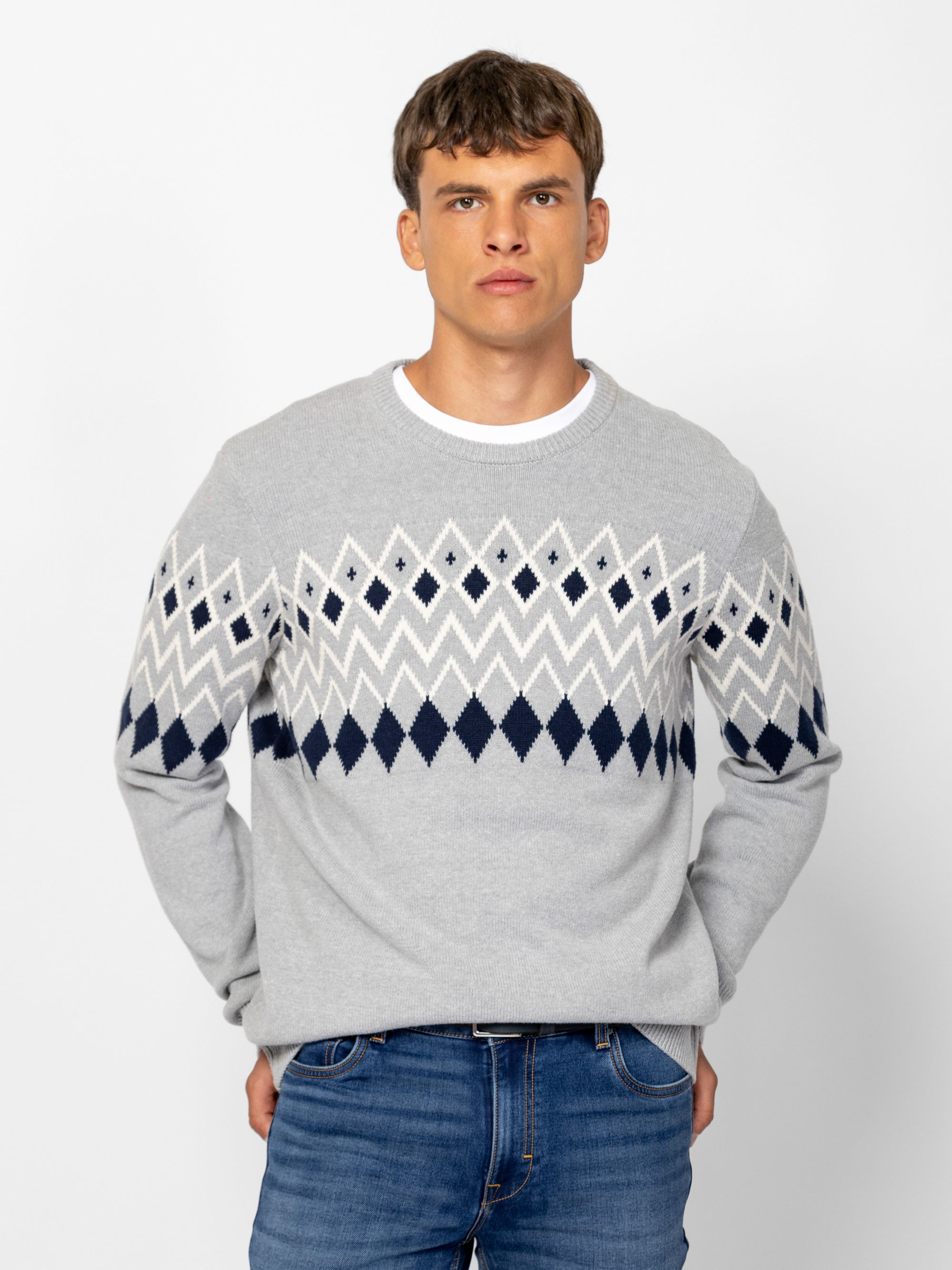 Férfi kötött pulóver, vastagabb, melírozott fonalból, mellén és ujján klasszikus norvég mintát idéző motívummal, egyenes szabással, kerek nyakkal, bordás kötött kézelővel, nyakkal és aljjal, kis bőr márkajelzéssel az eleje alján. Anyaga: 60% pamut, 40% akril, kötött anyag. A modell 188 cm magas és L-es méretet visel.