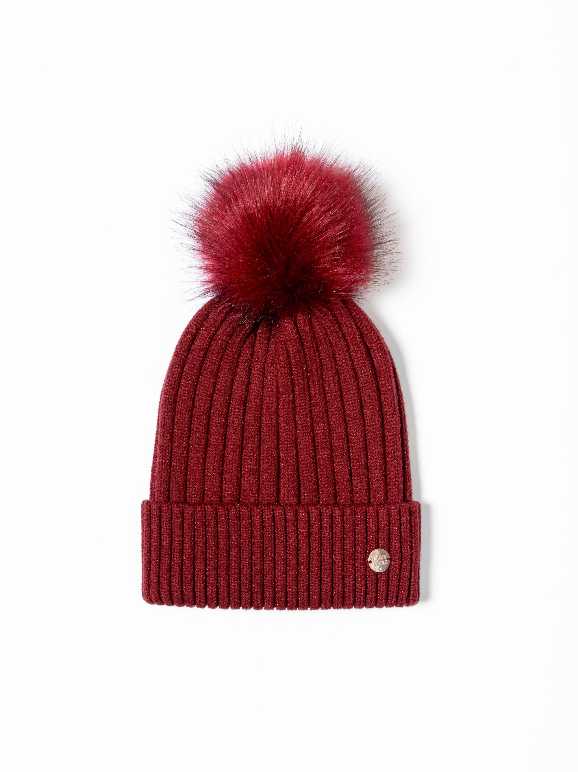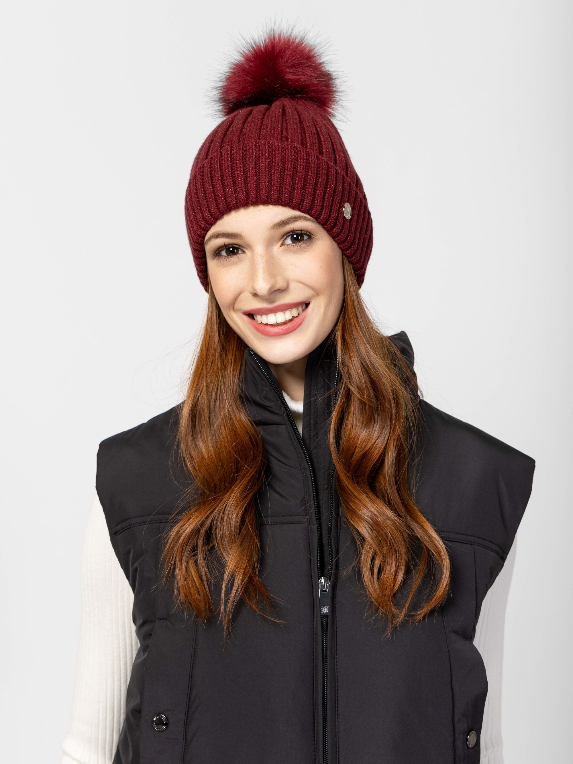 Női kötött sapka, lurex fonallal, dekoratív pomponnal, kis fém márkajelzéssel az oldalán. Anyaga: 50 % viscose, 30% poliészter, 10% poliamid, 10% lurex.