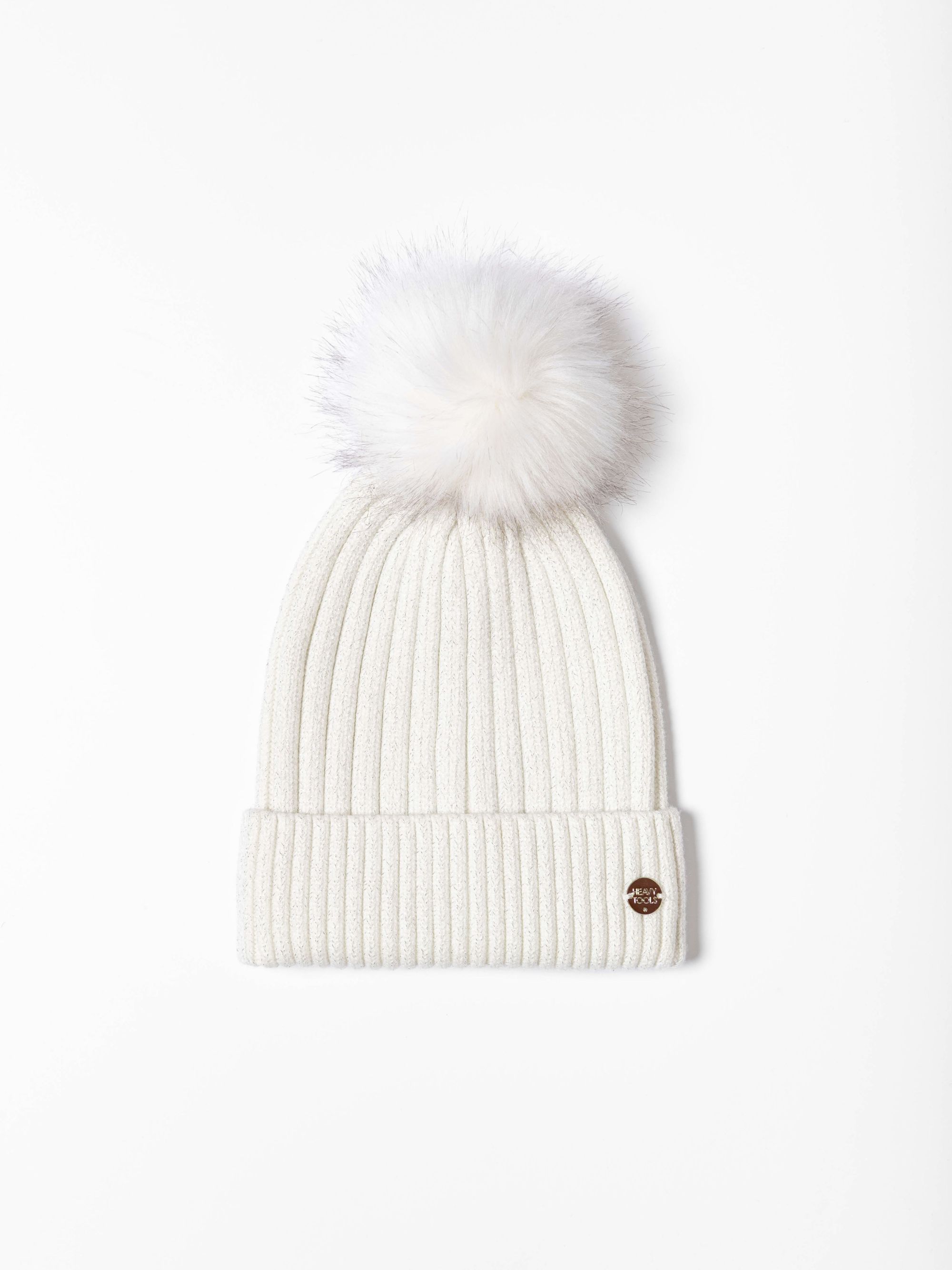 Női kötött sapka, lurex fonallal, dekoratív pomponnal, kis fém márkajelzéssel az oldalán. Anyaga: 50 % viscose, 30% poliészter, 10% poliamid, 10% lurex.