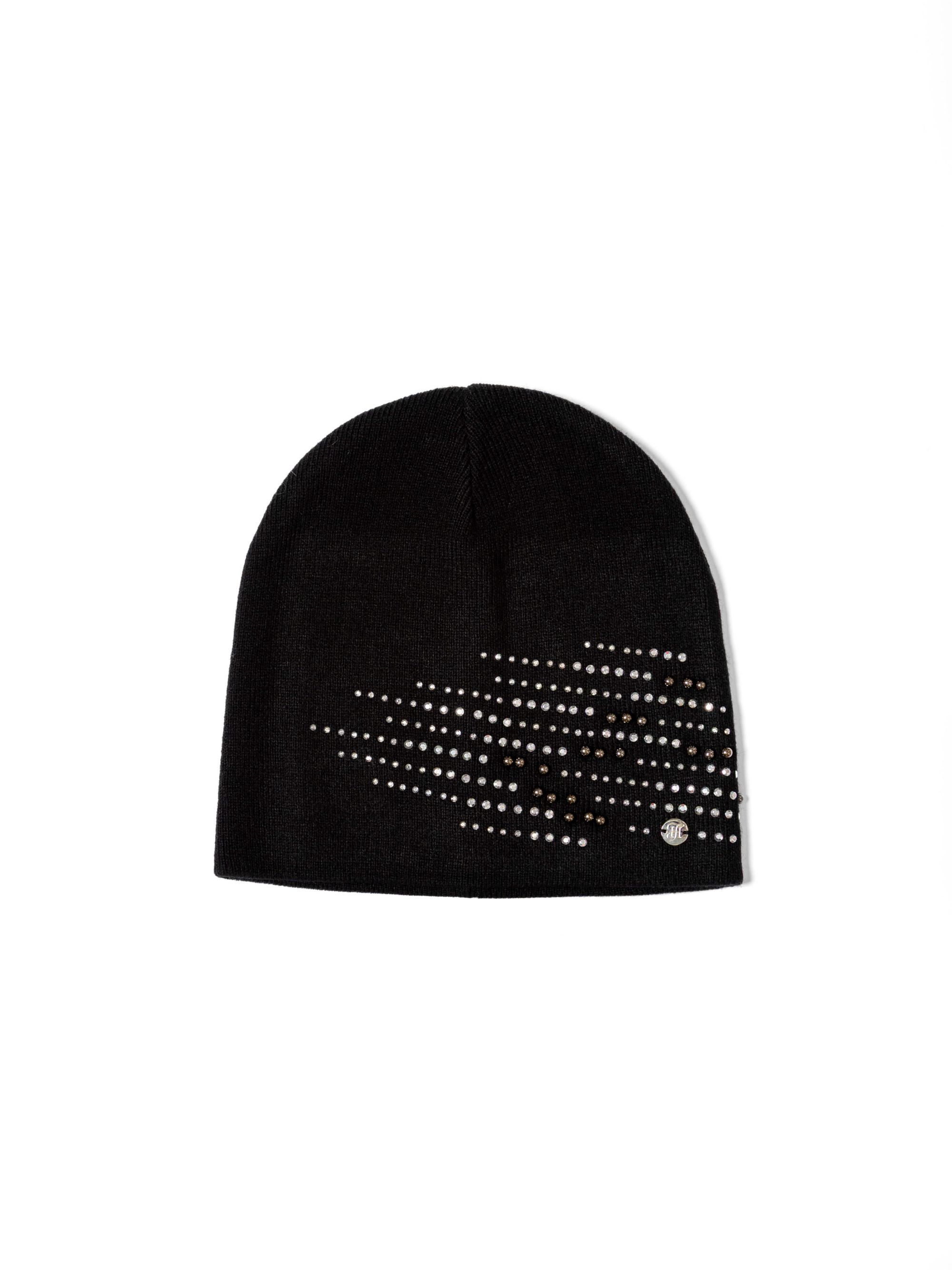 Női kötött sapka, elején köves díszítéssel és kis fém márkajelzéssel . Anyaga: 100% akril.