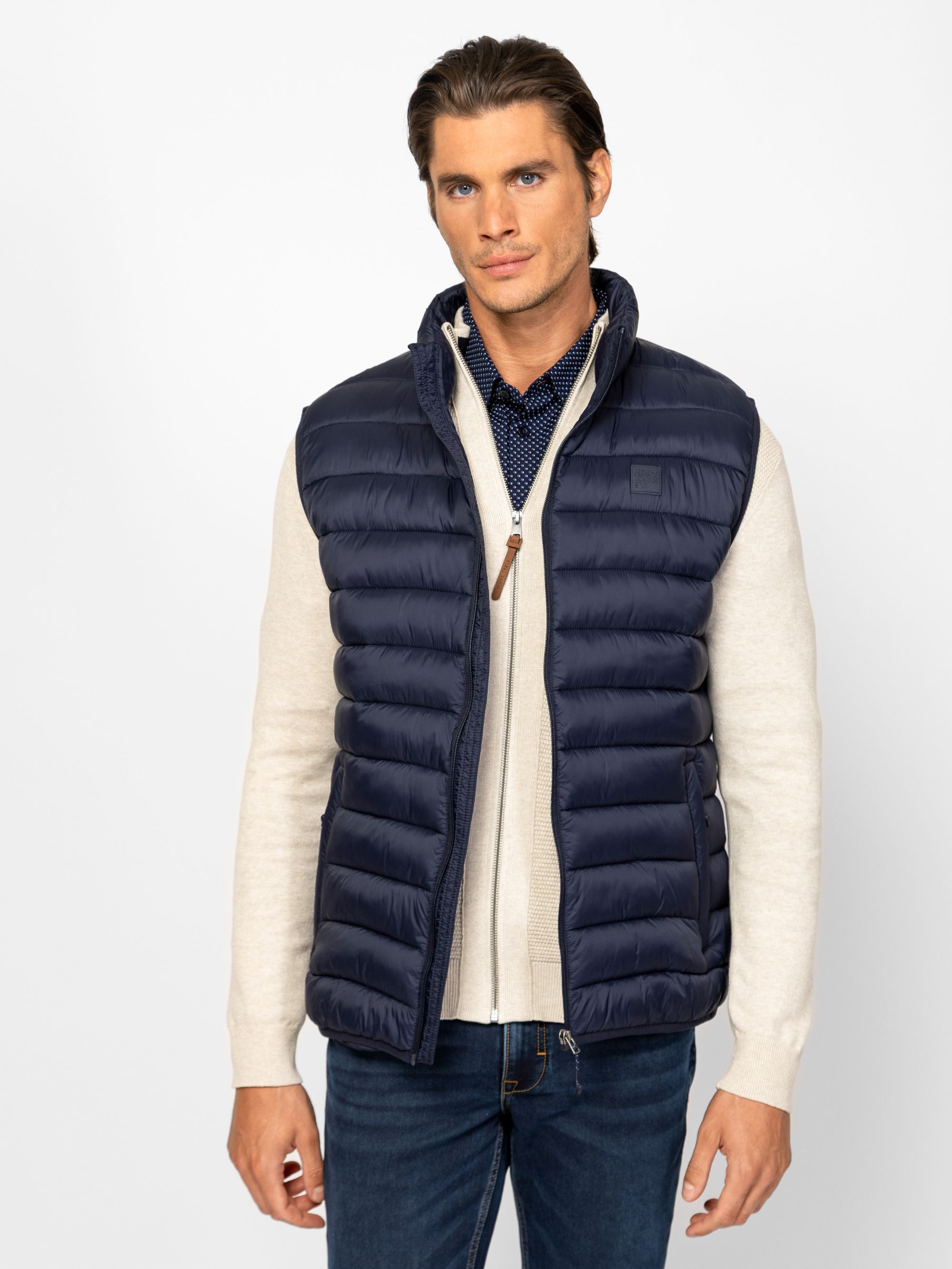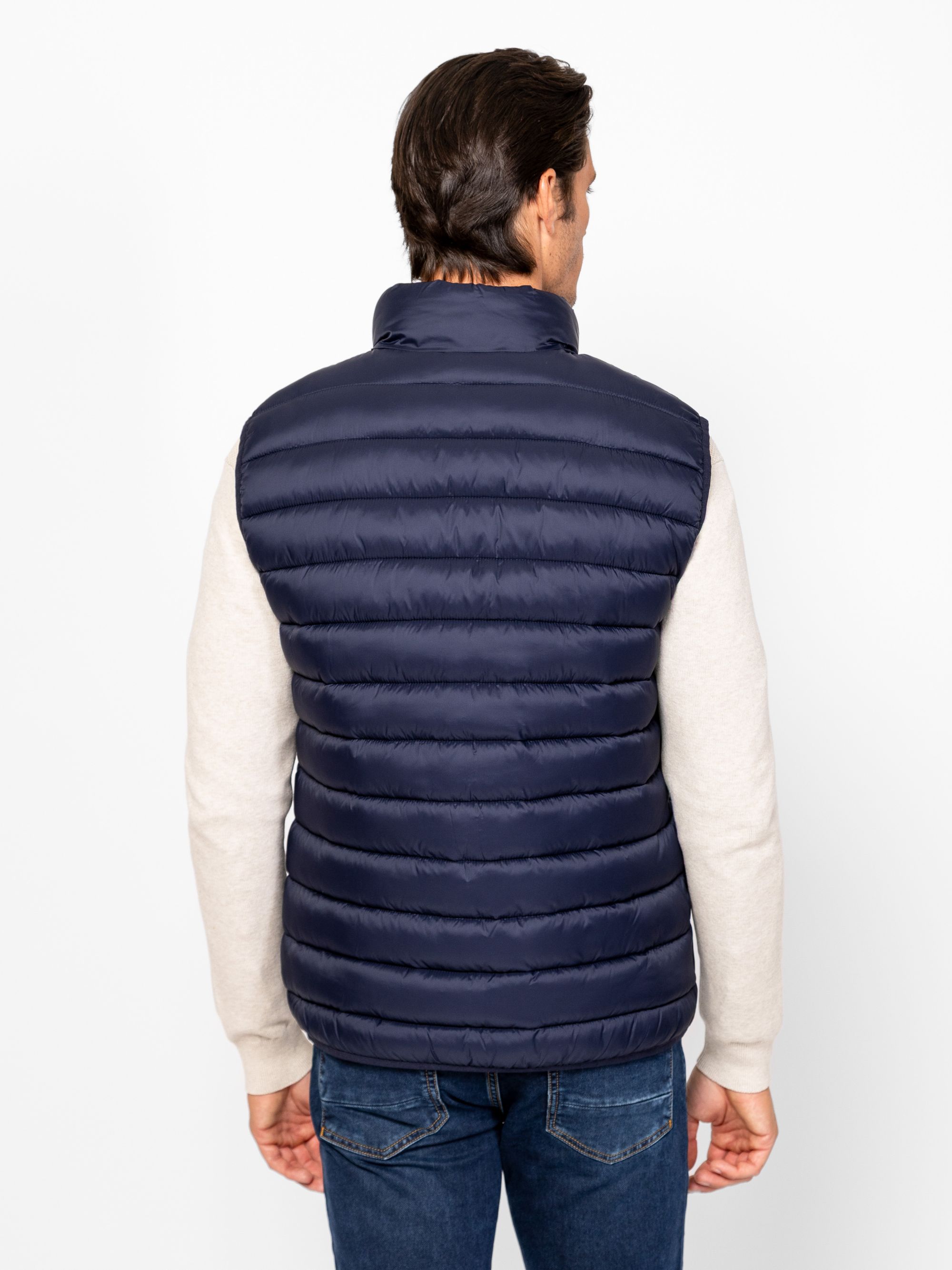 Férfi steppelt mellény, kényelmes szabással, állógallérral, cipzáros záródással, cipzáras zsebekkel, elején kis márkajelzéssel. Anyaga: külső, bélés: 100% nylon, tömés: 100% poliészter. A modell 188 cm magas és L-es méretet visel.