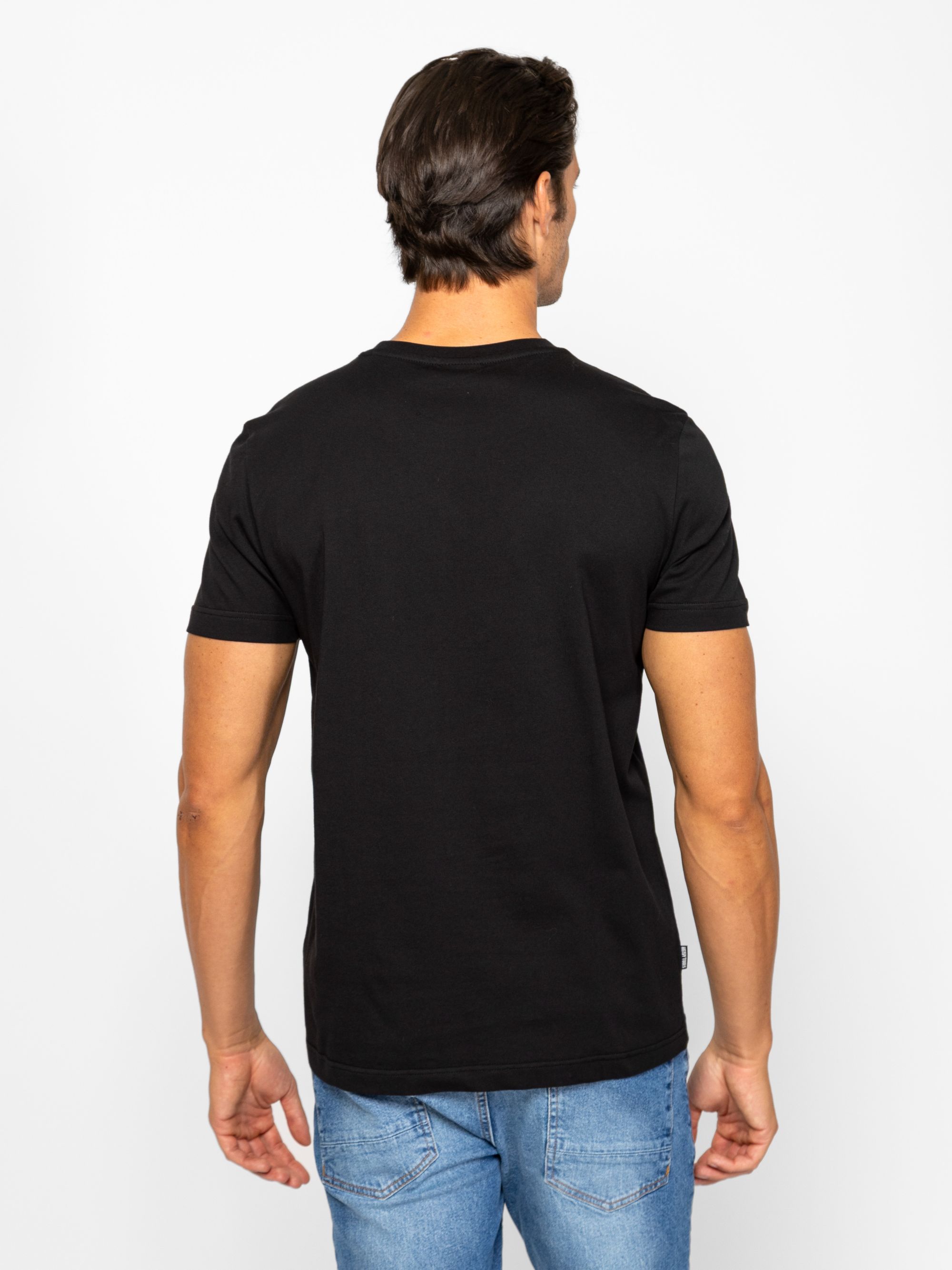 Férfi rövid ujjú póló, egyenes szabással, kerek nyakkal, elején nagy applikált márkajelzéssel, oldalában szövött címkével. Anyaga: 100% pamut, single jersey. A modell 188 cm magas és L-es méretet visel.