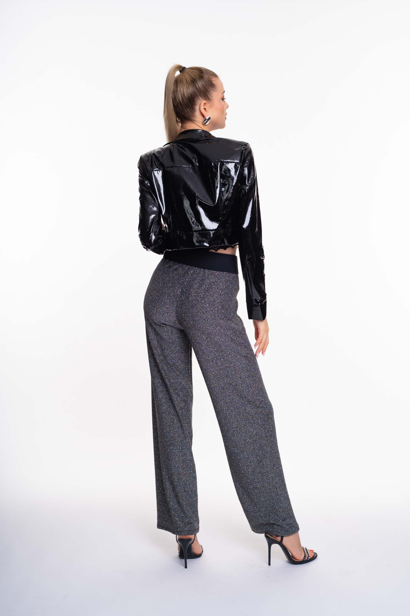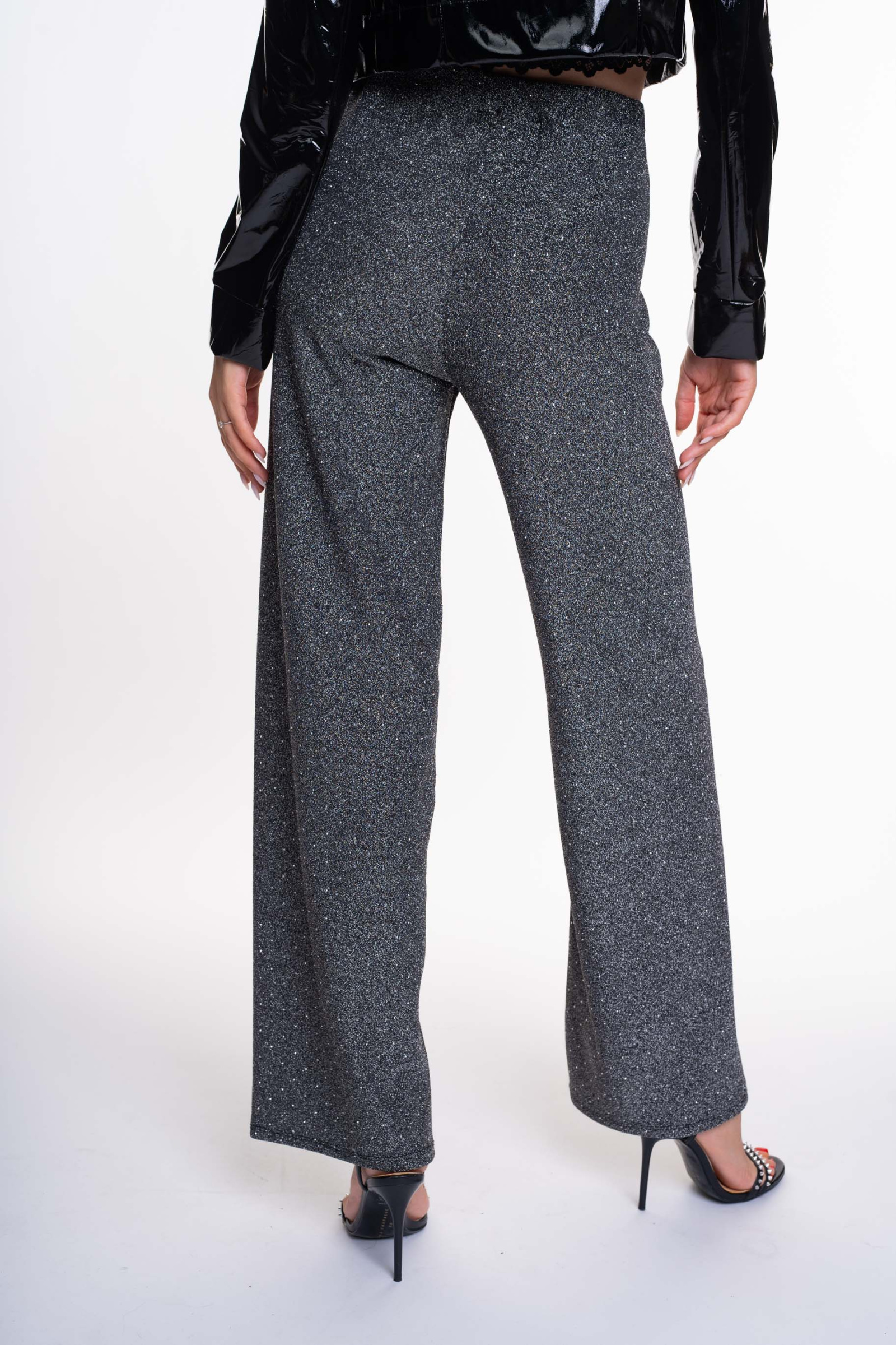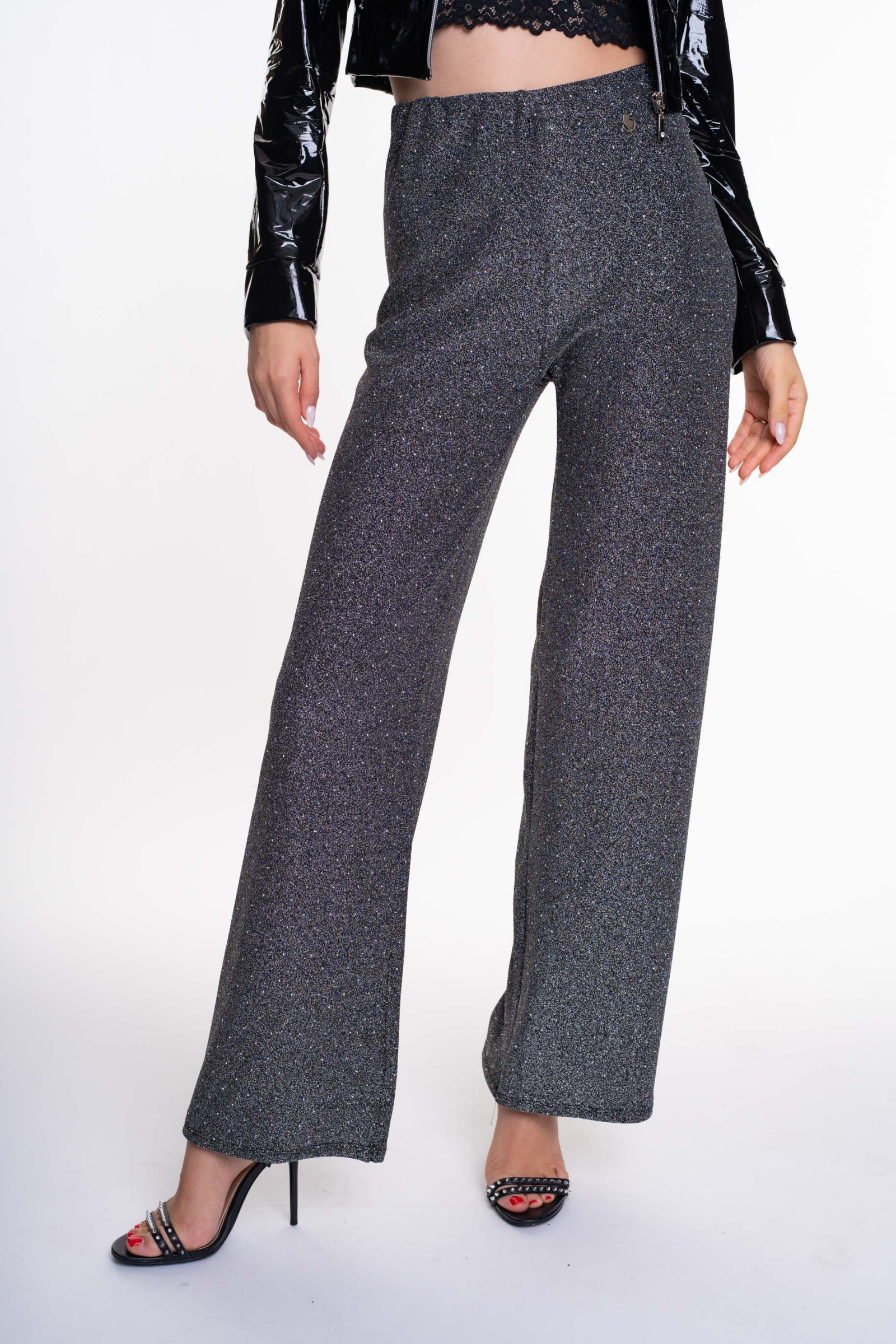 Elasztikus, lurexszálas anyagból készült, strasszkövekkel gazdagon díszített nadrág, gumis derékrésszel, bő szabásvonallal és kis fém márkajelzéssel.