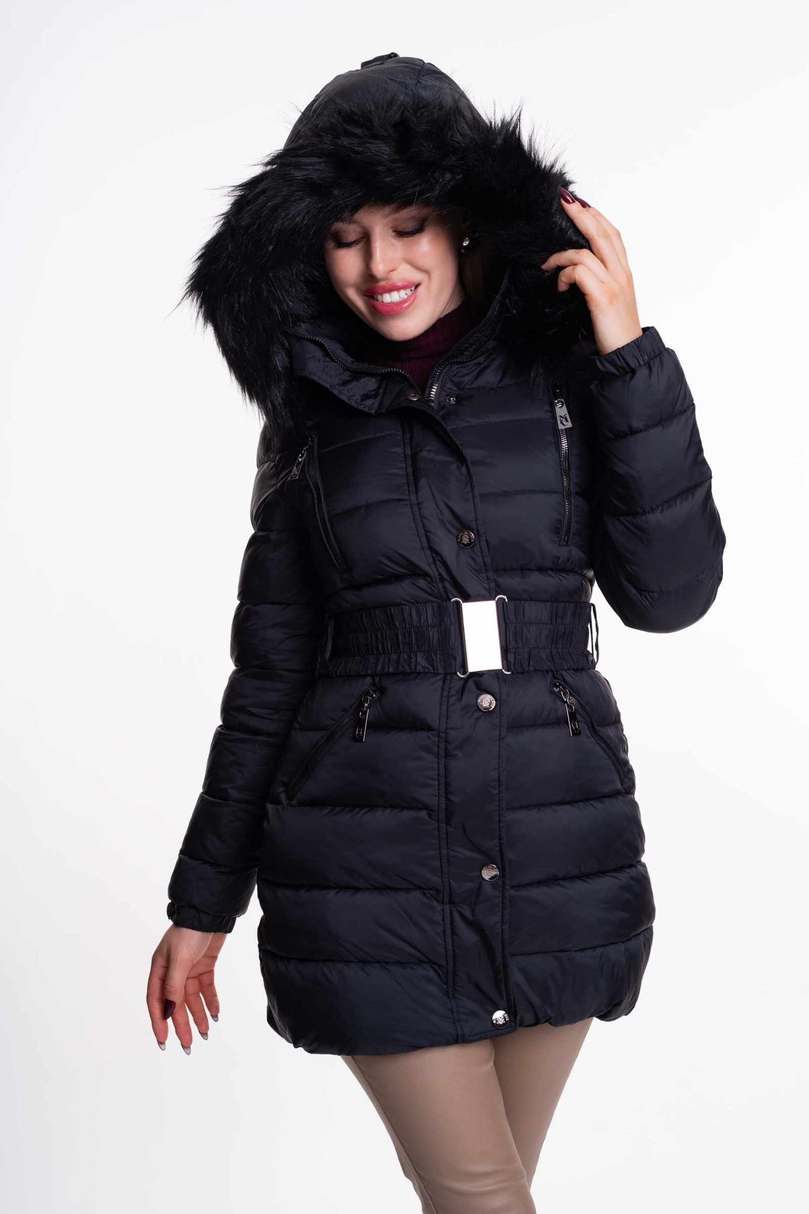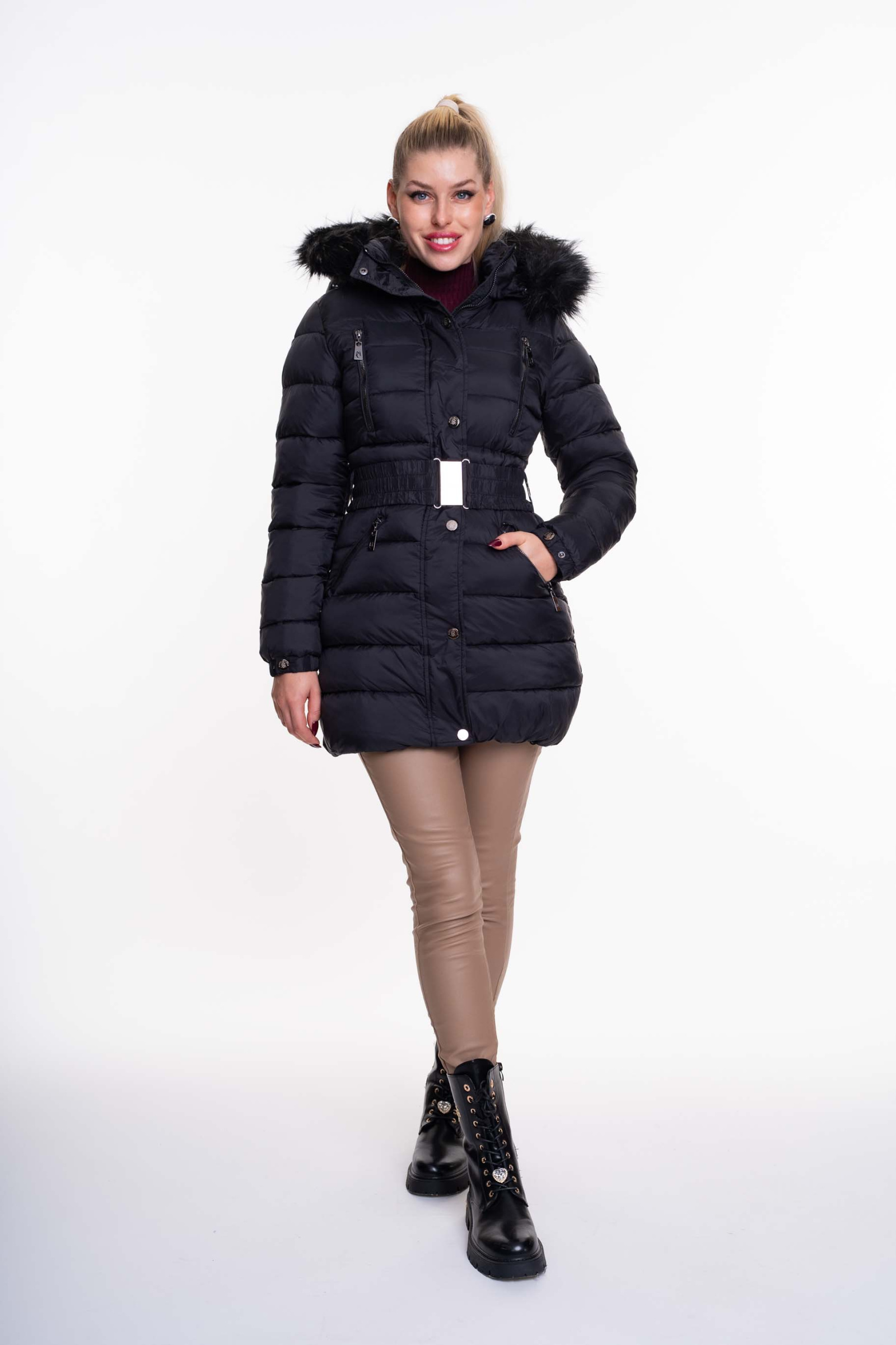 Karcsúsított, hátán hímzett steppelt pufikabát övvel, lepatentolható műszőrme gallérral, lecippzározható kapucnival, ujján fém márkajelzéssel.
