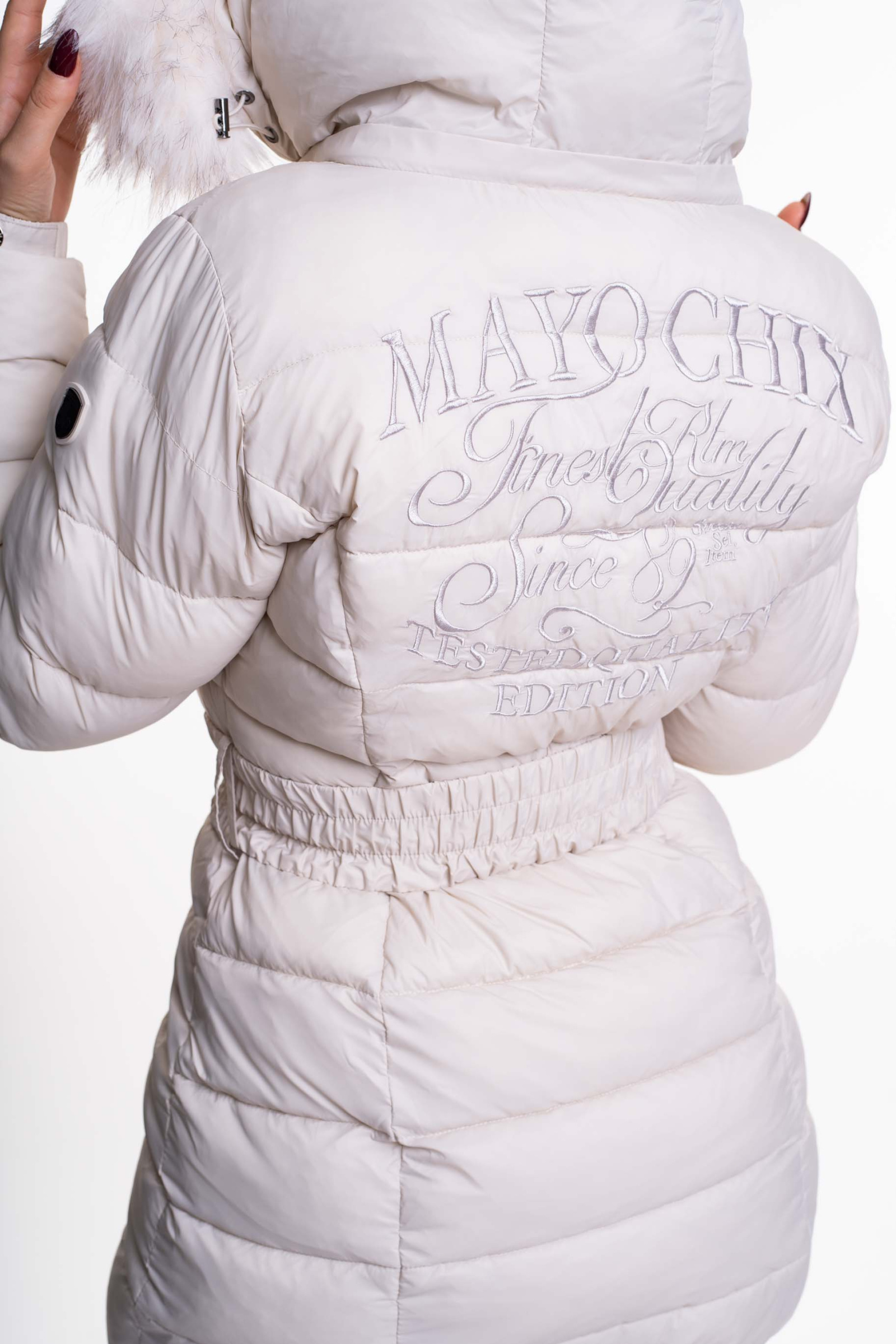 Karcsúsított, hátán hímzett steppelt pufikabát övvel, lepatentolható műszőrme gallérral, lecippzározható kapucnival, ujján fém márkajelzéssel.