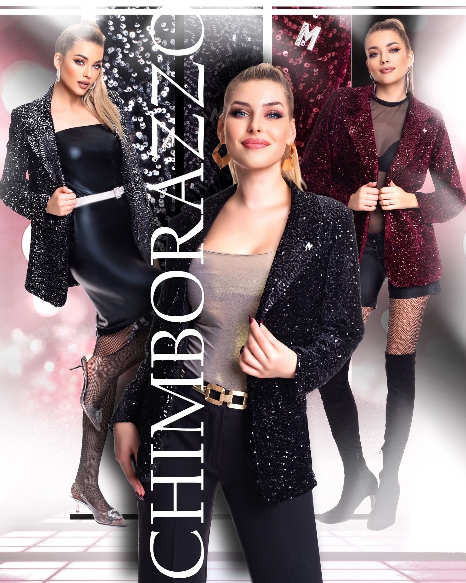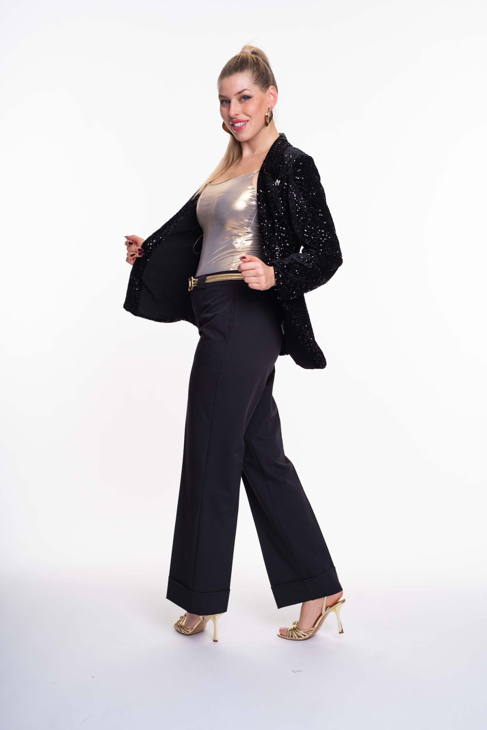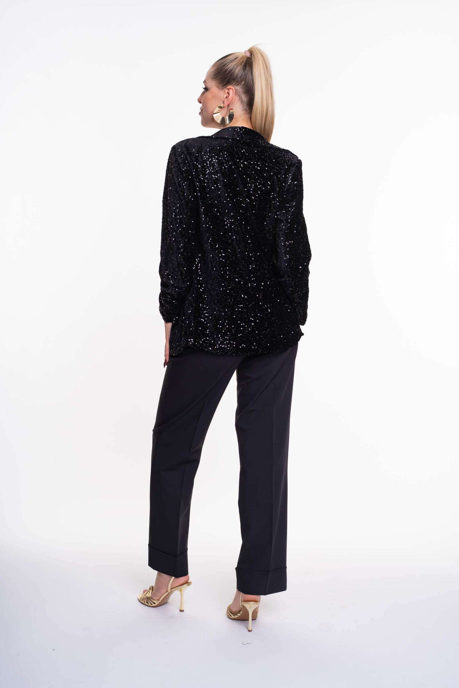 Flitterezett bársony anyagból készült nyitott blézer válltöméssel, levehető bross kiegészítővel.