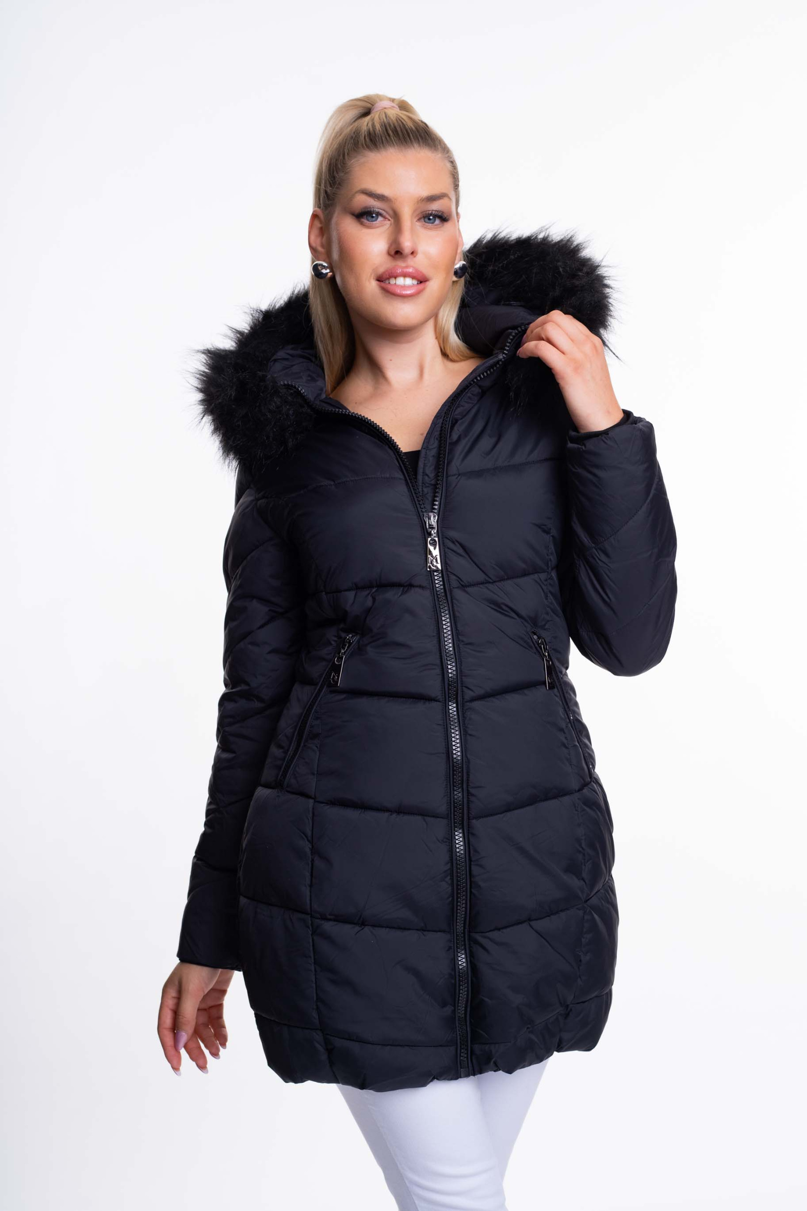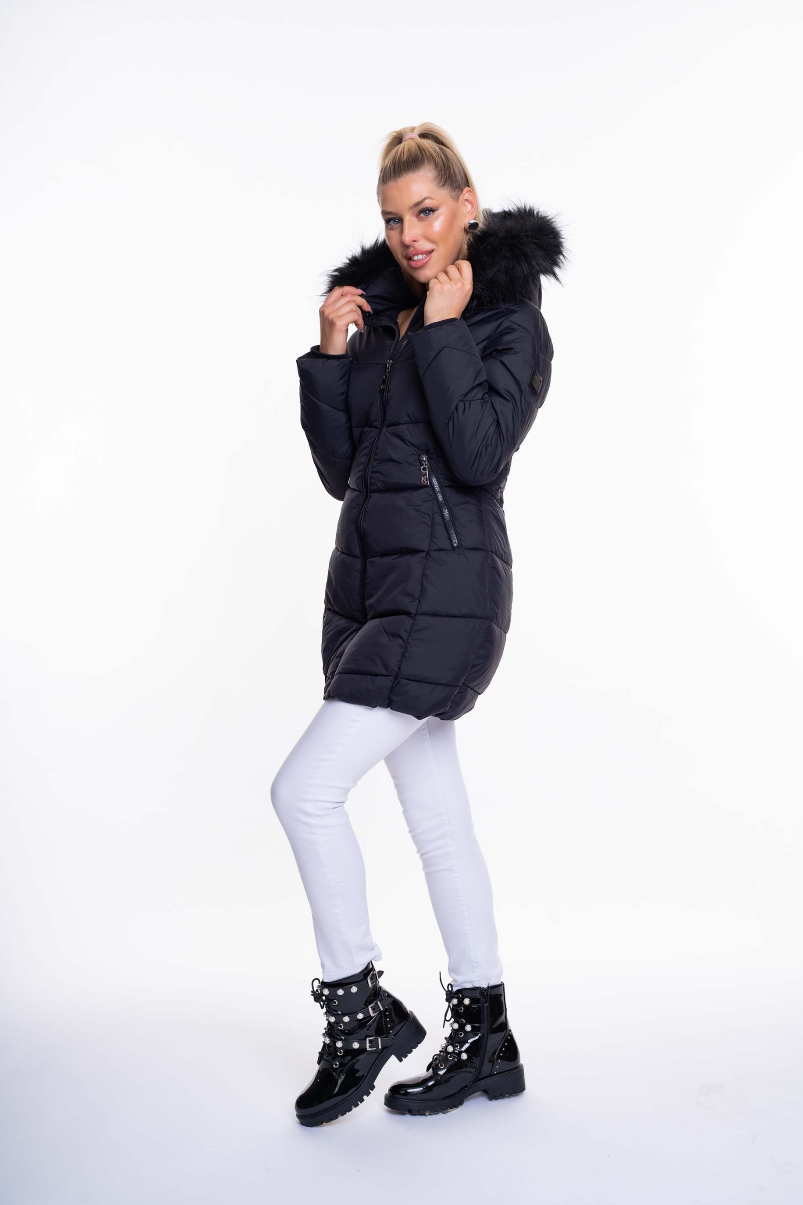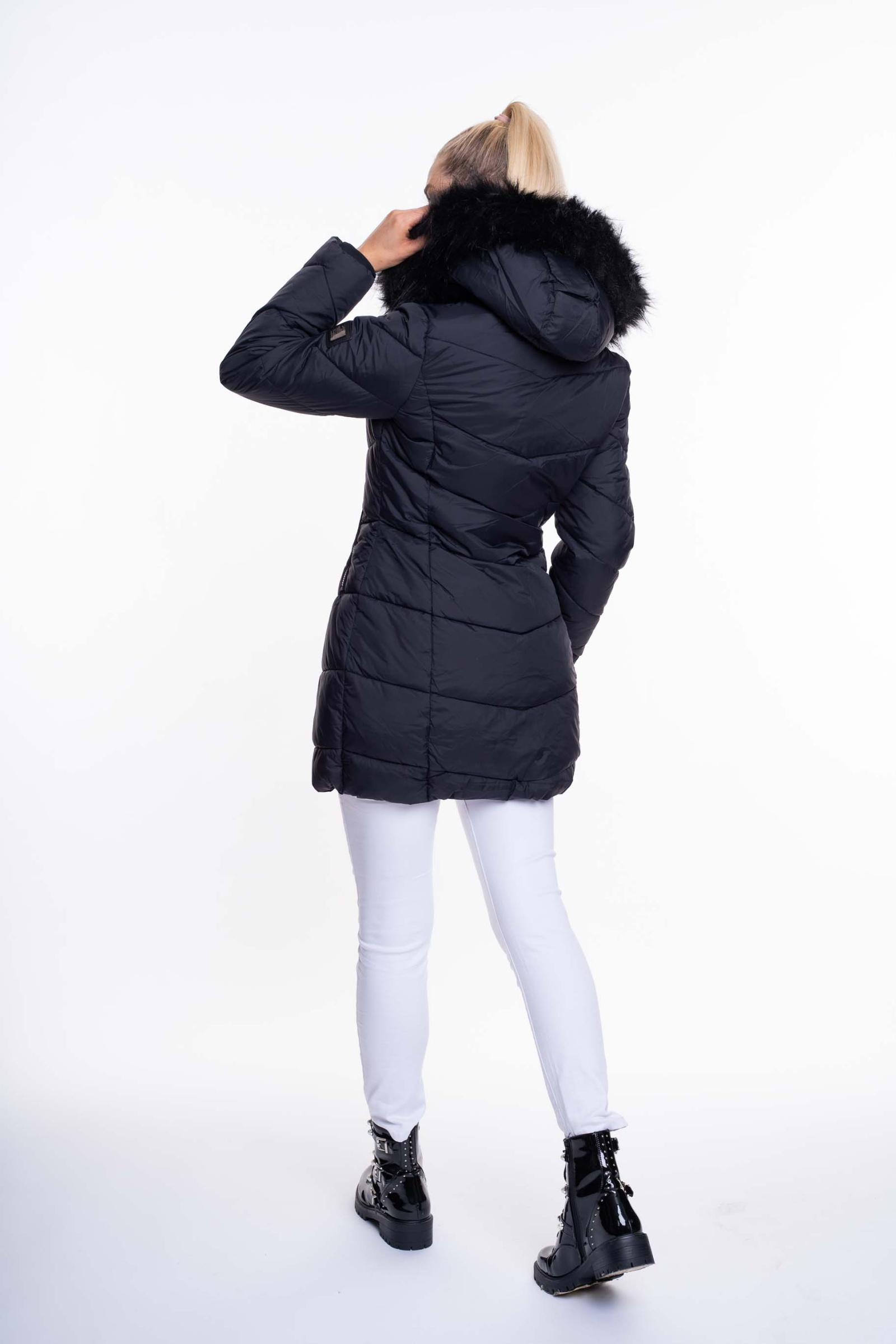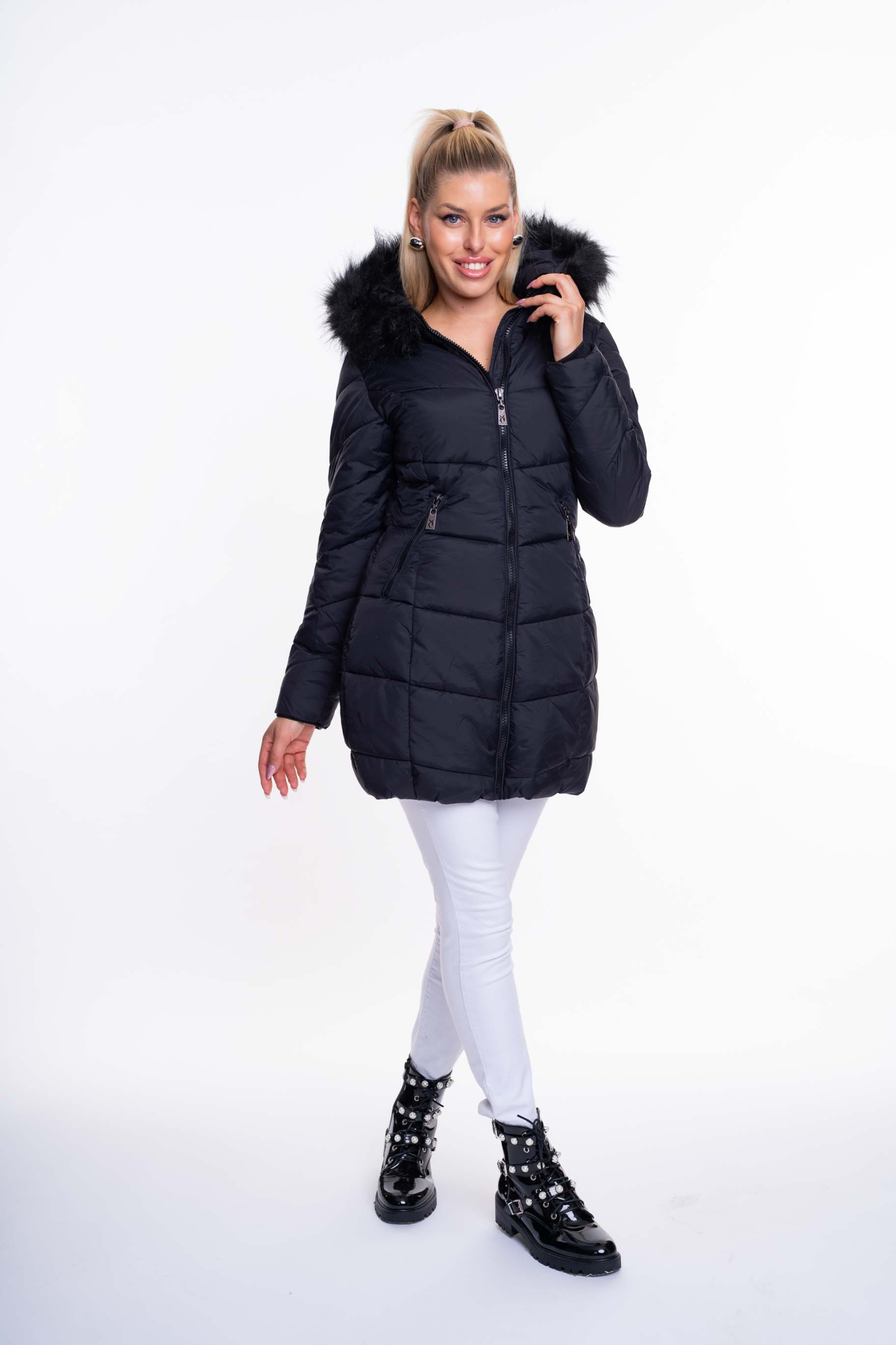 Karcsúsított fazonú télikabát, legombolható műszőrmével, alján behúzóval, ujján fém márkajelzéssel.