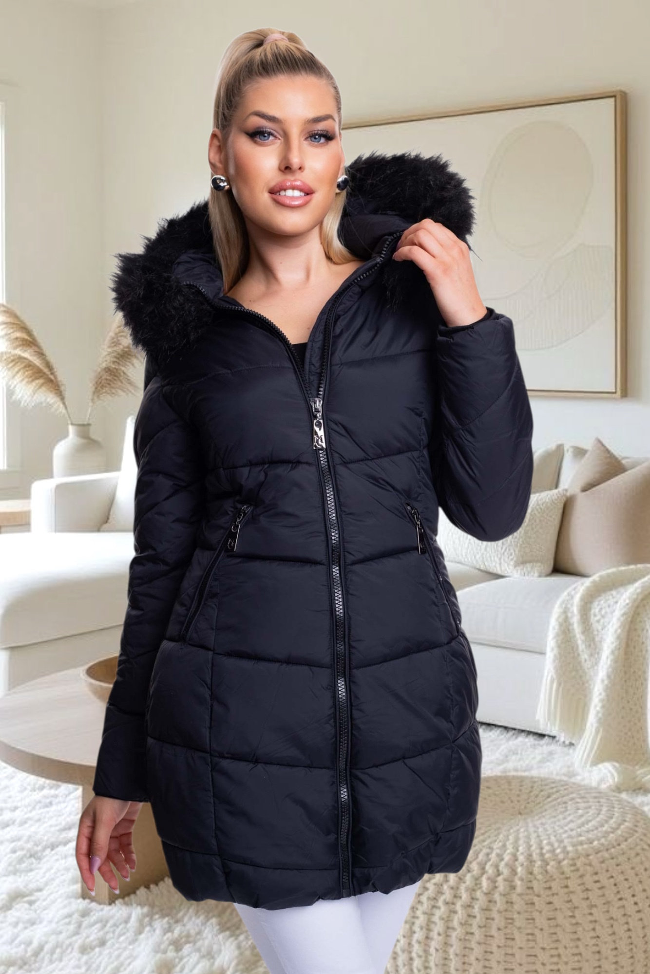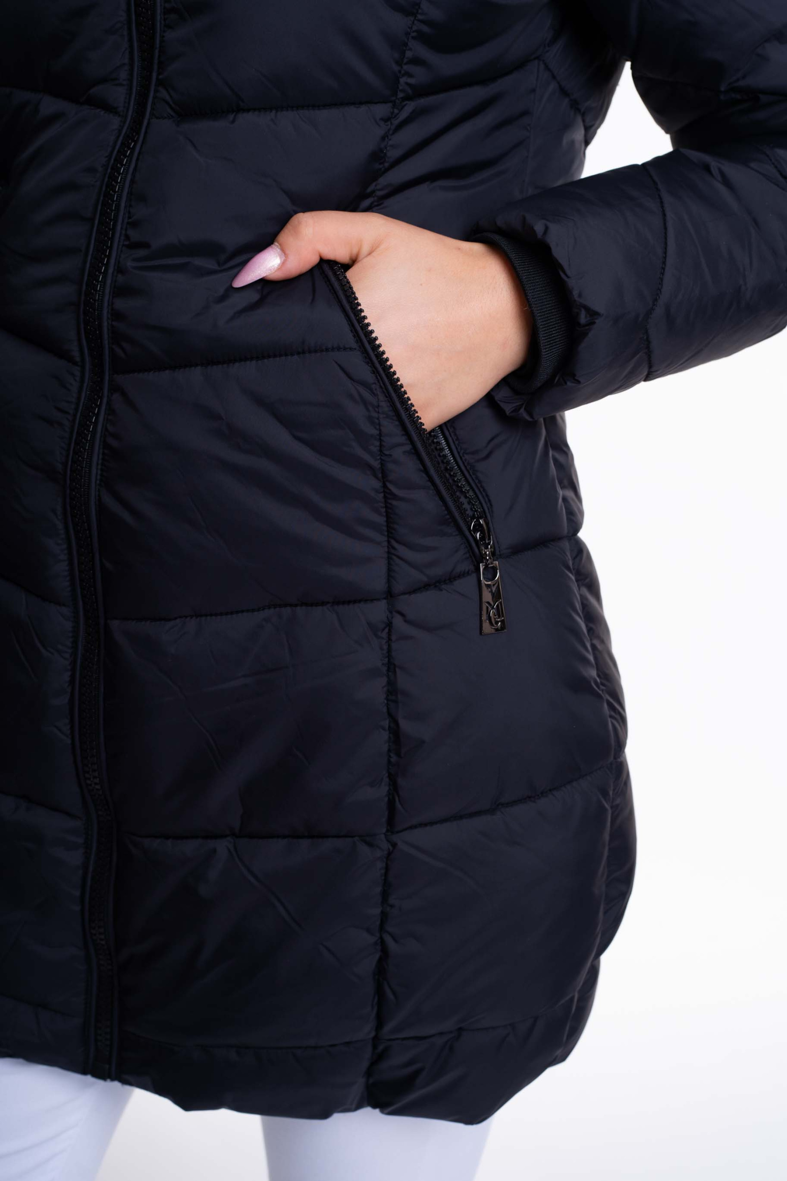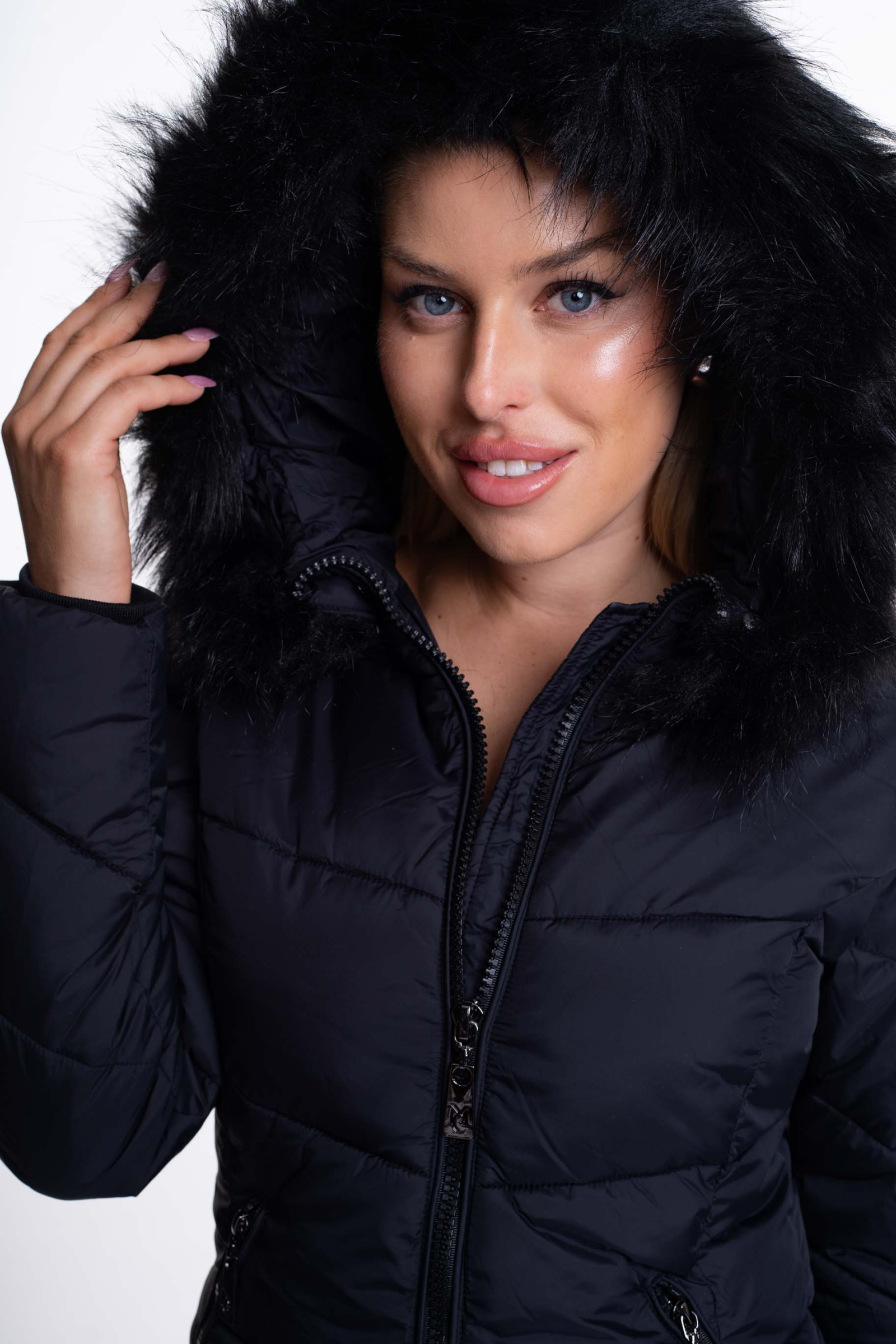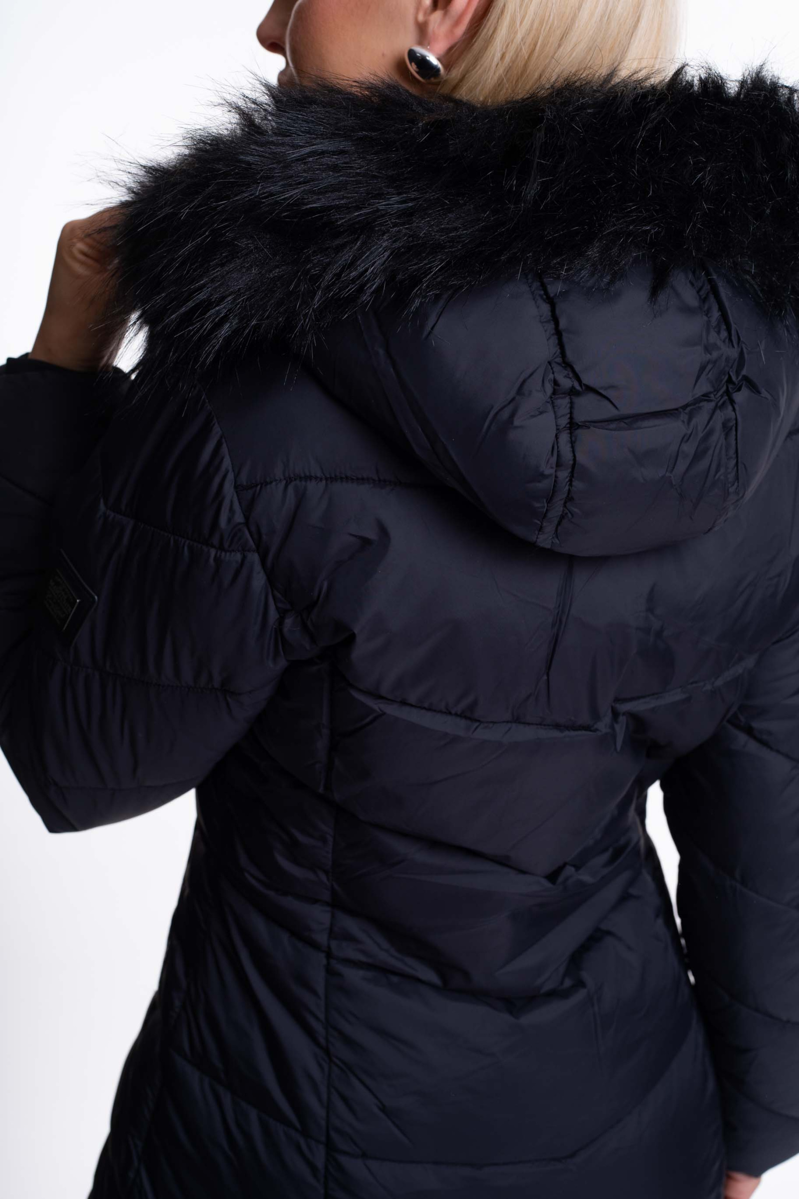 Karcsúsított fazonú télikabát, legombolható műszőrmével, alján behúzóval, ujján fém márkajelzéssel.