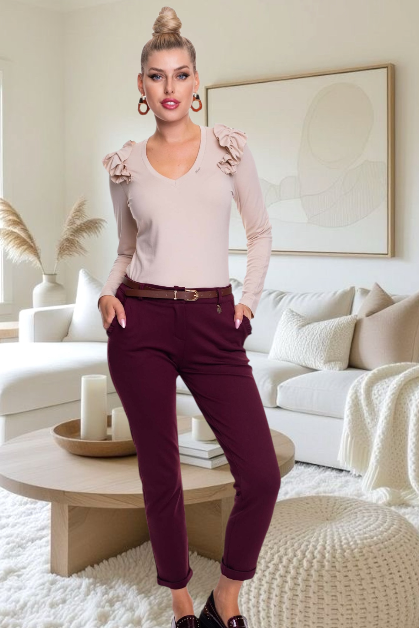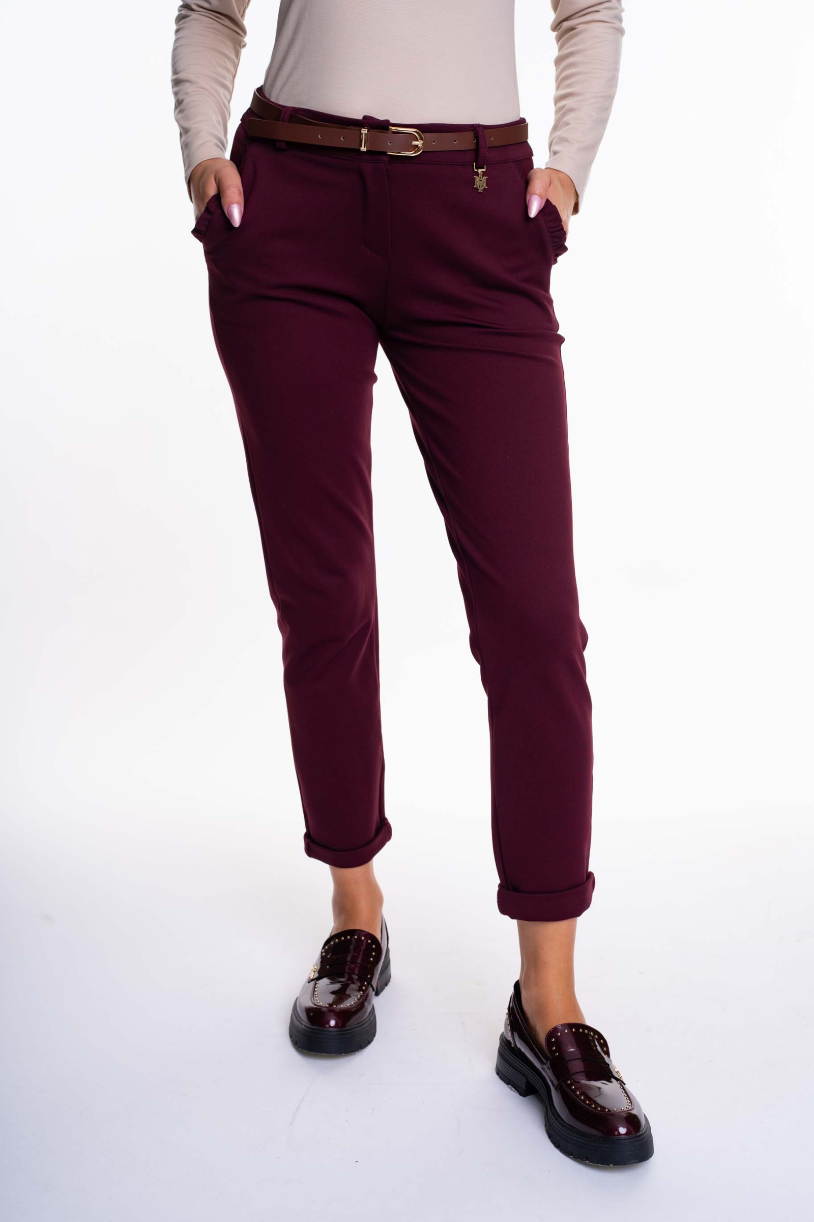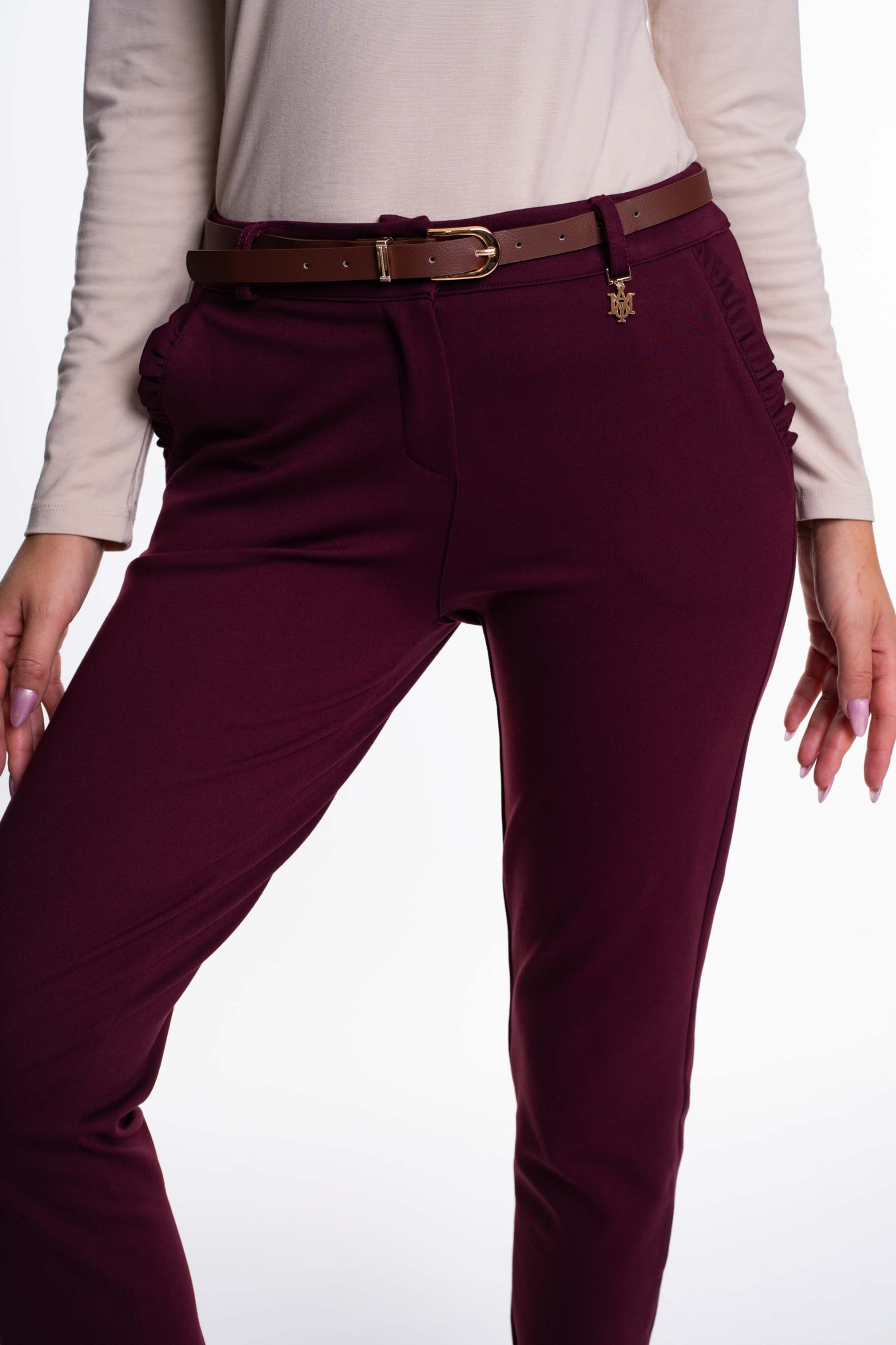 Elasztikus anyagból készült nadrág, zsebei fodros díszítéssel, öv kiegészítővel, mosáshoz levehető kis fém márkajelzéssel.