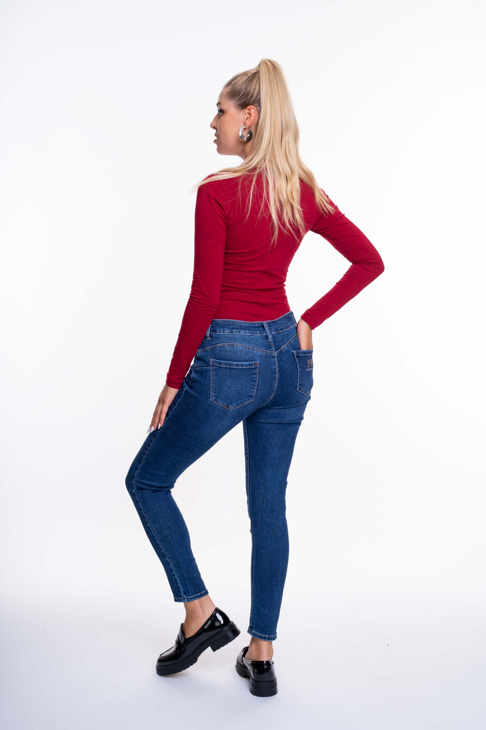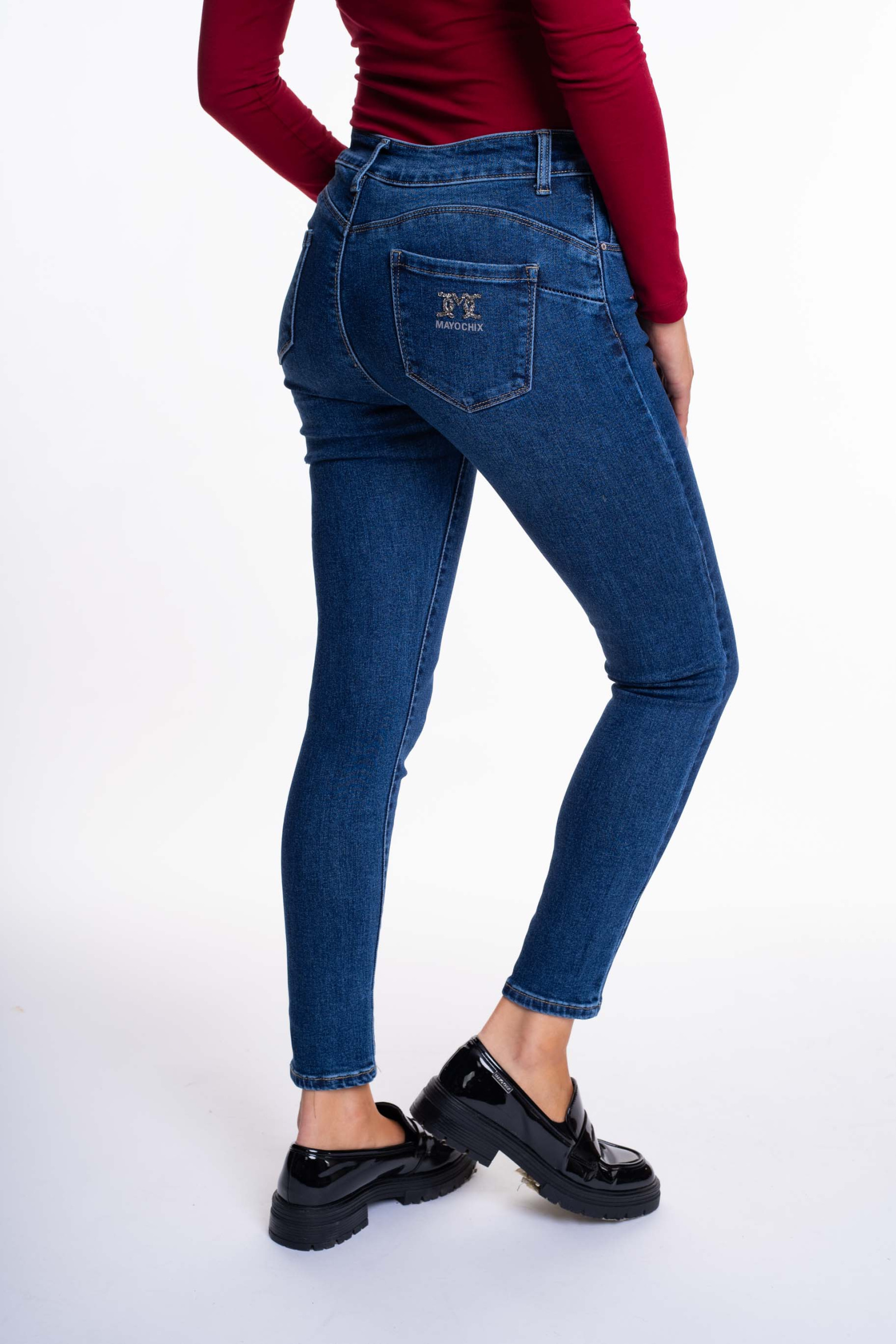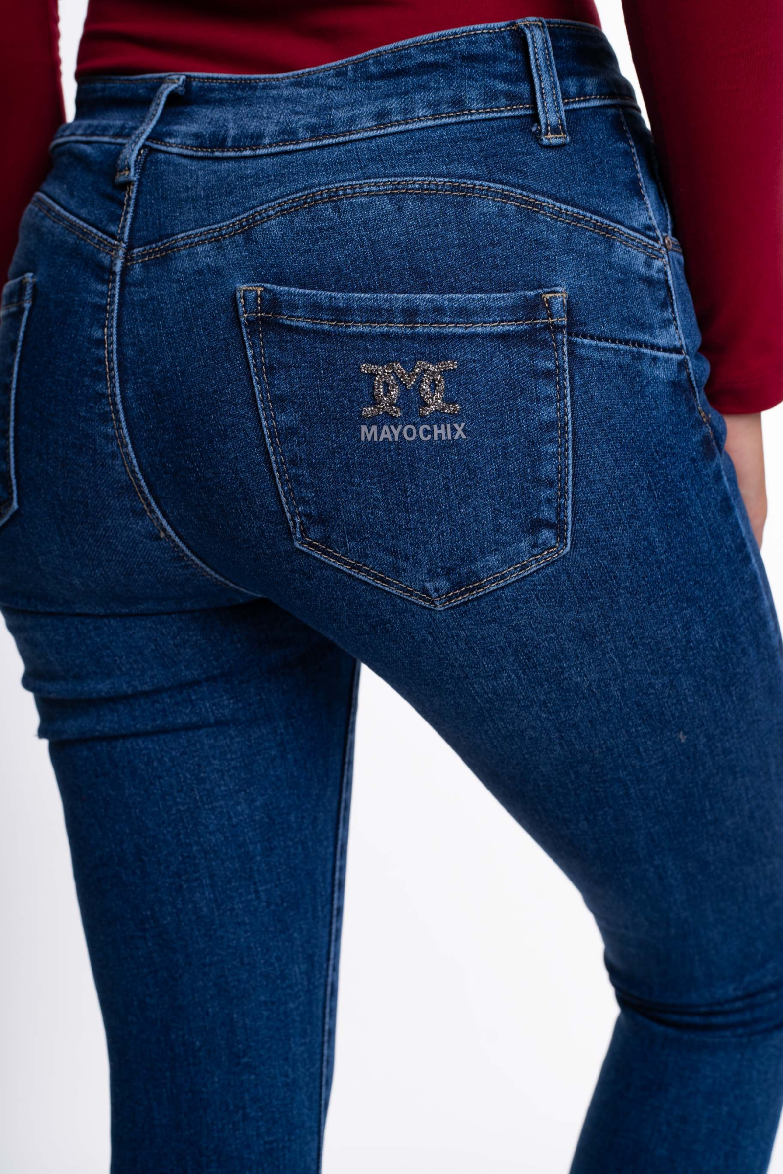 Elasztikus anyagból készült, szűk szárú farmernadrág, strasszköves matricanyomott márkajelzéssel.