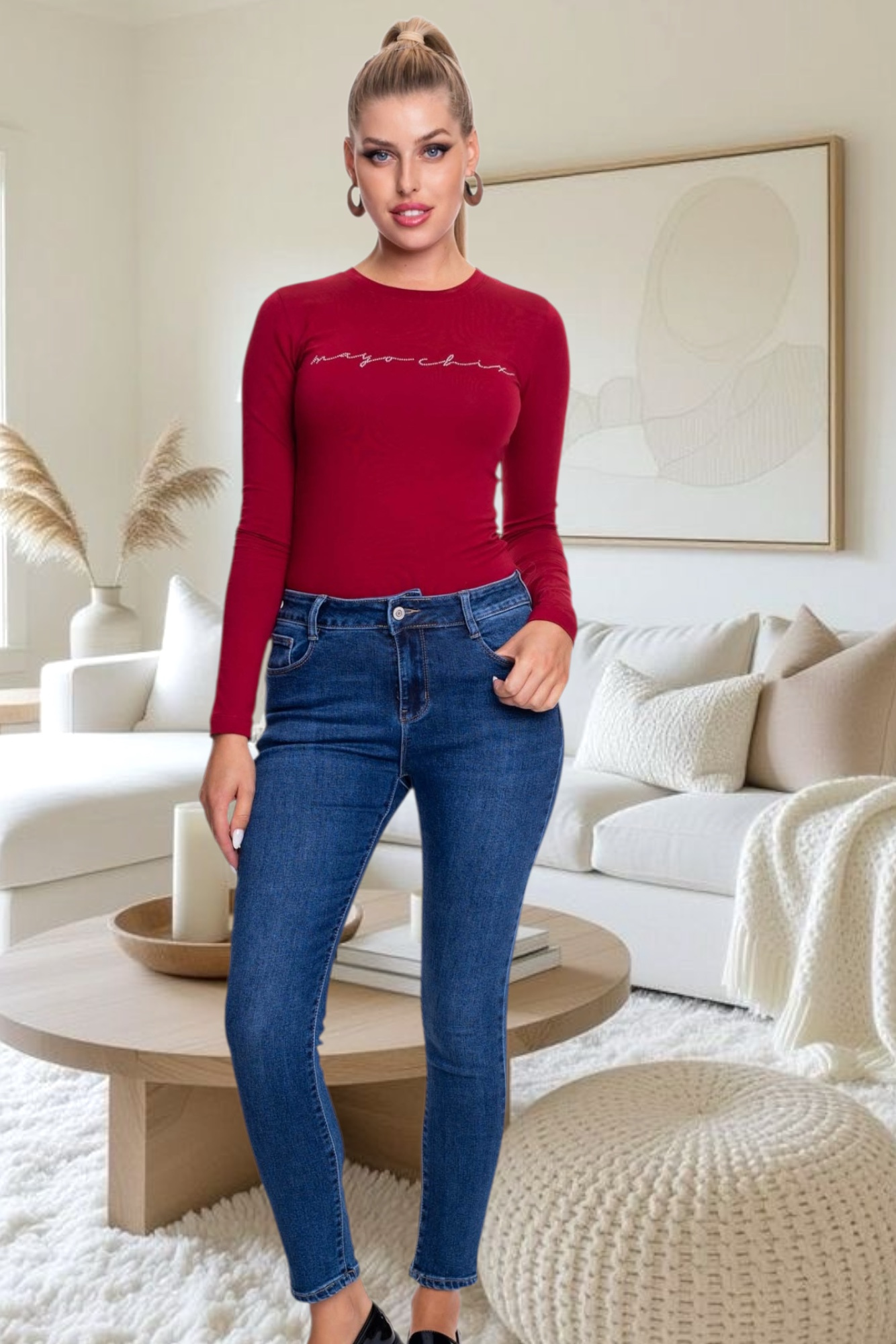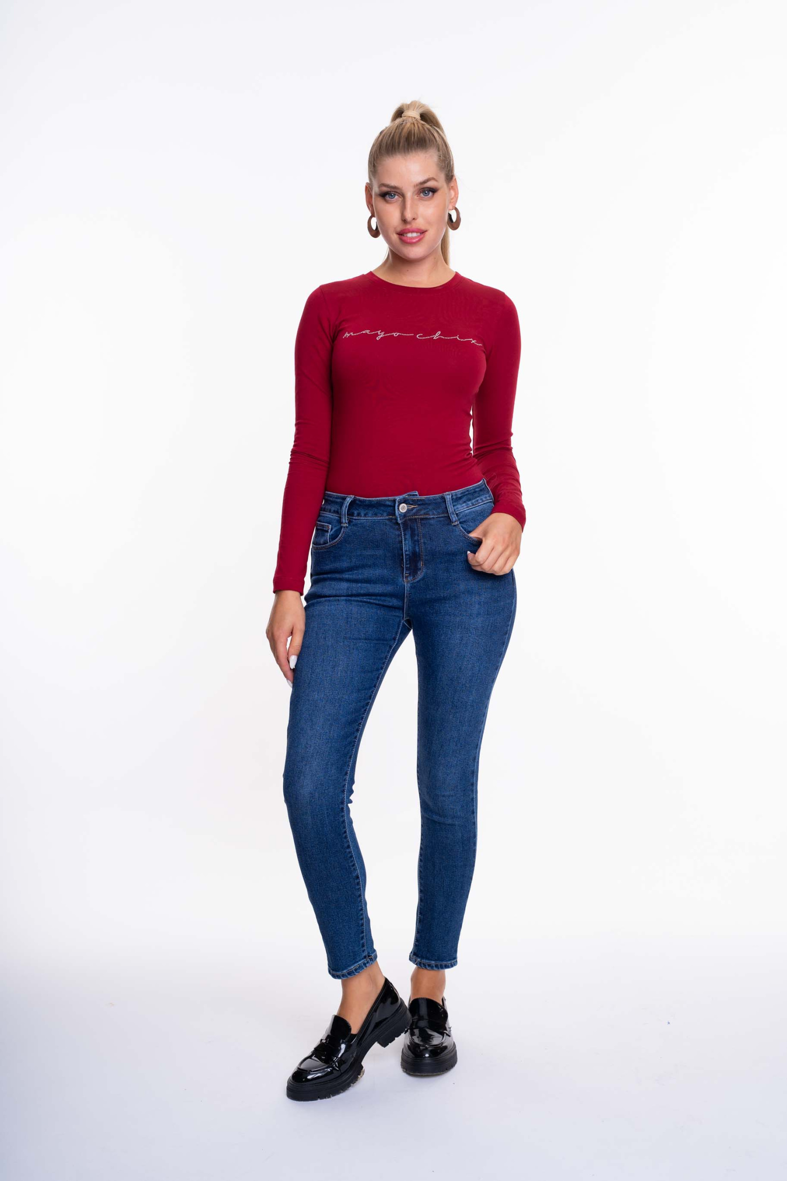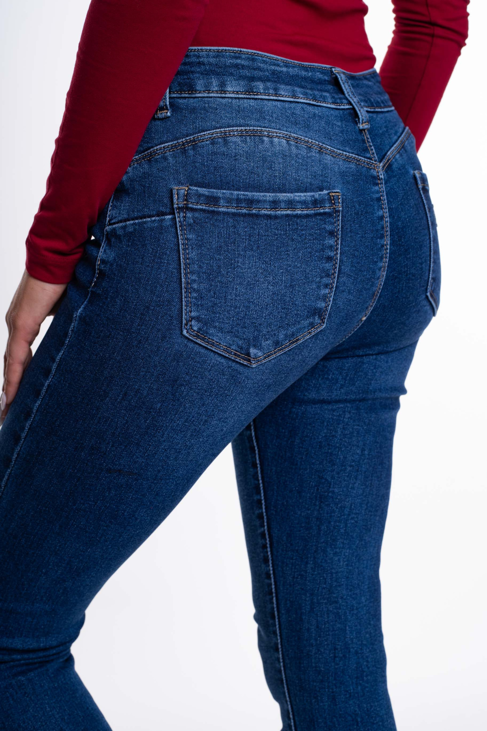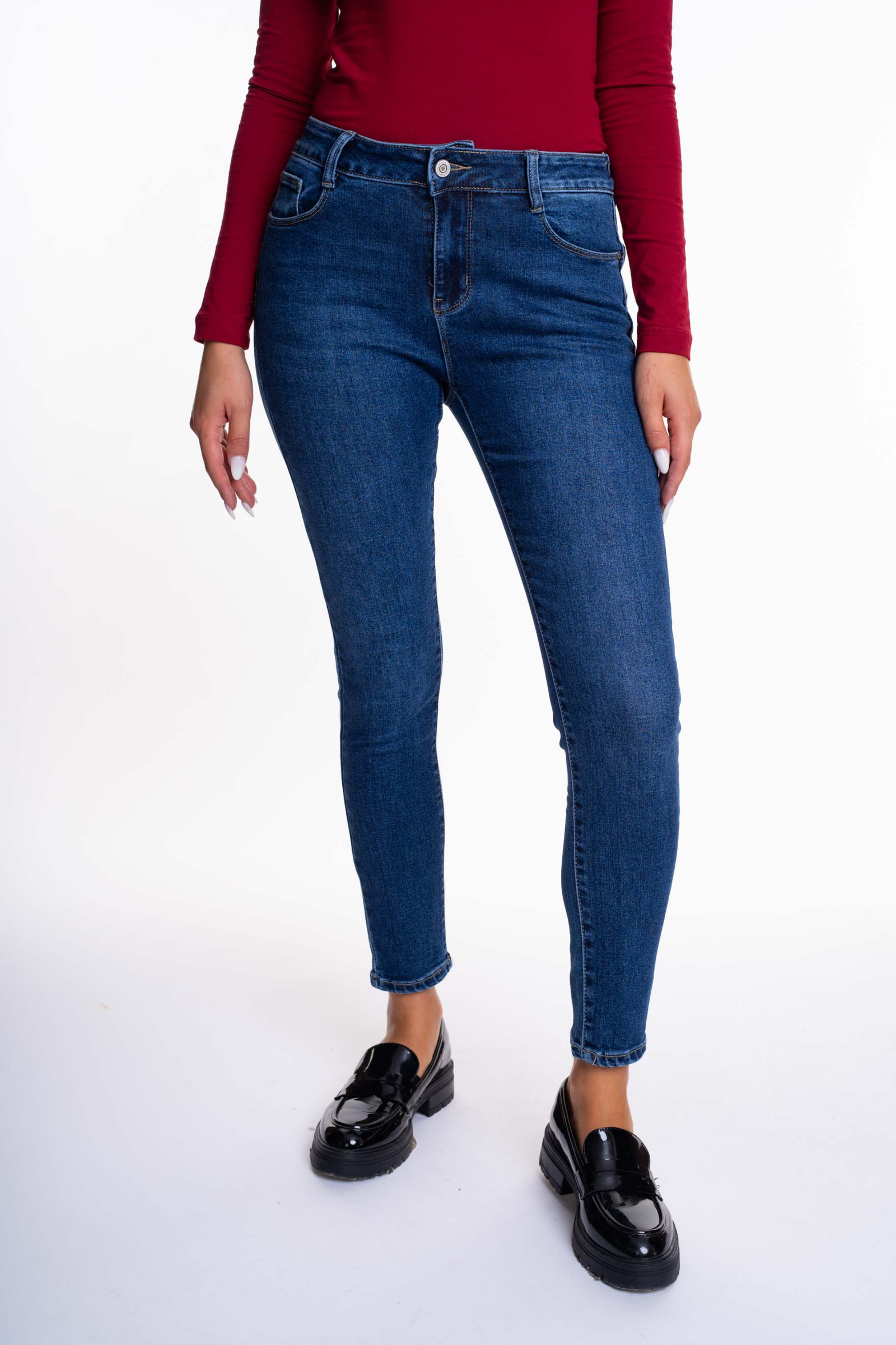 Elasztikus anyagból készült, szűk szárú farmernadrág, strasszköves matricanyomott márkajelzéssel.