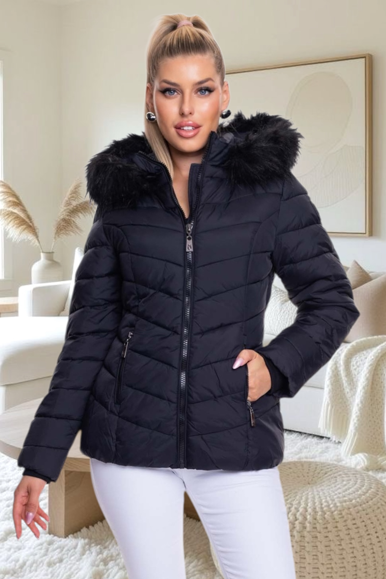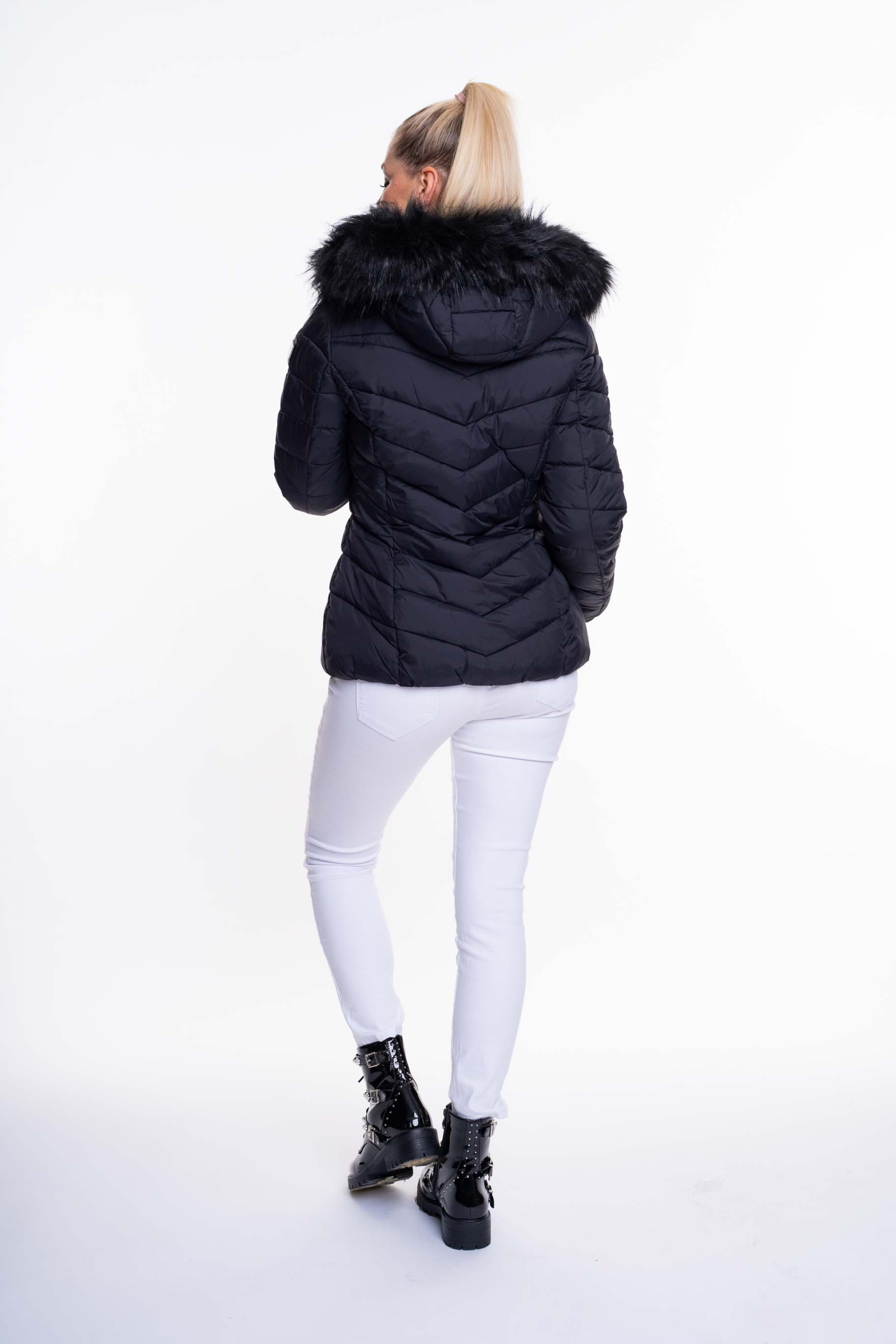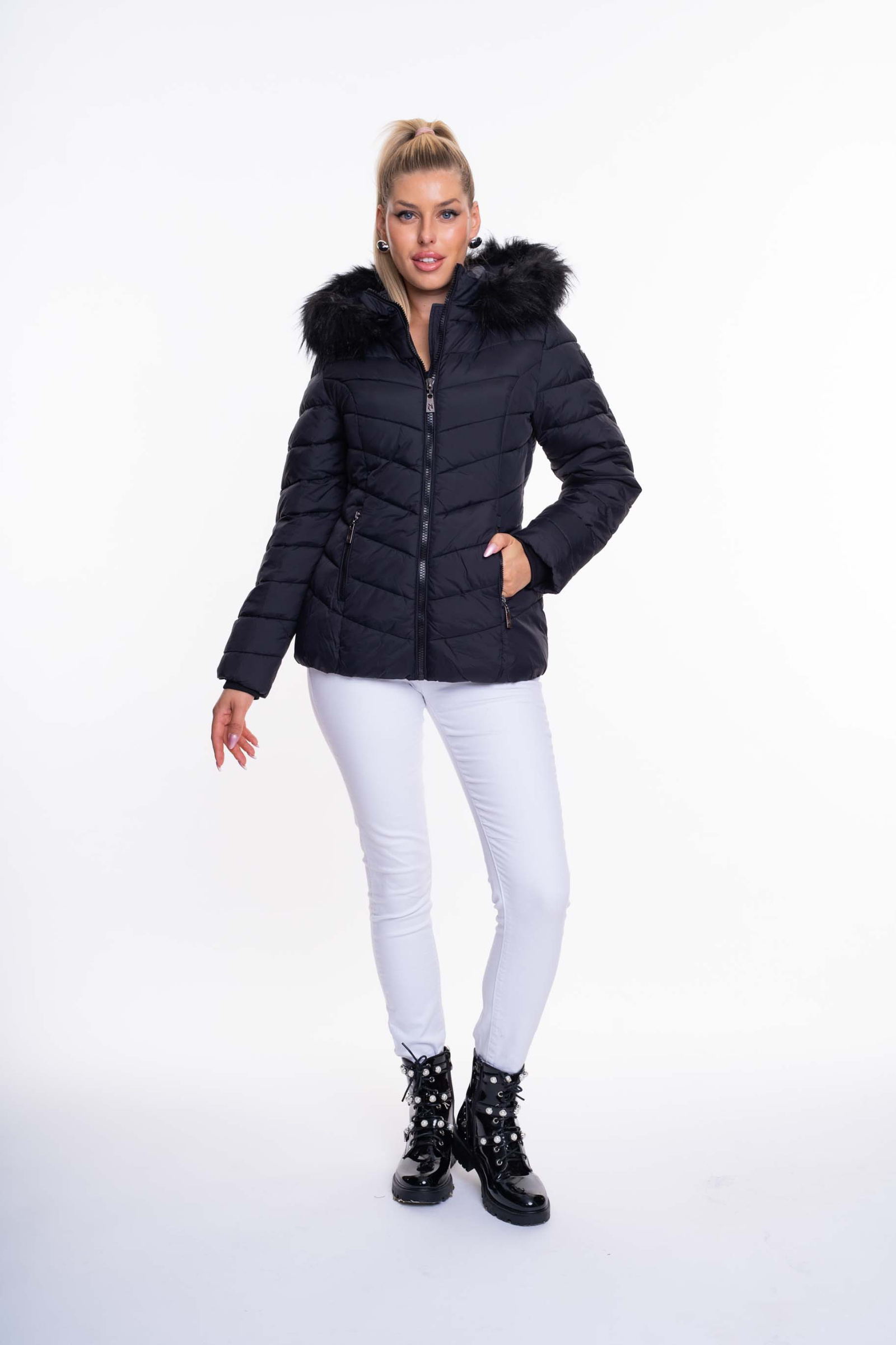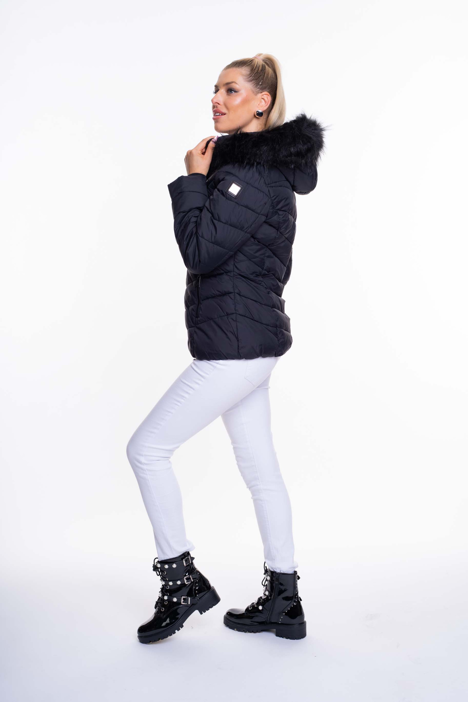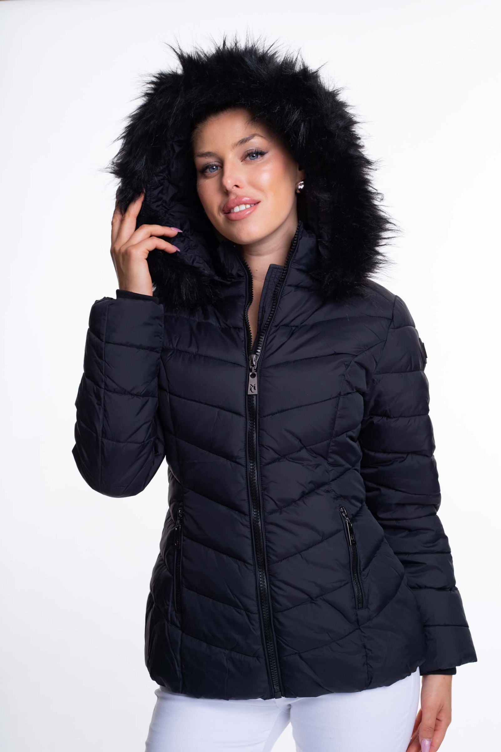 Karcsúsított, rövid fazonú télikabát, legombolható műszőrmével, ujján fém márkajelzéssel.