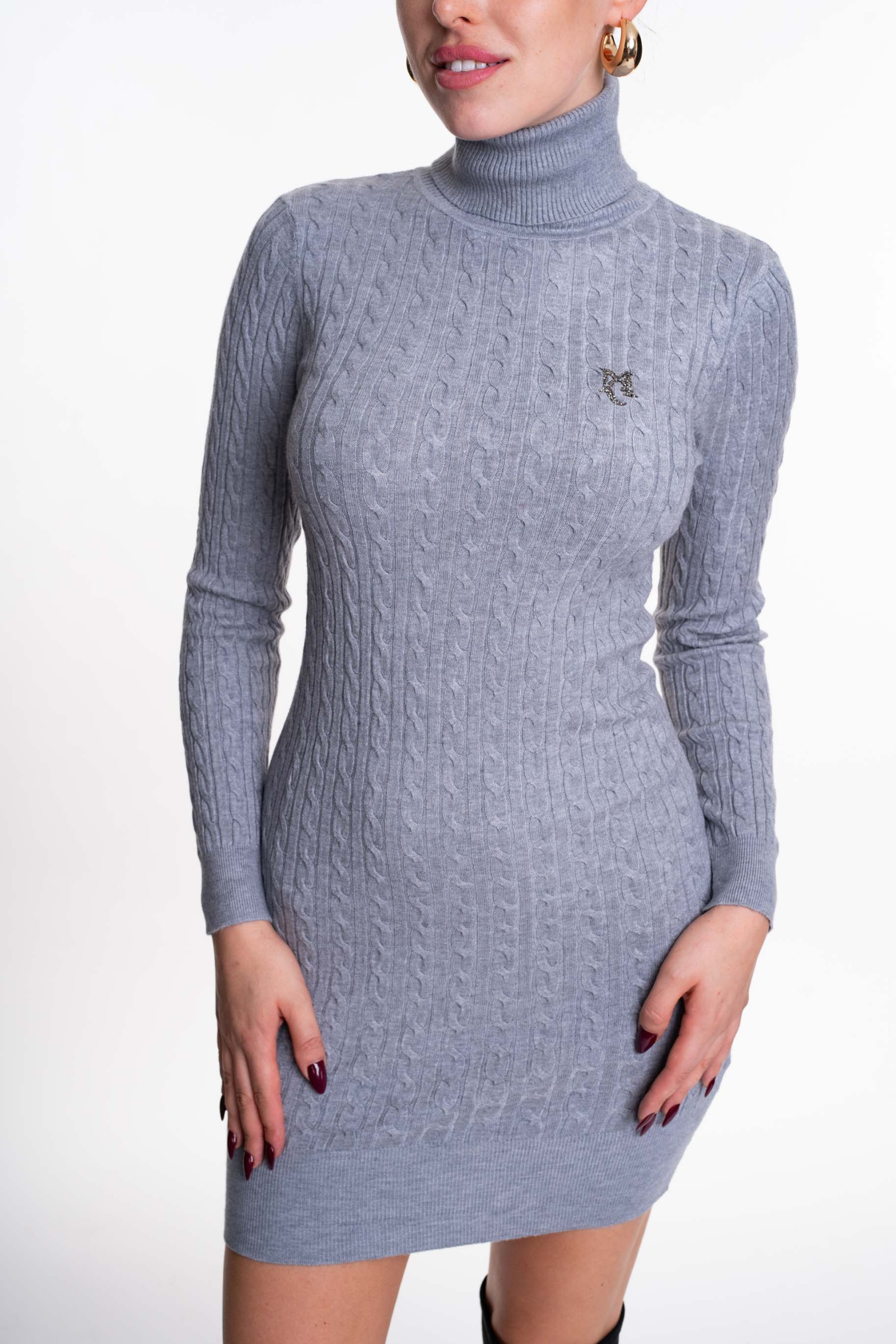 Karcsúsított fazonú, garbós kötött ruha, anyagában kötött mintával, strasszos matricanyomott márkajelzéssel.
