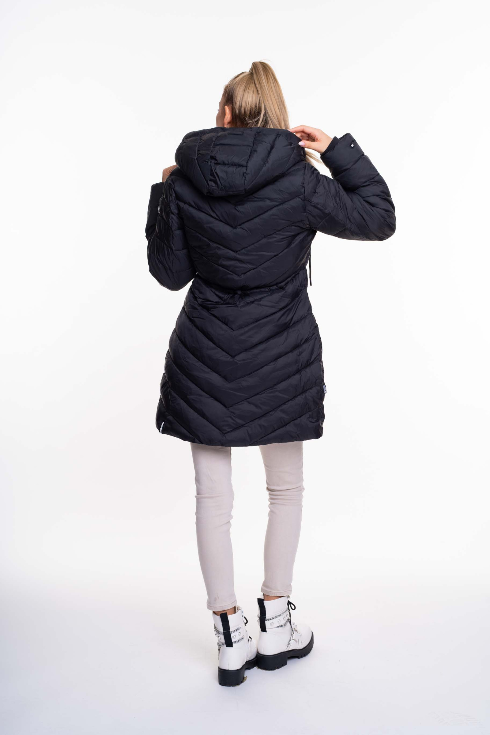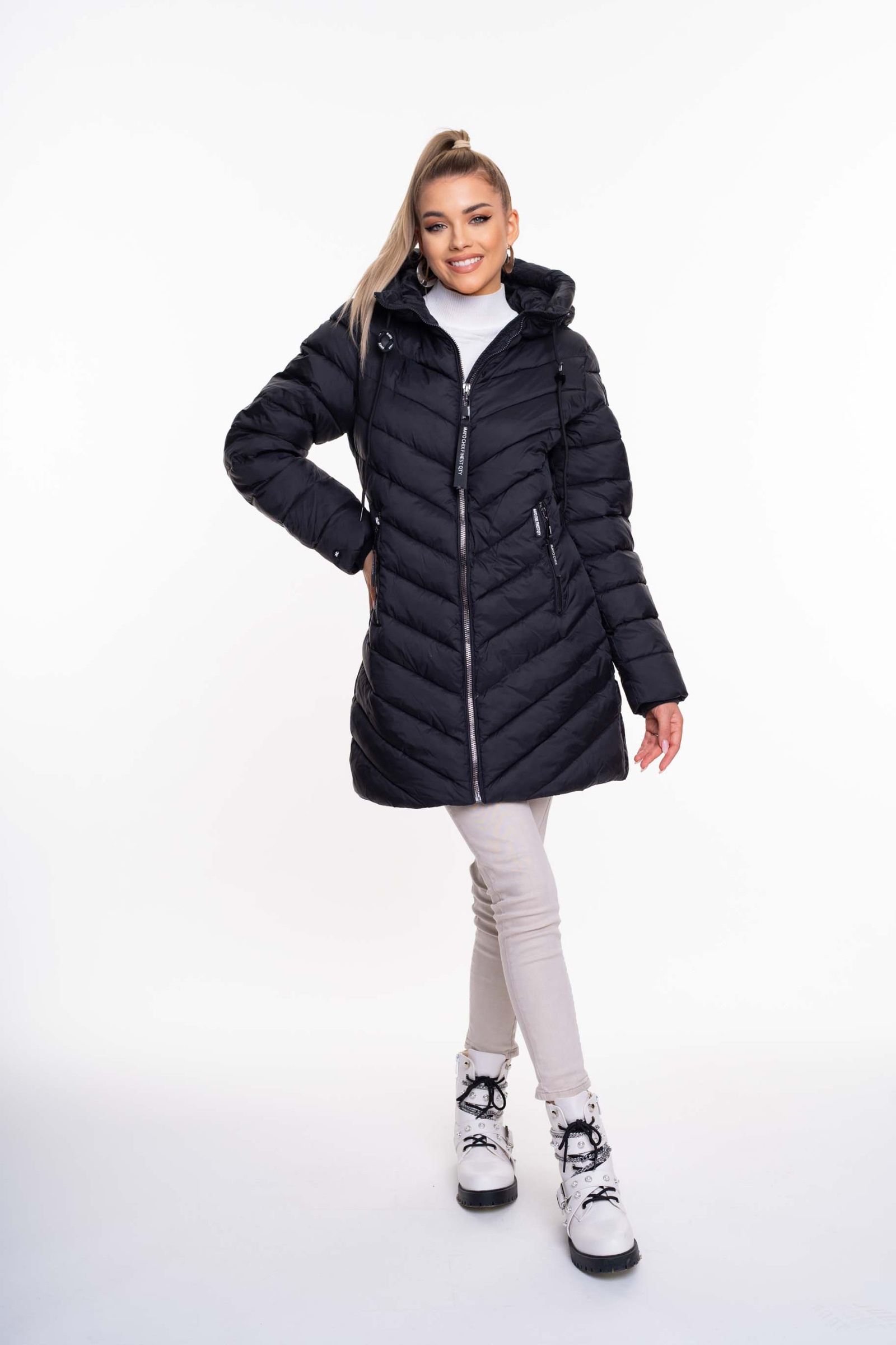 Karcsúsított, steppelt pufi kabát fix kapucnival, márkajelzett cippzárhúzókkal, ujján applikált márkajelzéssel.
