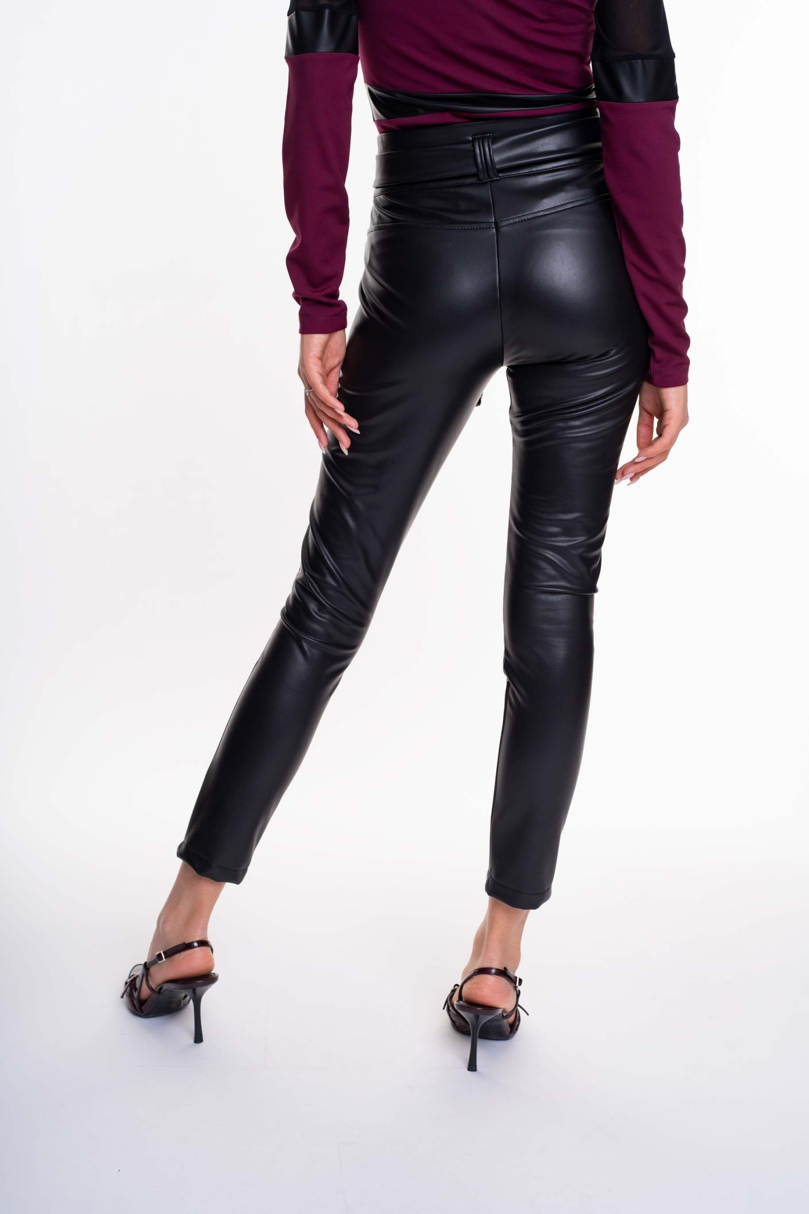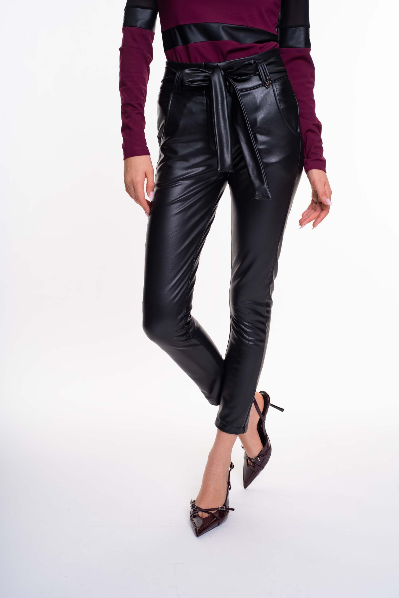 Elasztikus műbőrből készült szűk szárú nadrág zsebekkel, saját anyagából készült megkötővel, mosáshoz levehető kis fém márkajelzéssel.