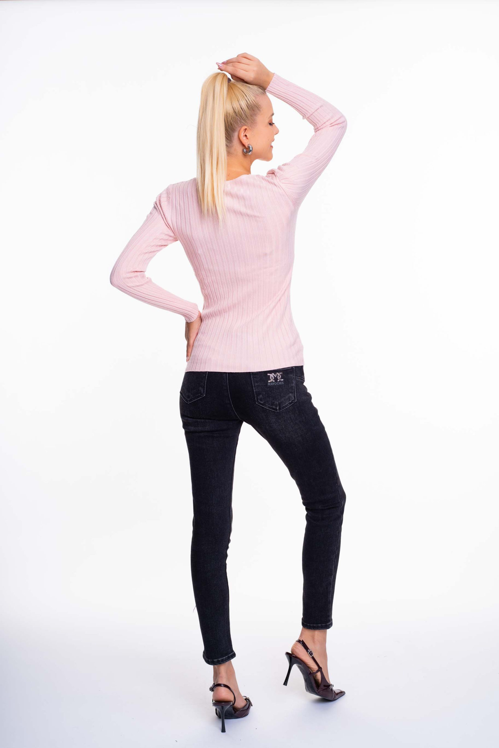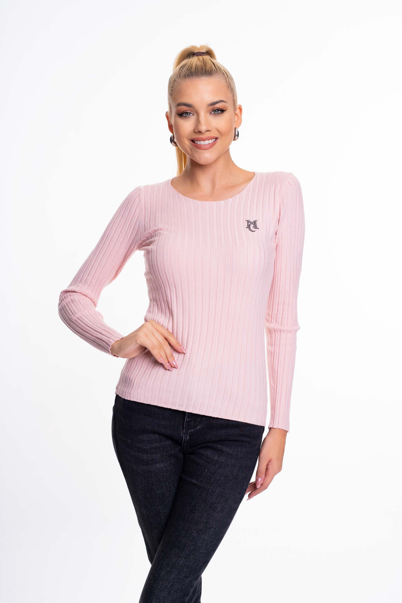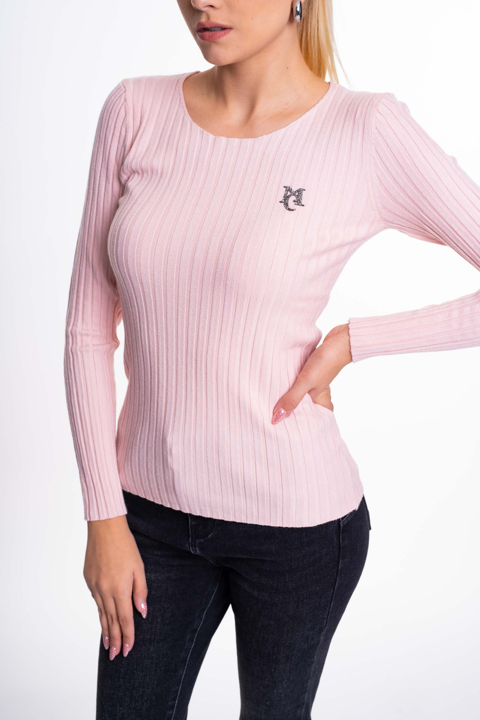 Vékony, bordás kötött anyagú pulóver, strasszköves matrica márkajelzéssel.