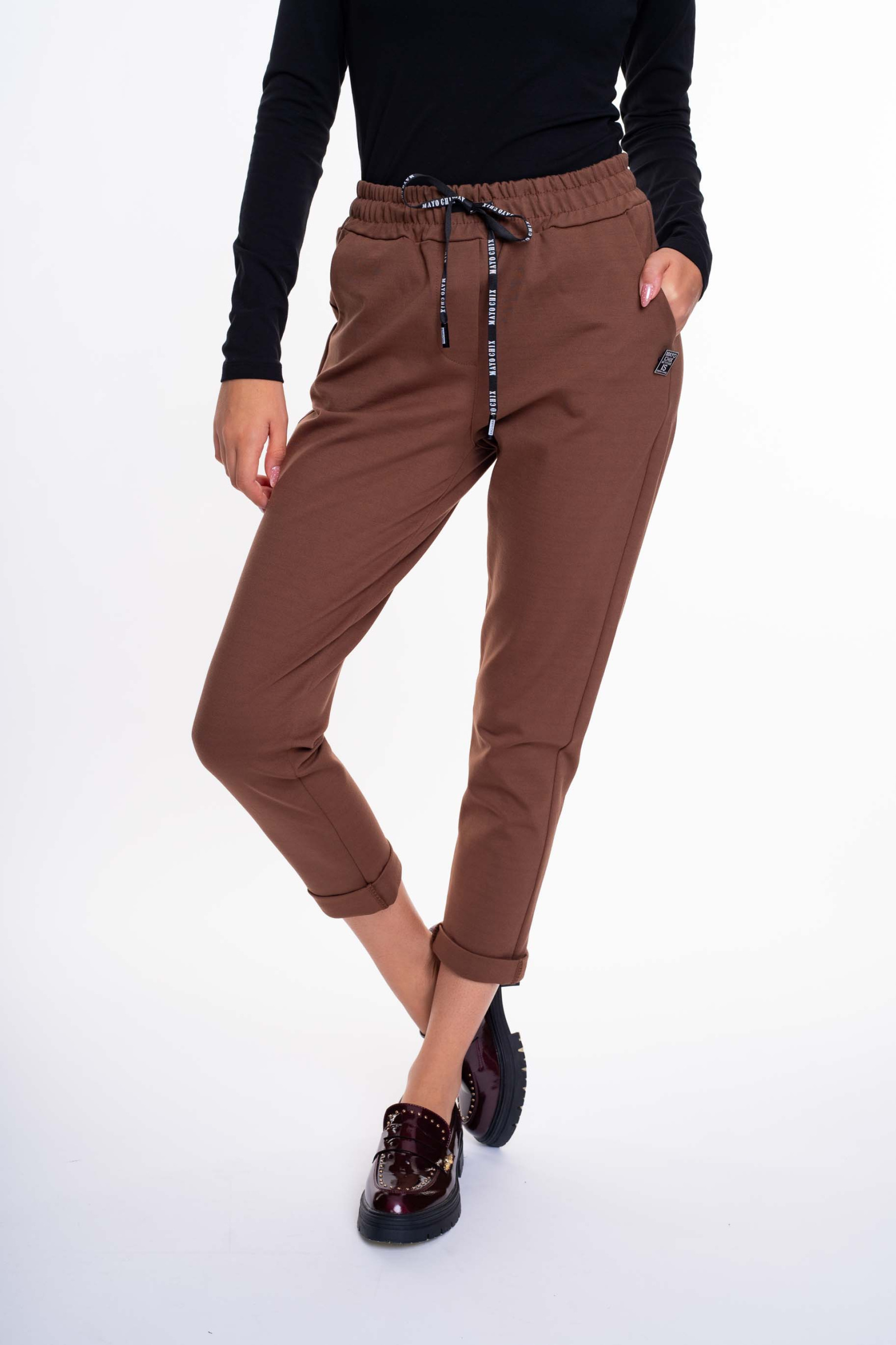 Elasztikus anyagból készült, svédzsebes nadrág gumis derékrésszel, márkajelzett megkötővel, mosáshoz levehető bross kiegészítővel.