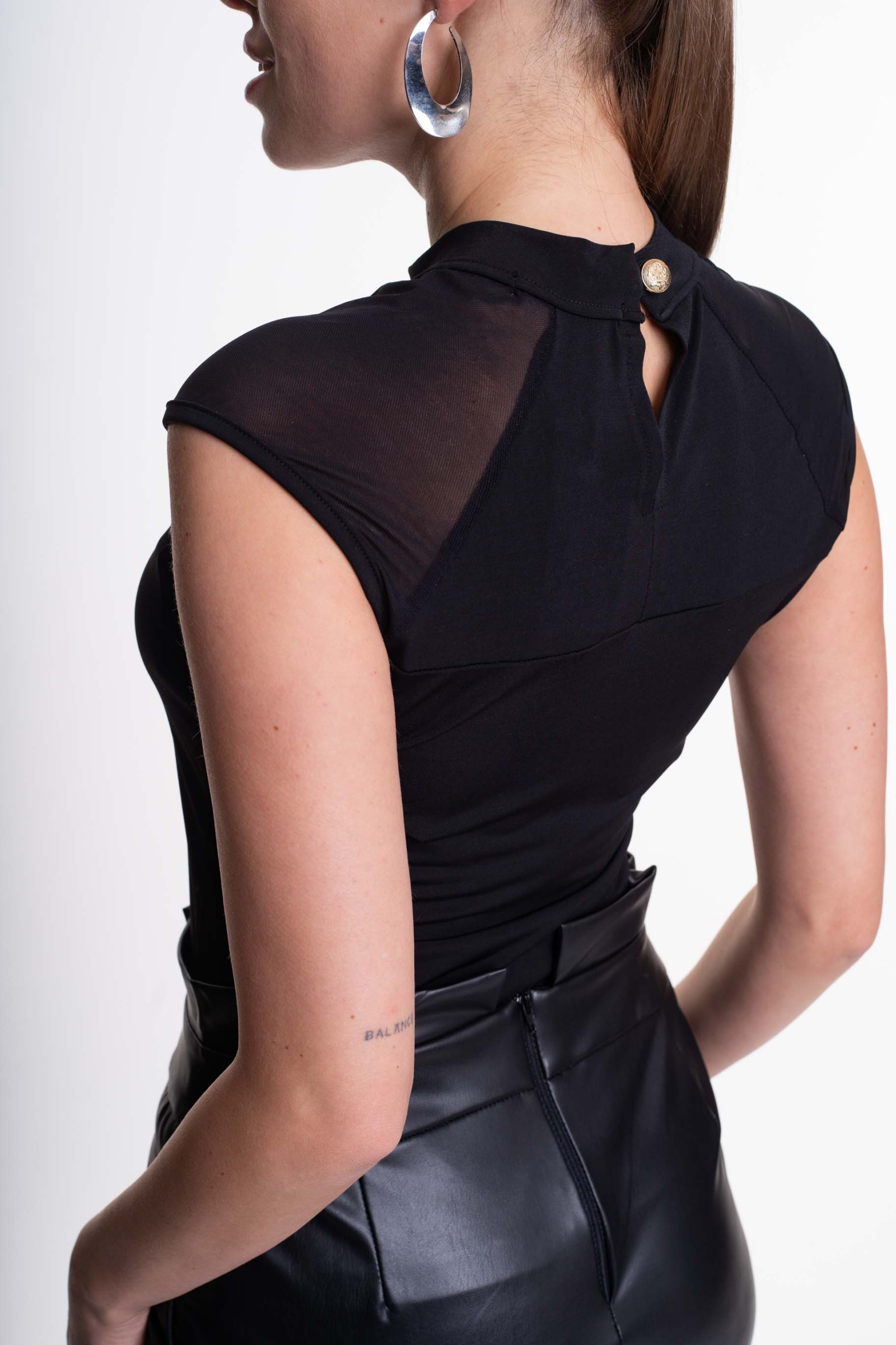 Elasztikus anyagból készült, karcsúsított fazonú felső necc anyaggal kombinálva, kis fém márkajelzéssel.