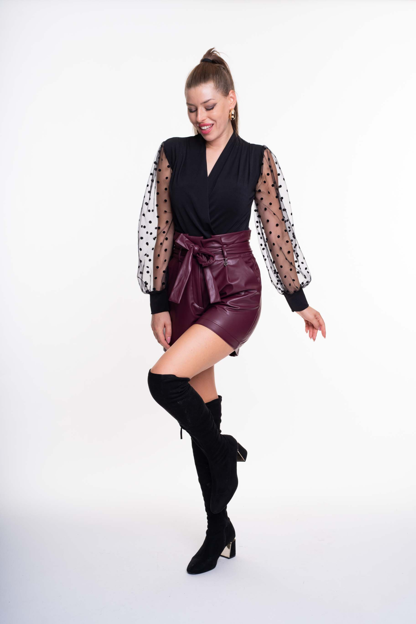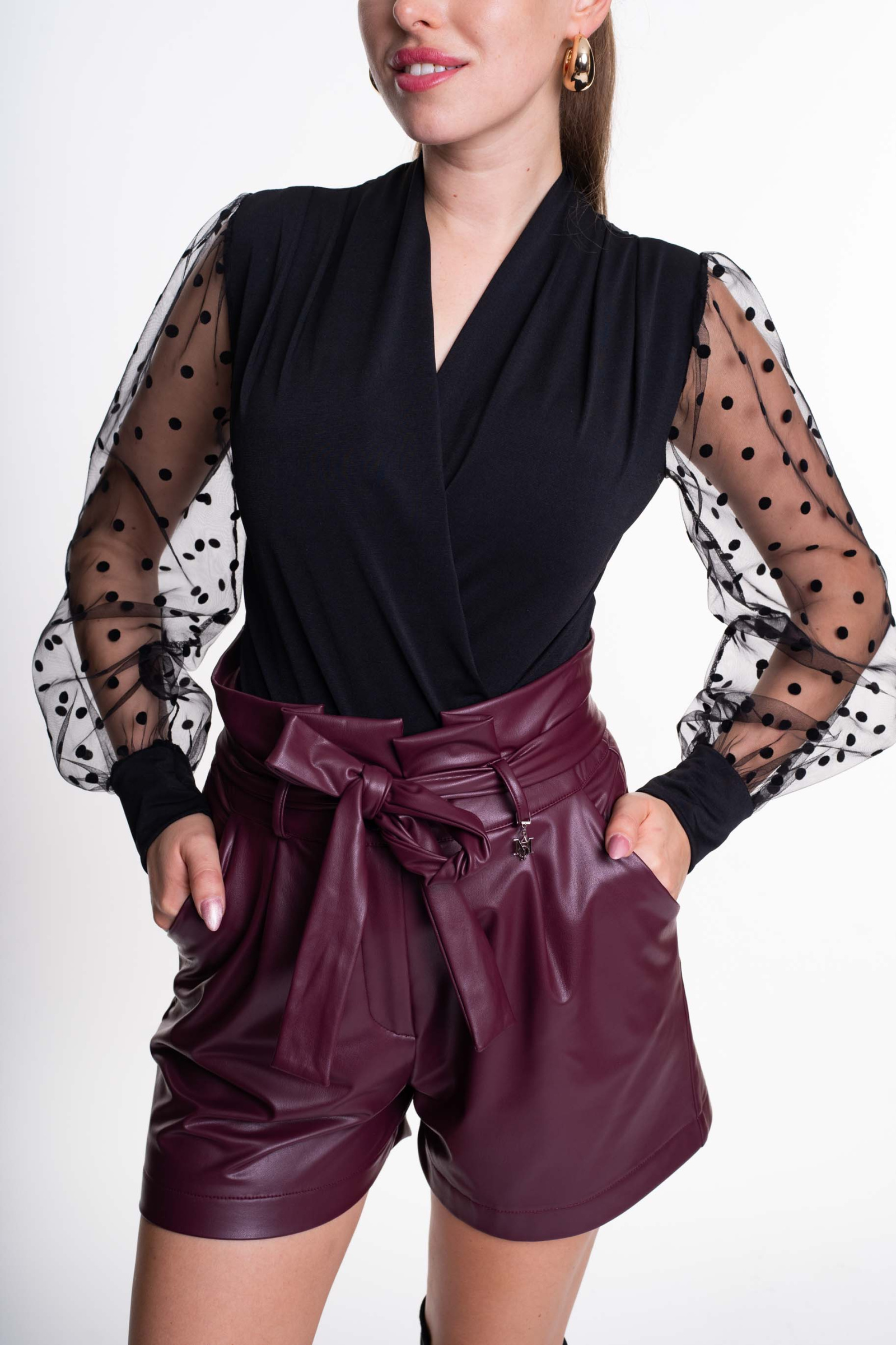 Elasztikus anyagból készült, mellrészen átlapolt body pöttyös necc anyagú ujjakkal, kis fém márkajelzéssel.