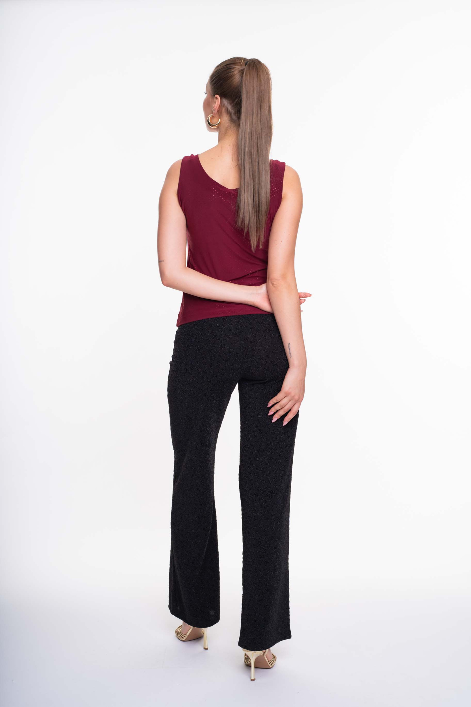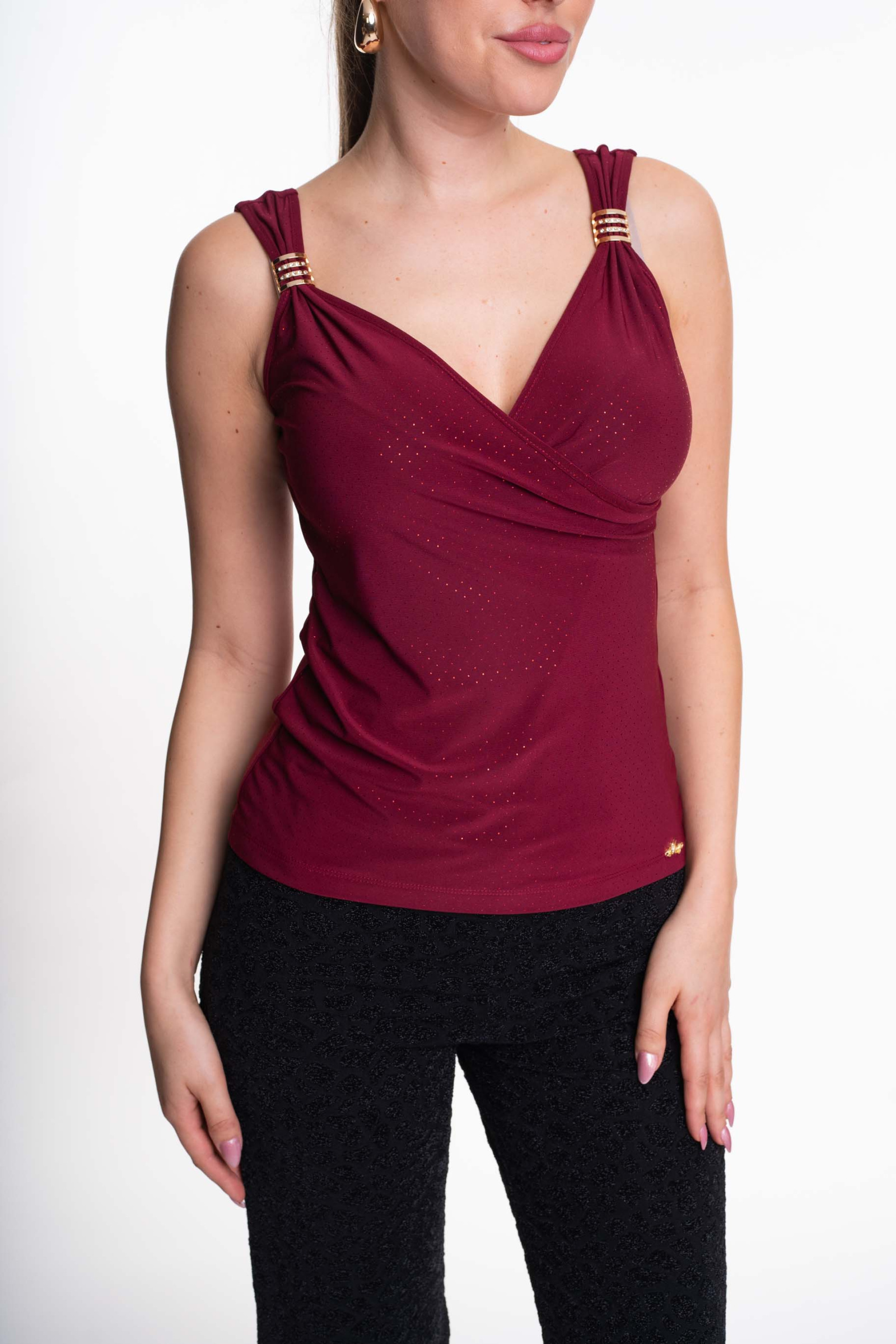 Elasztikus anyagból készült, karcsúsított fazonú felső, mellrészen átlapolt megoldással, kis fém márkajelzéssel.