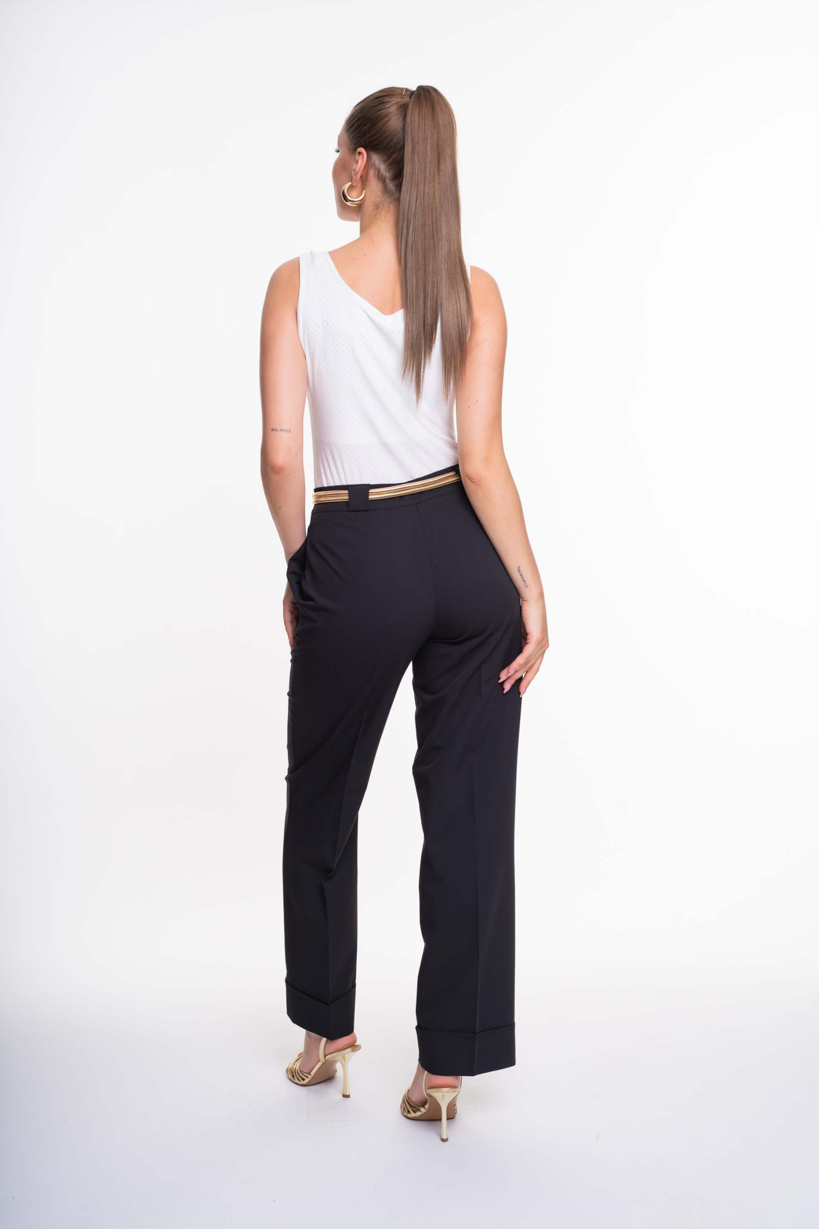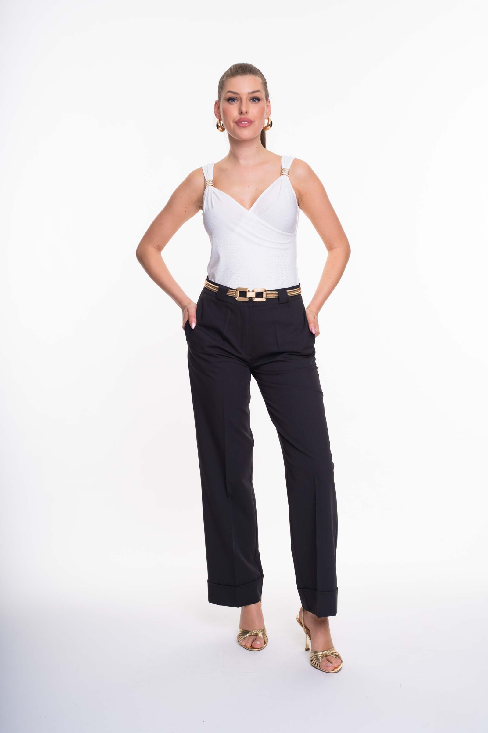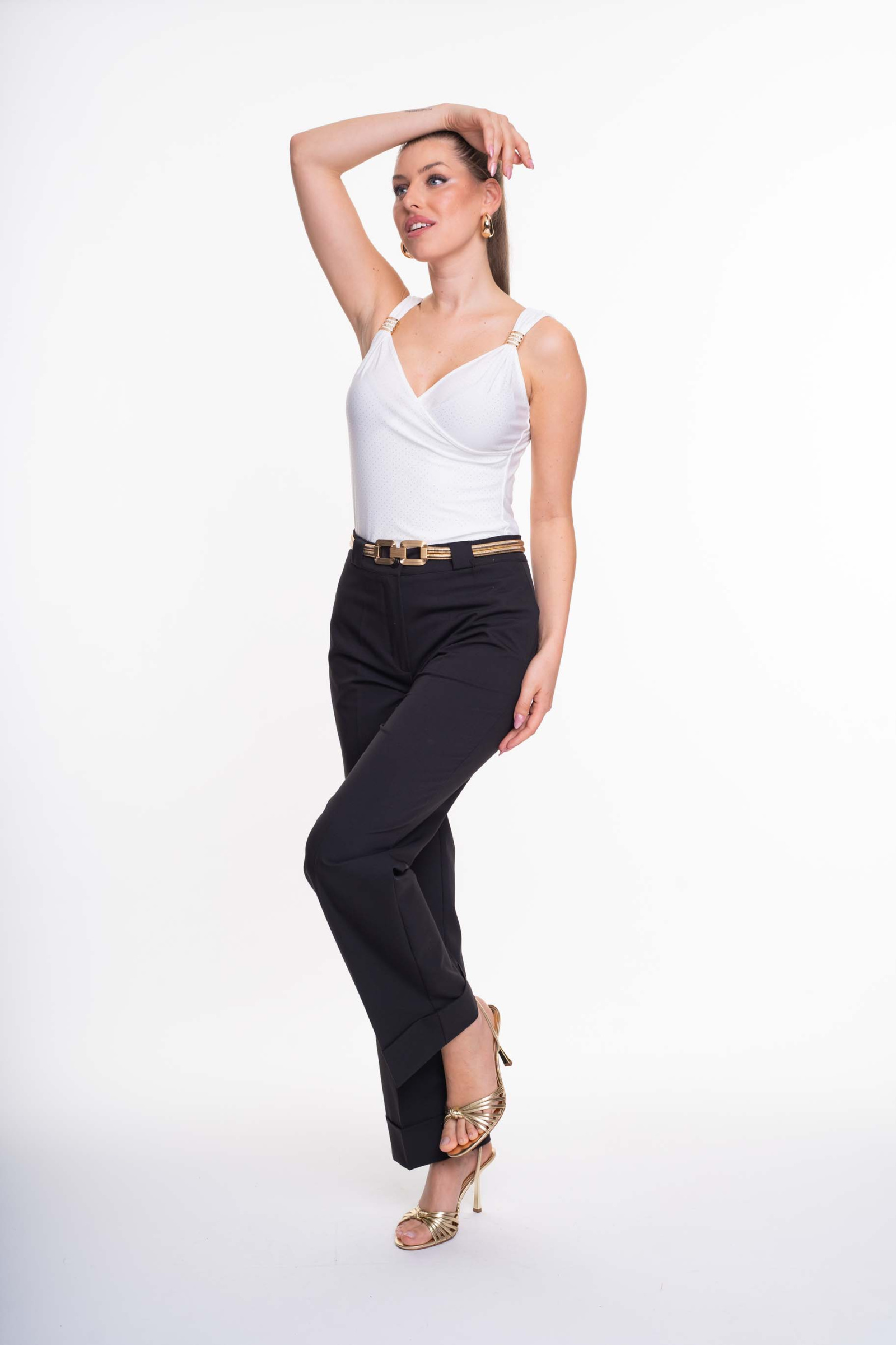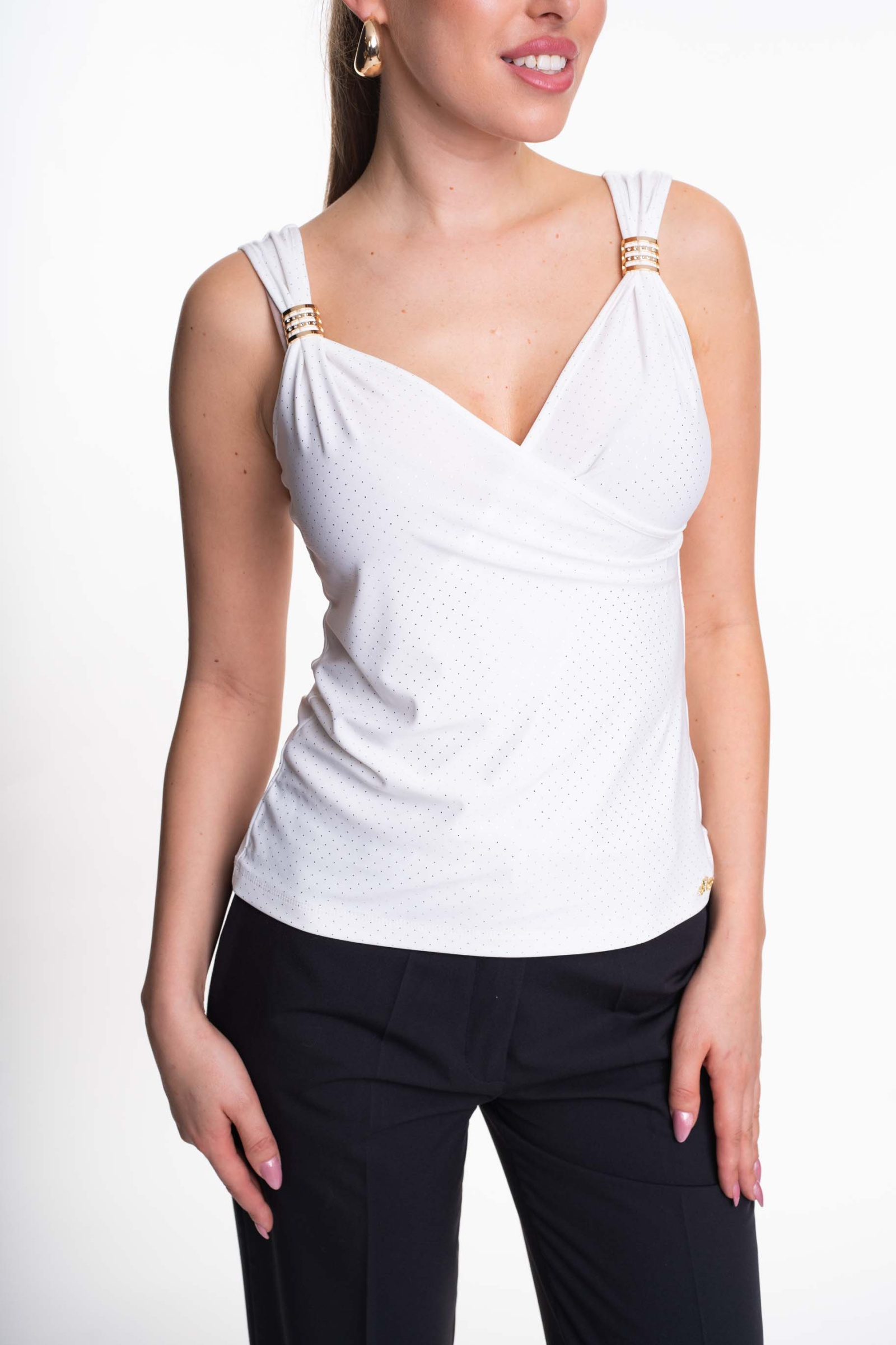 Elasztikus anyagból készült, karcsúsított fazonú felső, mellrészen átlapolt megoldással, kis fém márkajelzéssel.