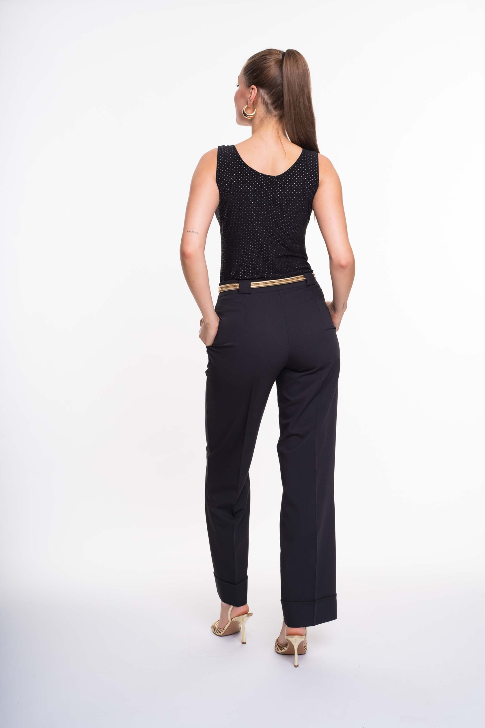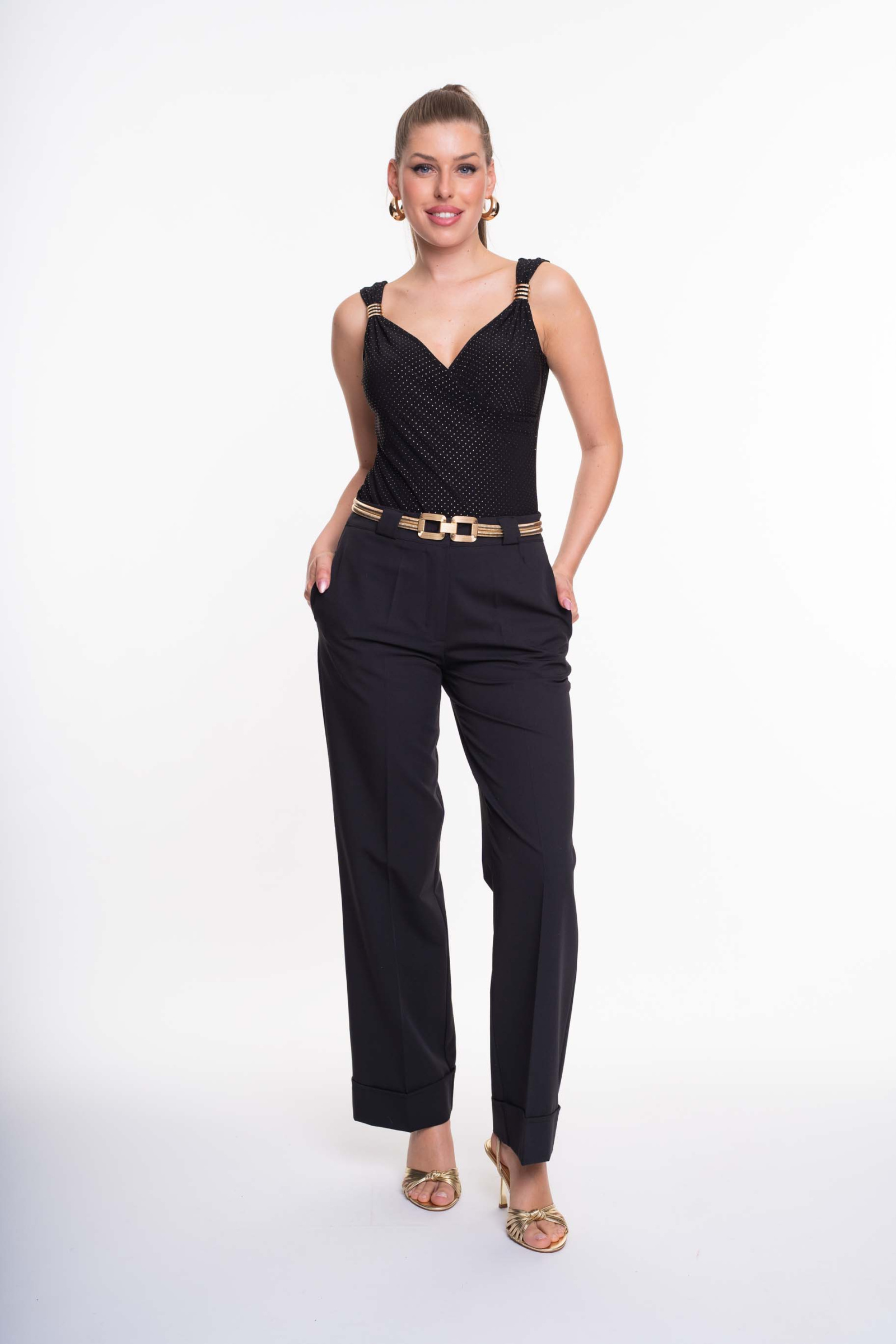 Elasztikus anyagból készült, karcsúsított fazonú felső, mellrészen átlapolt megoldással, kis fém márkajelzéssel.
